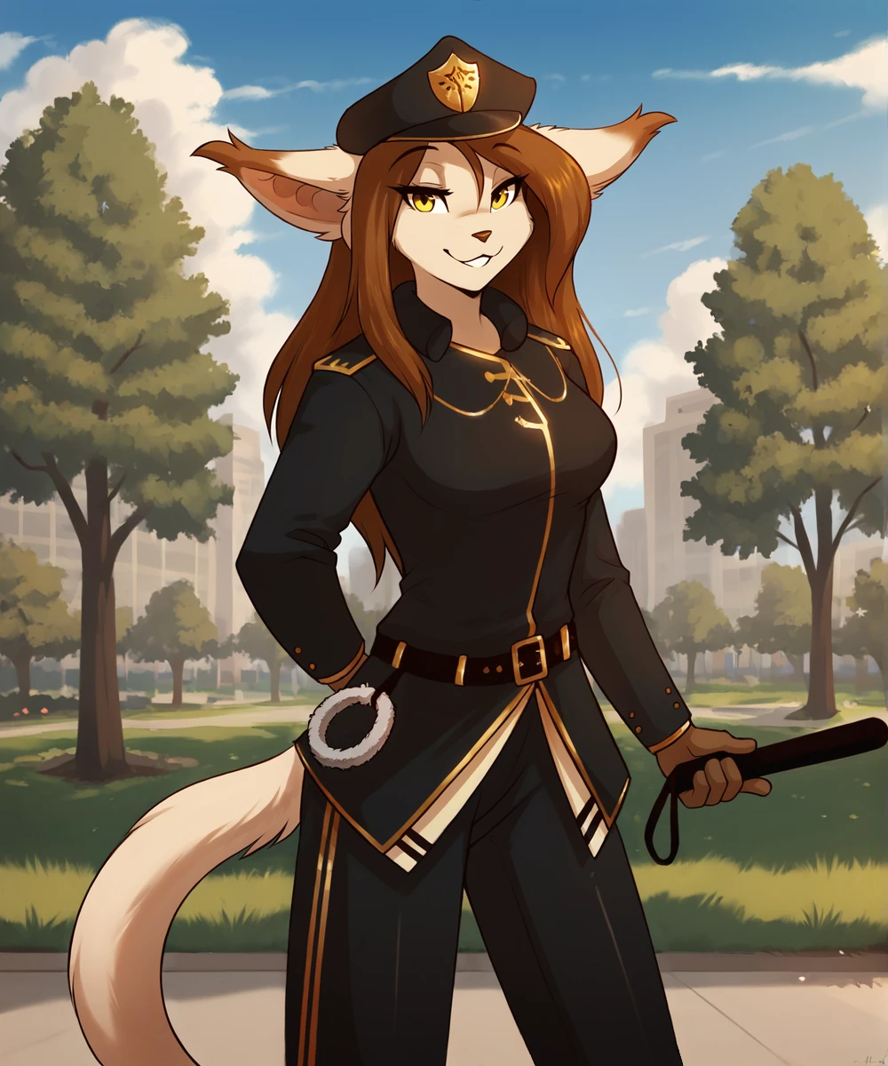Fact: Her police uniform can be generated with individual items of clothing (tags in sample image 2).