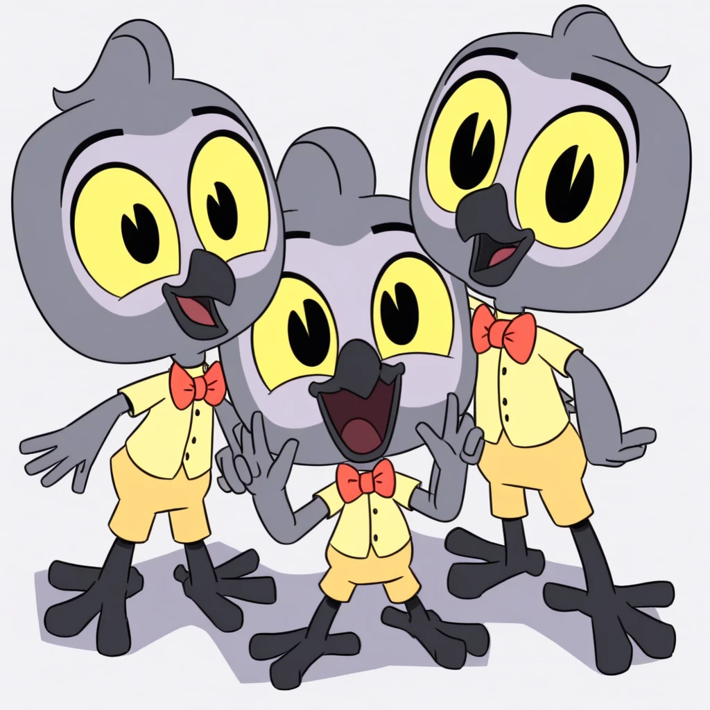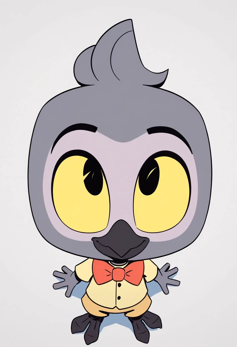 Boyd, b.o.y.d., parrot, grey fur, dark grey beak, dark grey legs, bird feet, hair tuft, yellow sclera, yellow shirt, dark yellow shorts, red bowtie, short