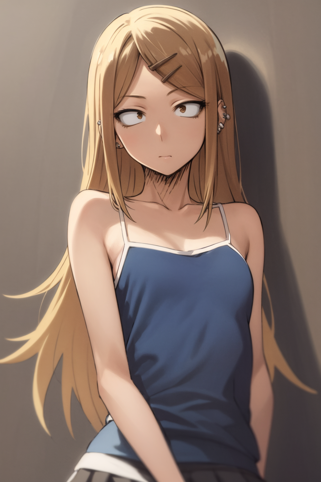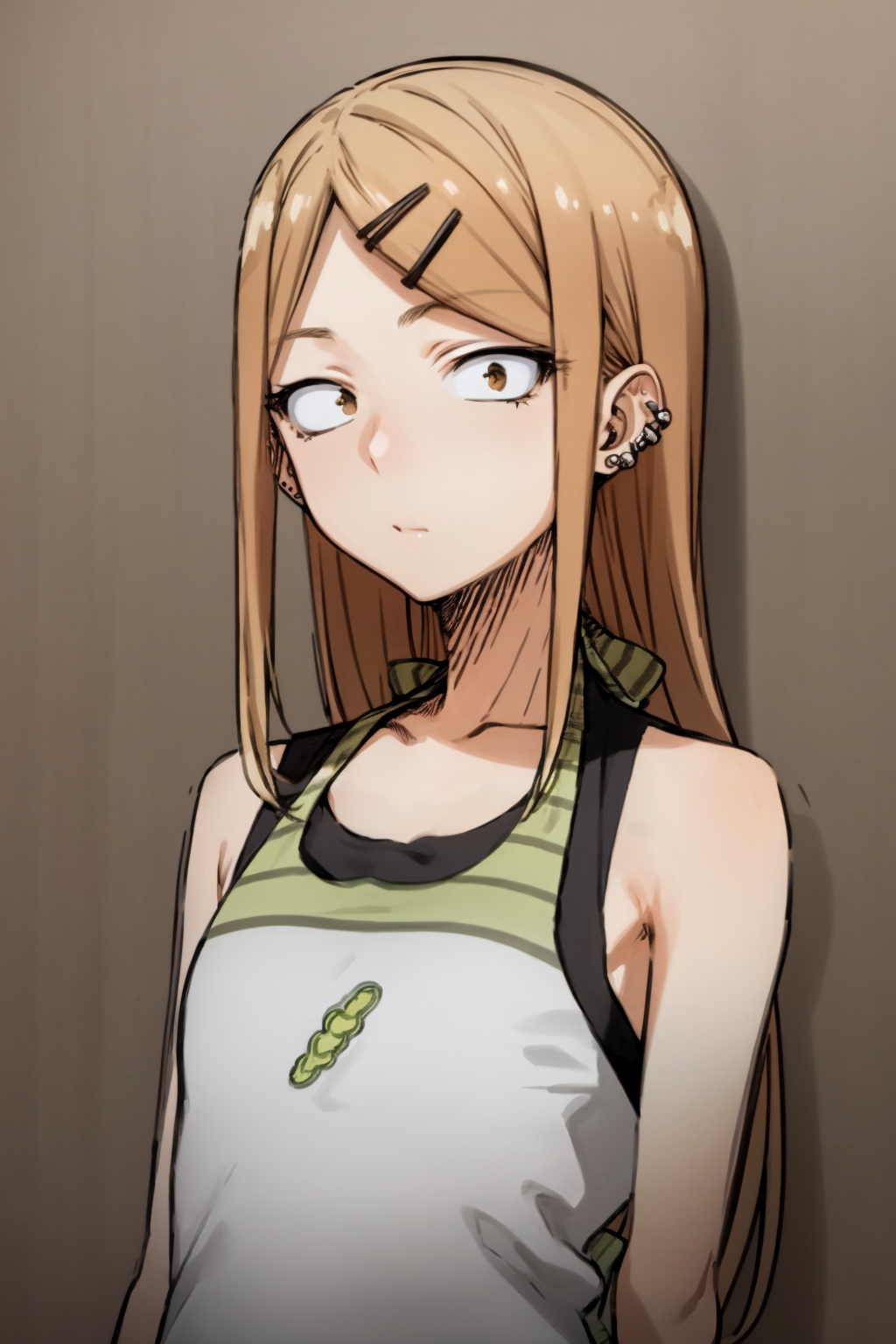Basic prompts : brown eyes, blonde hair, long hair, hairclip, ear piercing, sanpaku, open mouth, fang