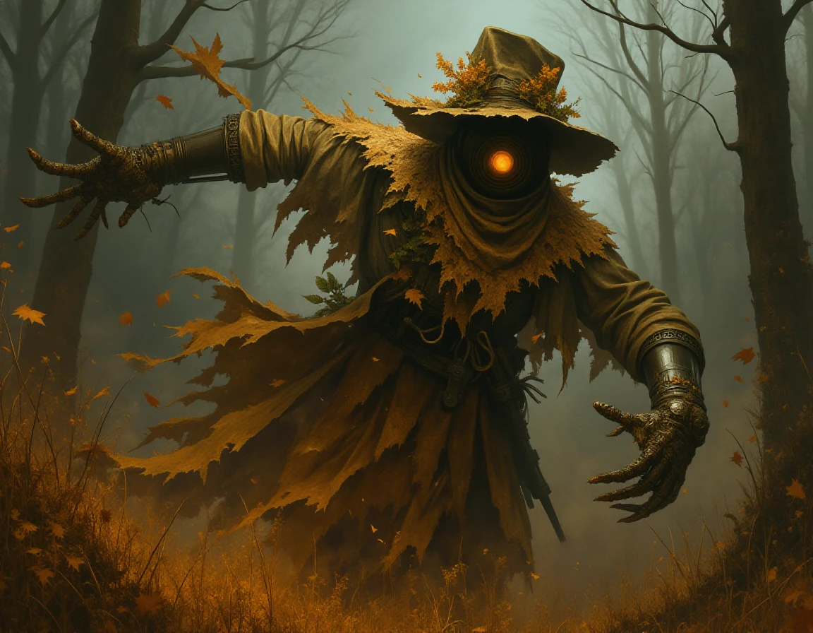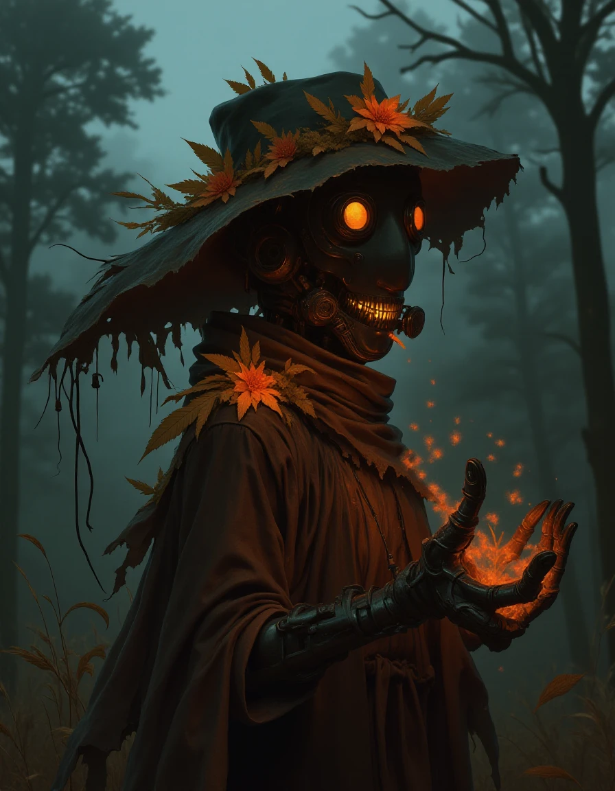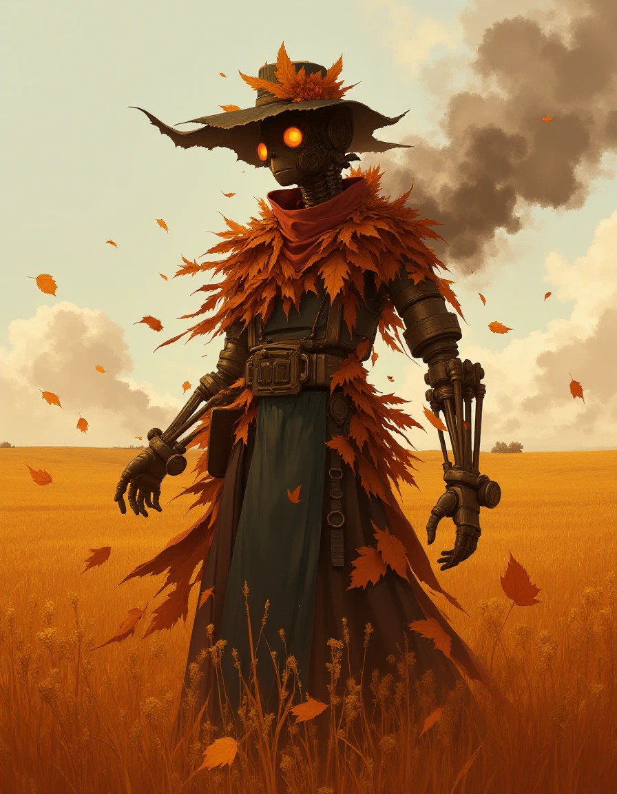 This concept takes the classic scarecrow and gives it a mechanical twist, merging steampunk aesthetics with the eerie charm of its rustic origins. With its patchwork metal plating, exposed gears, and glowing eyes powered by miniature engines, the Mecha Scarecrow stands as a haunting figure. Its design combines weathered burlap and tarnished brass with spindly, rusted limbs, evoking both menace and artistry. While its purpose might be to ward off threats, the unsettling blend of machine and scarecrow gives it a life-like quality, making it a natural fit for dark fantasy or horror themes. A crooked, gear-laden hat and metallic claws complete its ominous silhouette, ensuring it catches the eye on any scene it inhabits.