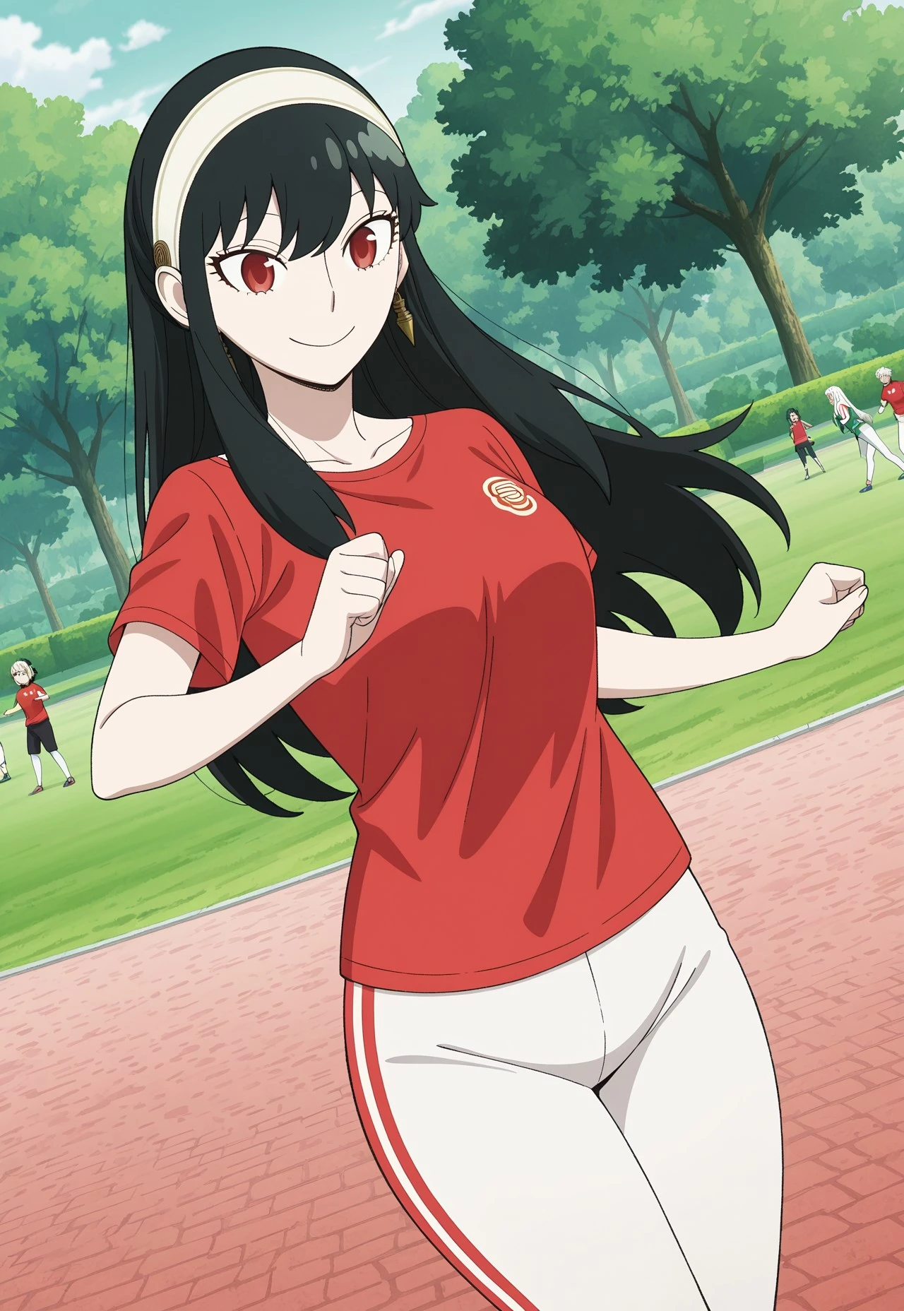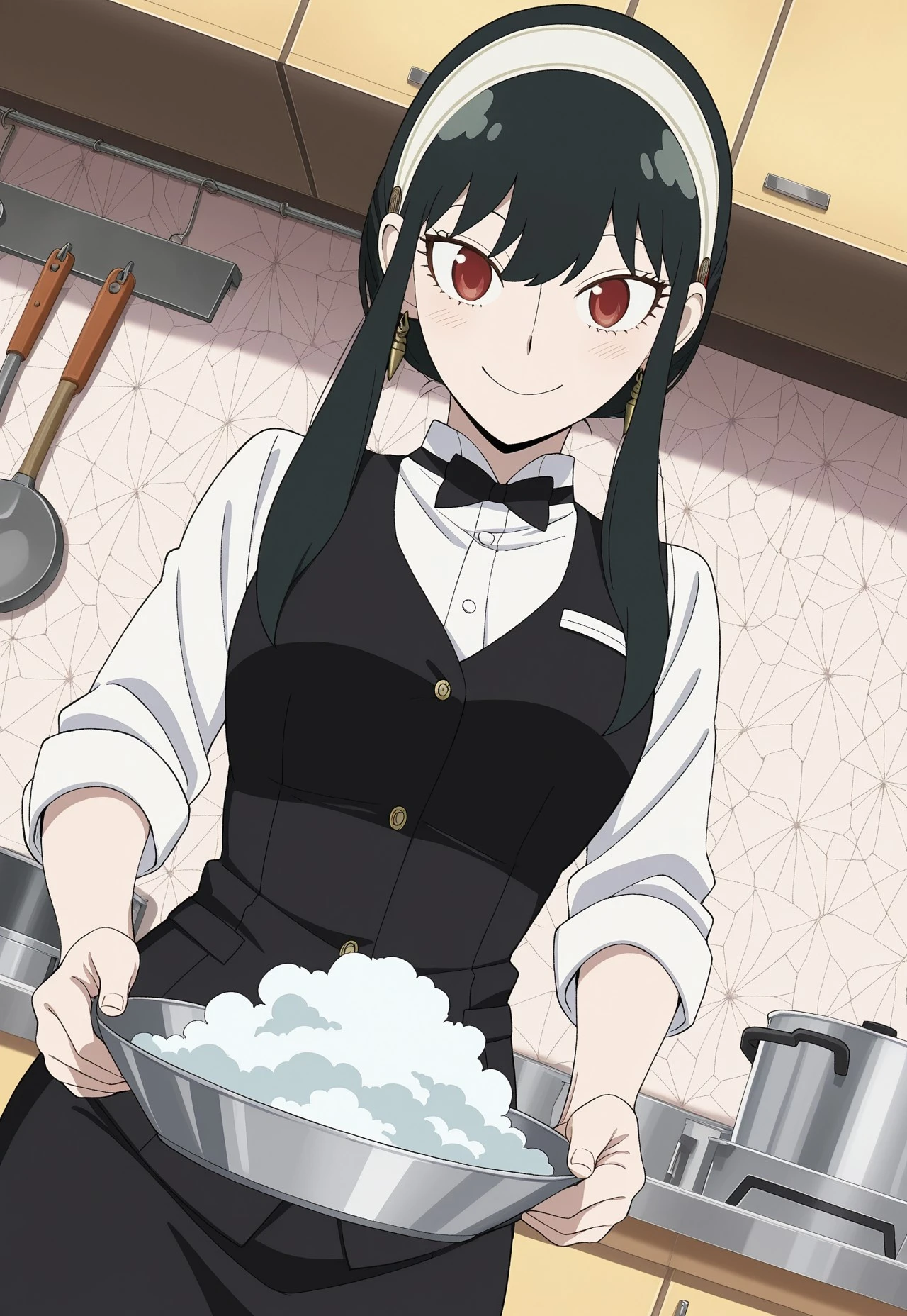Masterpiece, best quality, offical art, source_anime, anime:spy_x_family, anime_screenSnap, <lora:yor-forger-spy-x-family:0.65>, 1girl, black hair, long hair, red eyes, white hair band, red sweater, dynamic pose, hands Fingers intertwined in harmony, indoors, smile, looking at viewer, dutch angle, cowboy shot