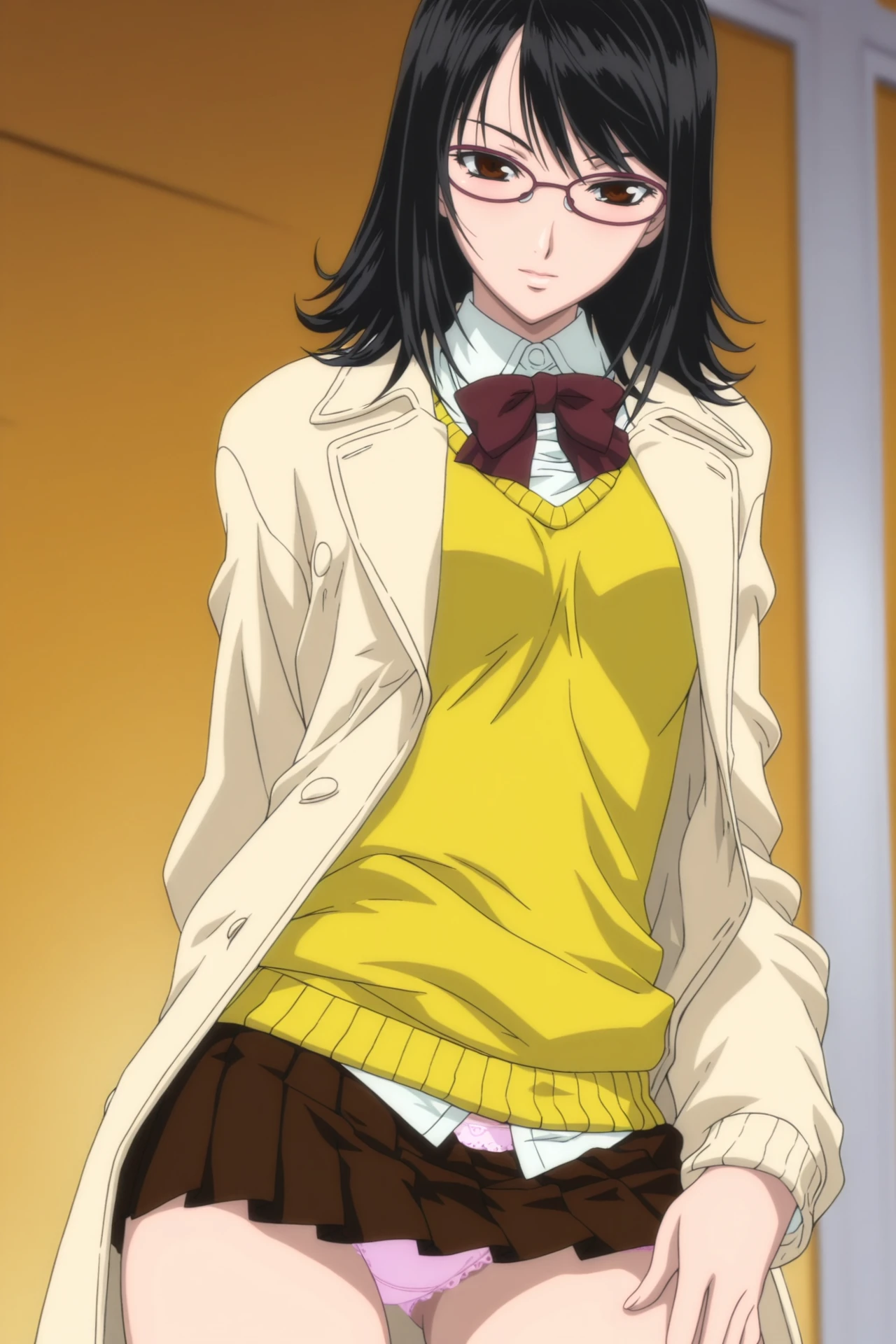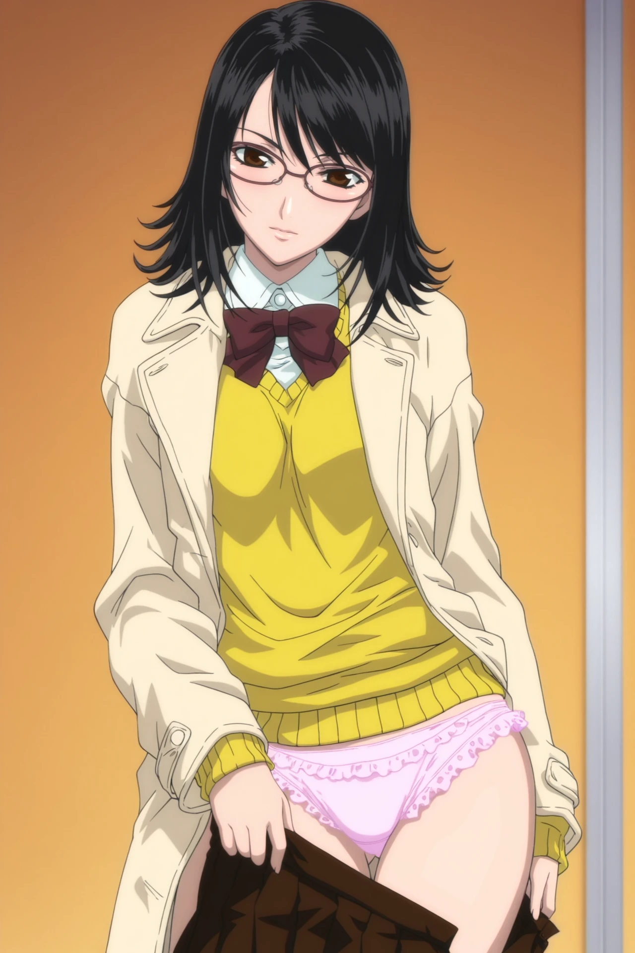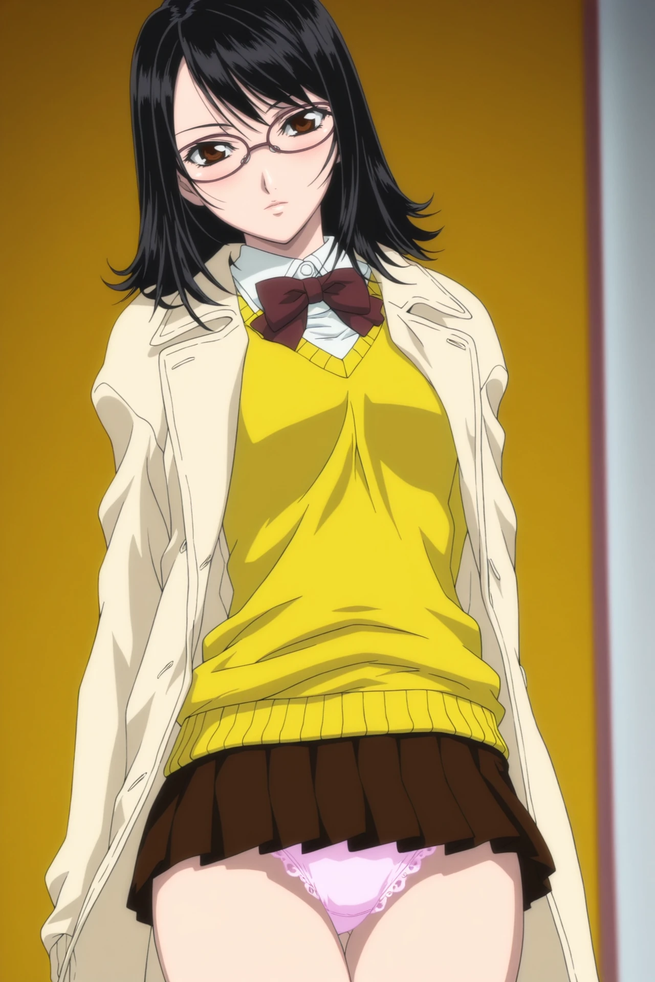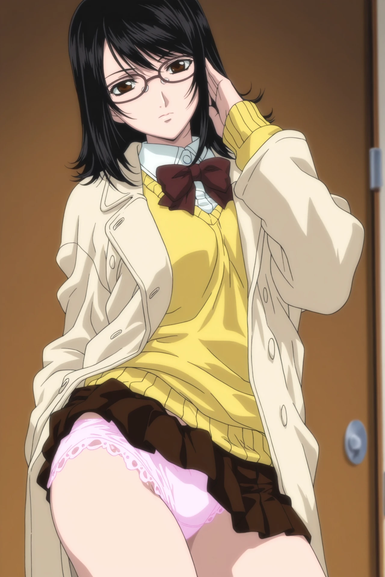 megane_shoujo, 1girl, solo, skirt, sweater, long sleeves, school uniform, black hair, brown skirt, underwear, panties, pink panties, glasses, brown eyes, lace trim, lace, lace-trimmed panties, cardigan, shirt, bowtie, miniskirt, pleated skirt, medium hair, frilled panties, white shirt, collared shirt, yellow sweater,