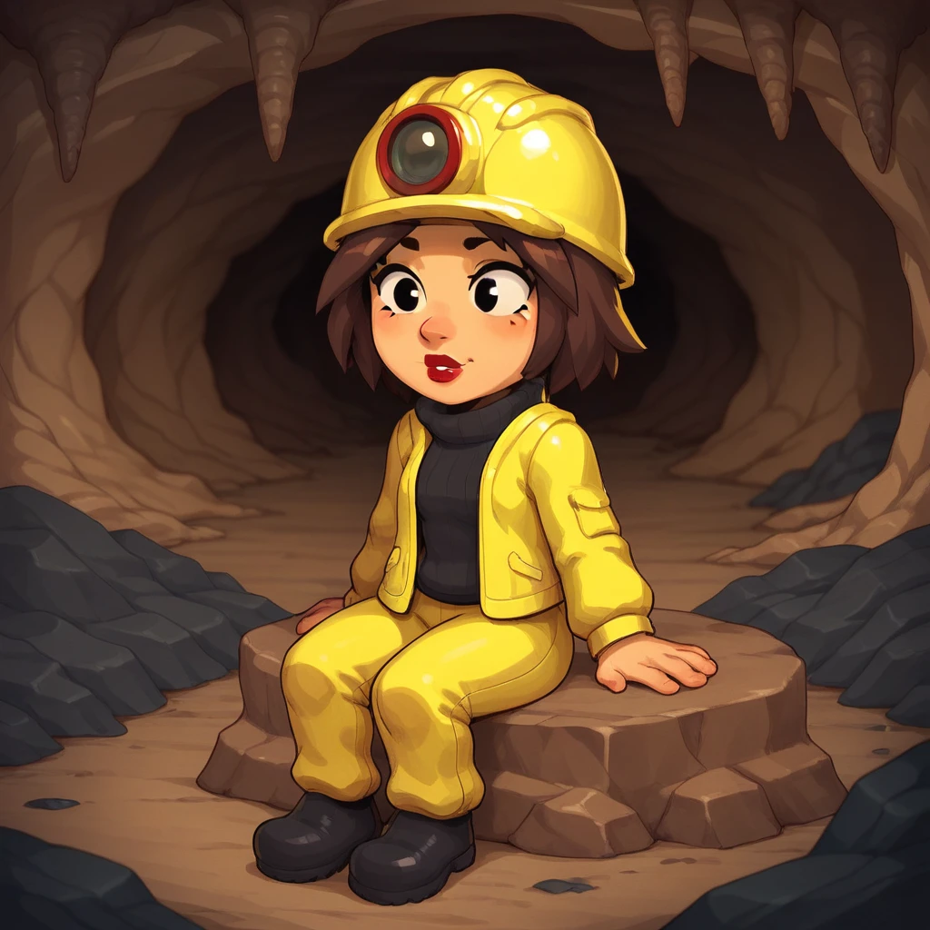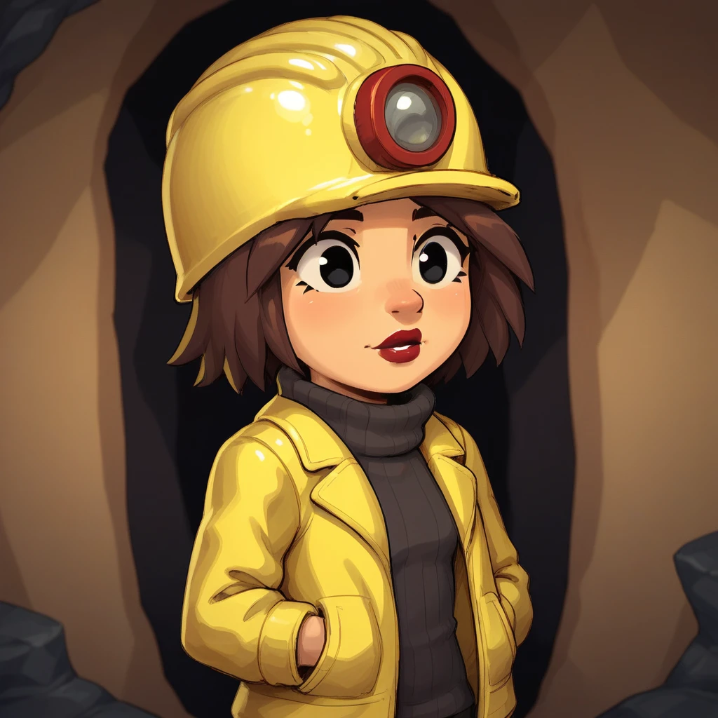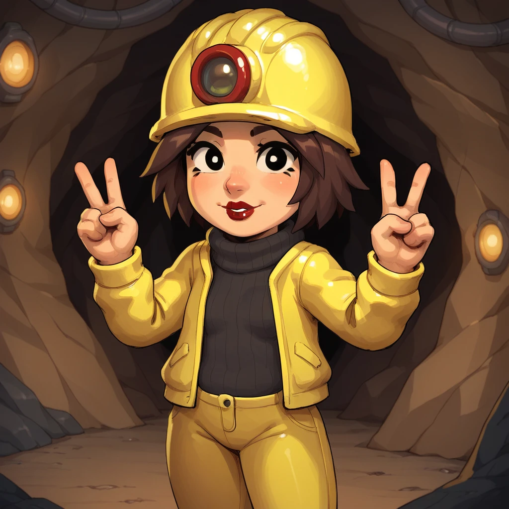 TinaFlan, 1girl, solo, brown hair, short hair, black eyes, yellow helmet,