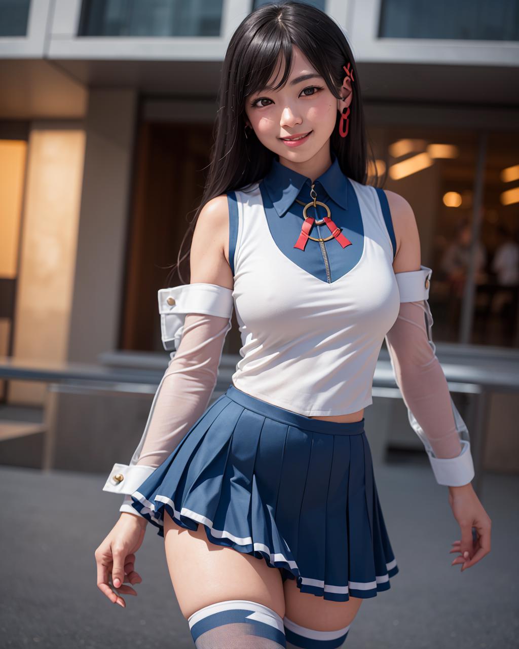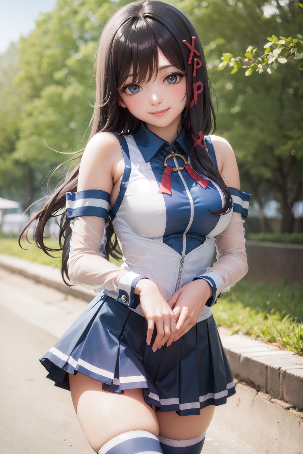 Default Outfit: detached sleeves, blue skirt, thighhighs
