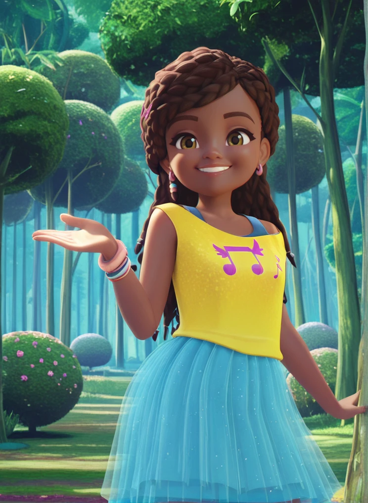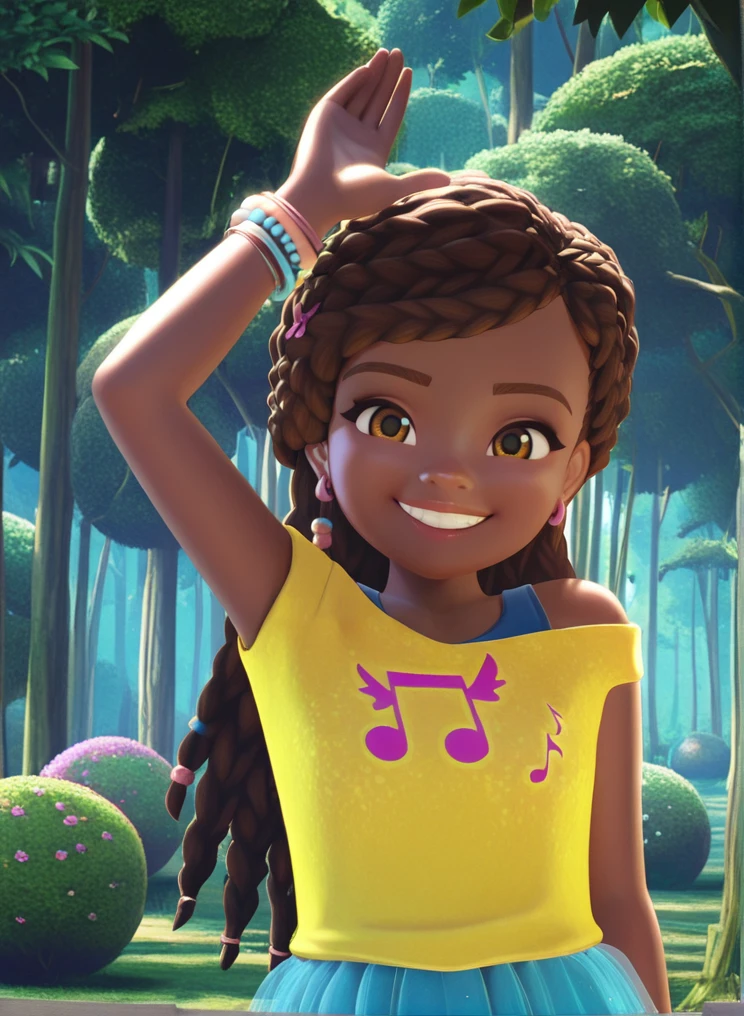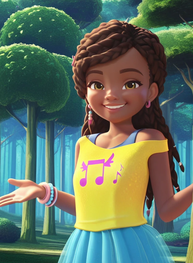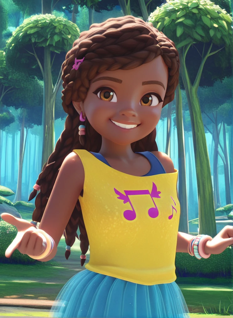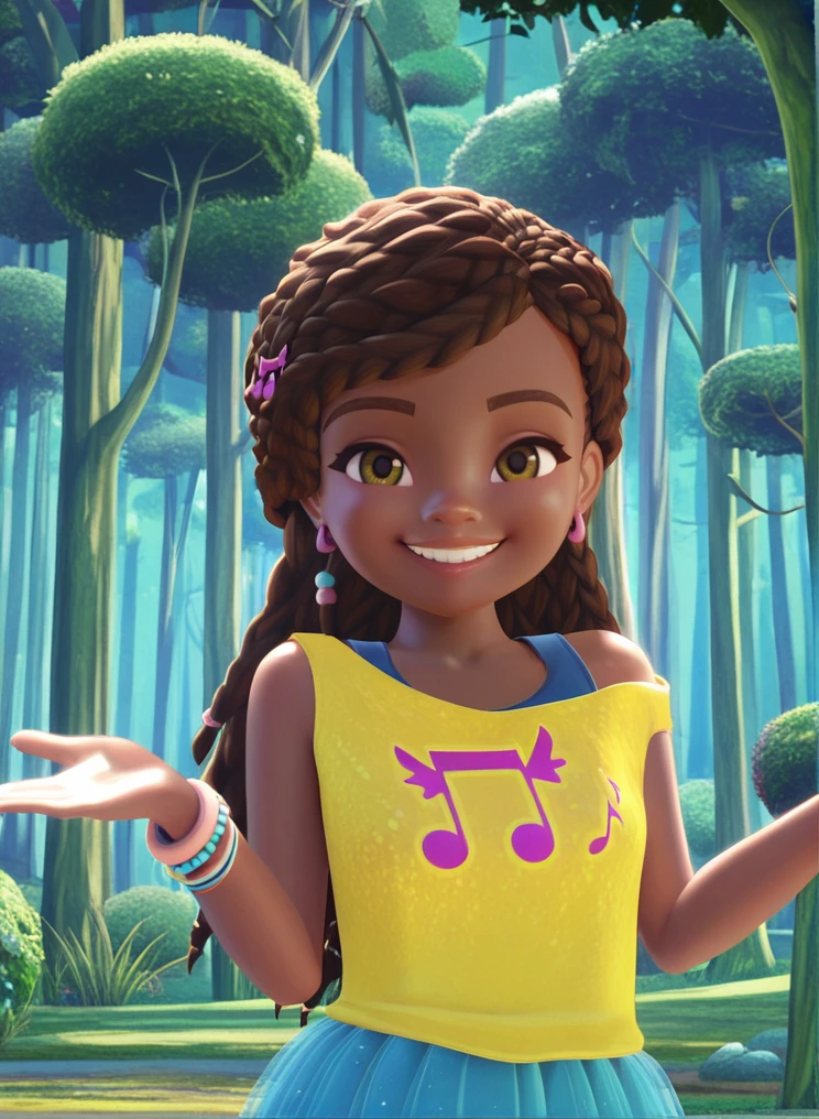 skirt, blue skirt, yellow shirt, musical note, jewelry, bracelet, earrings,