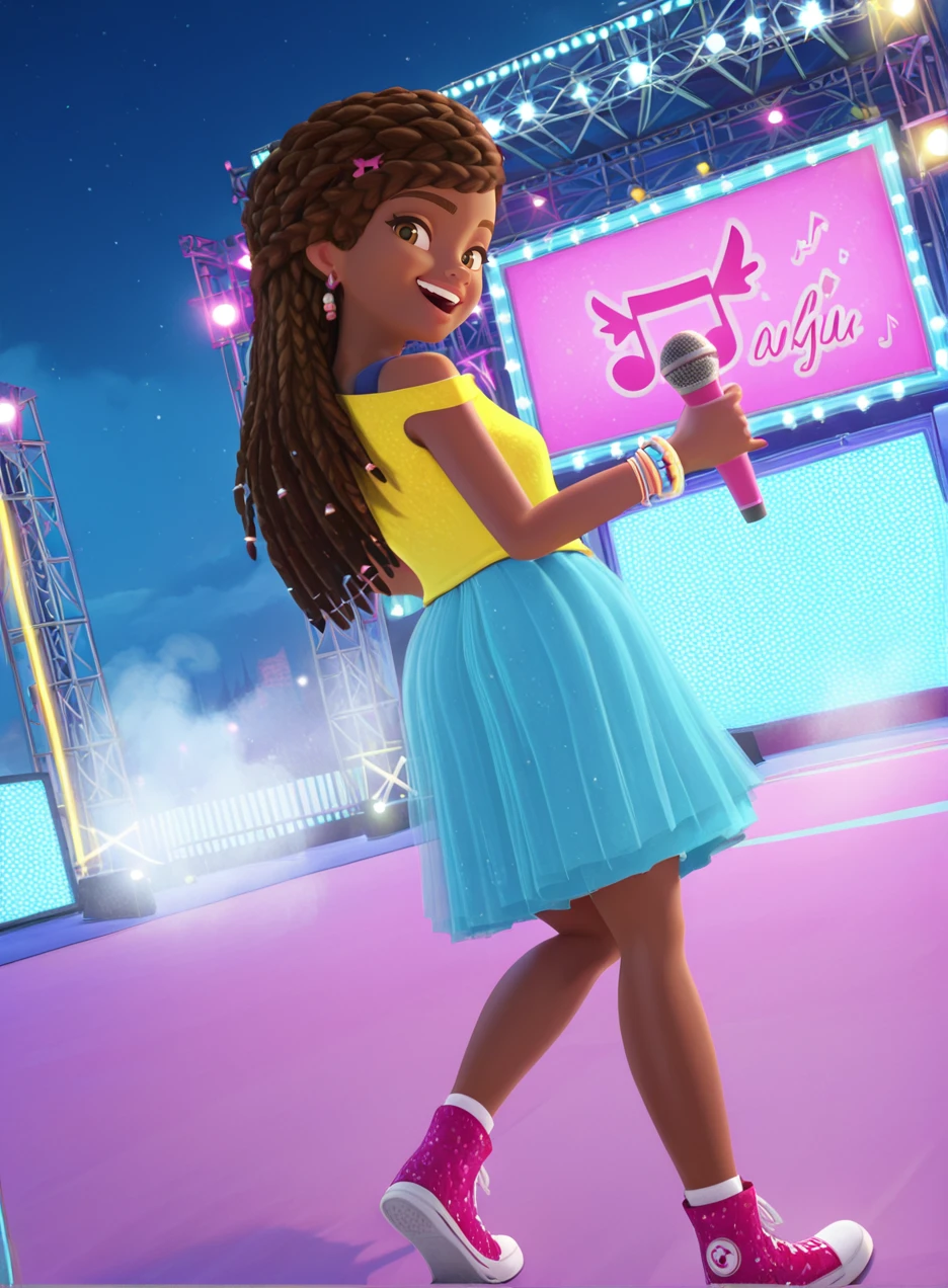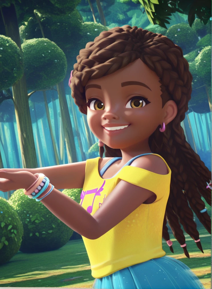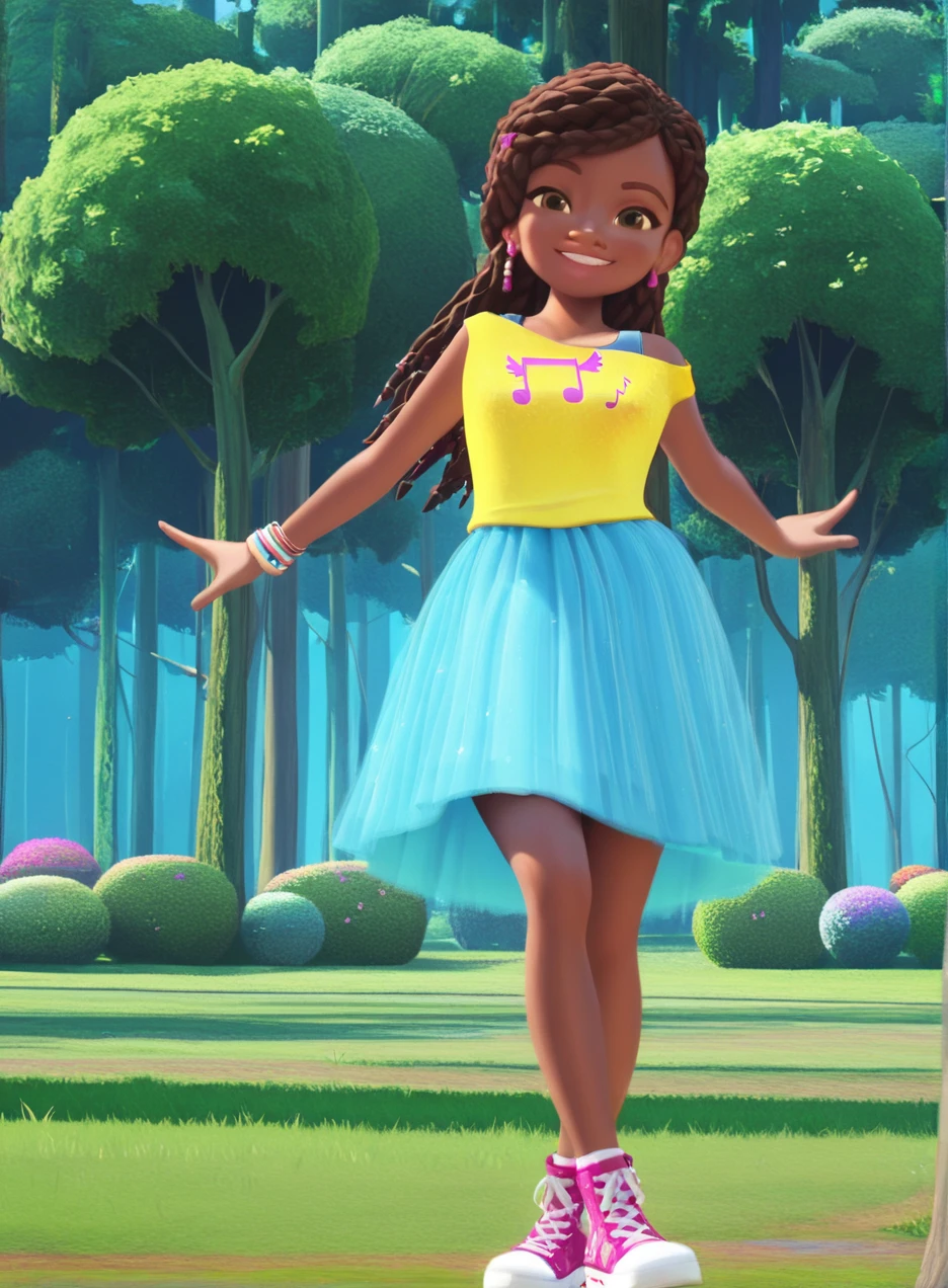 skirt, blue skirt, yellow shirt, musical note, jewelry, bracelet, earrings,