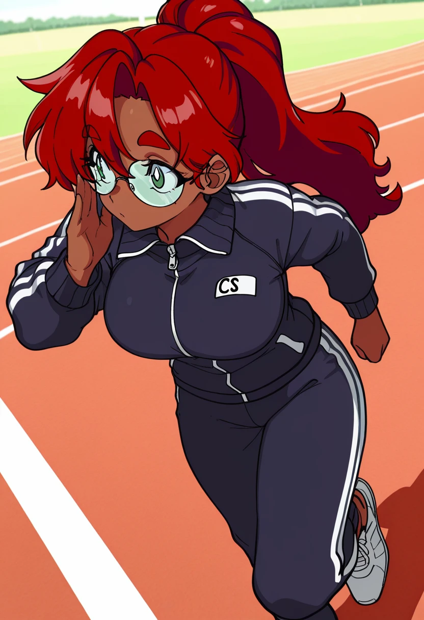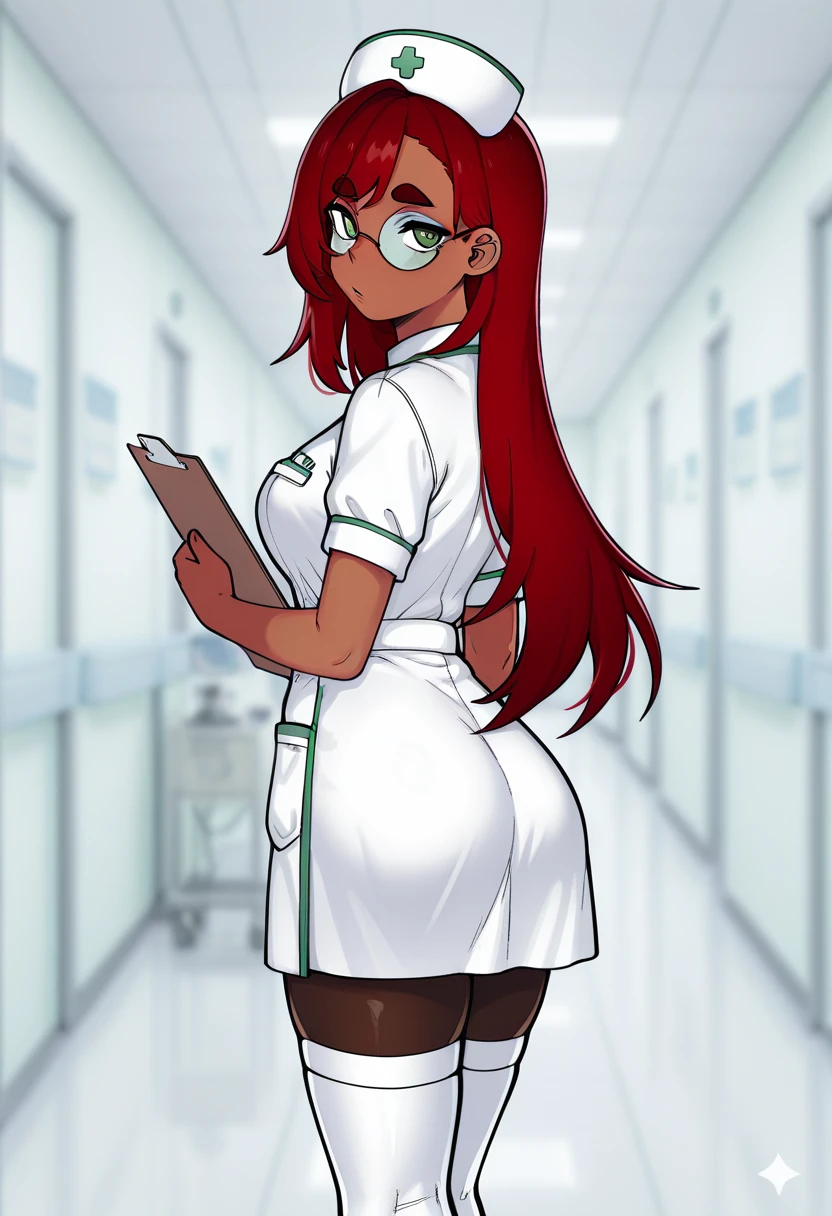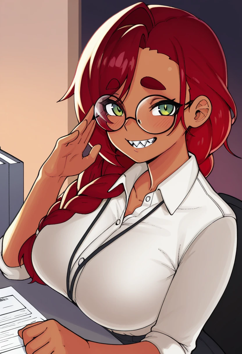 green eyes, red hair, long hair, dark-skinned female, large breasts, thick eyebrows,