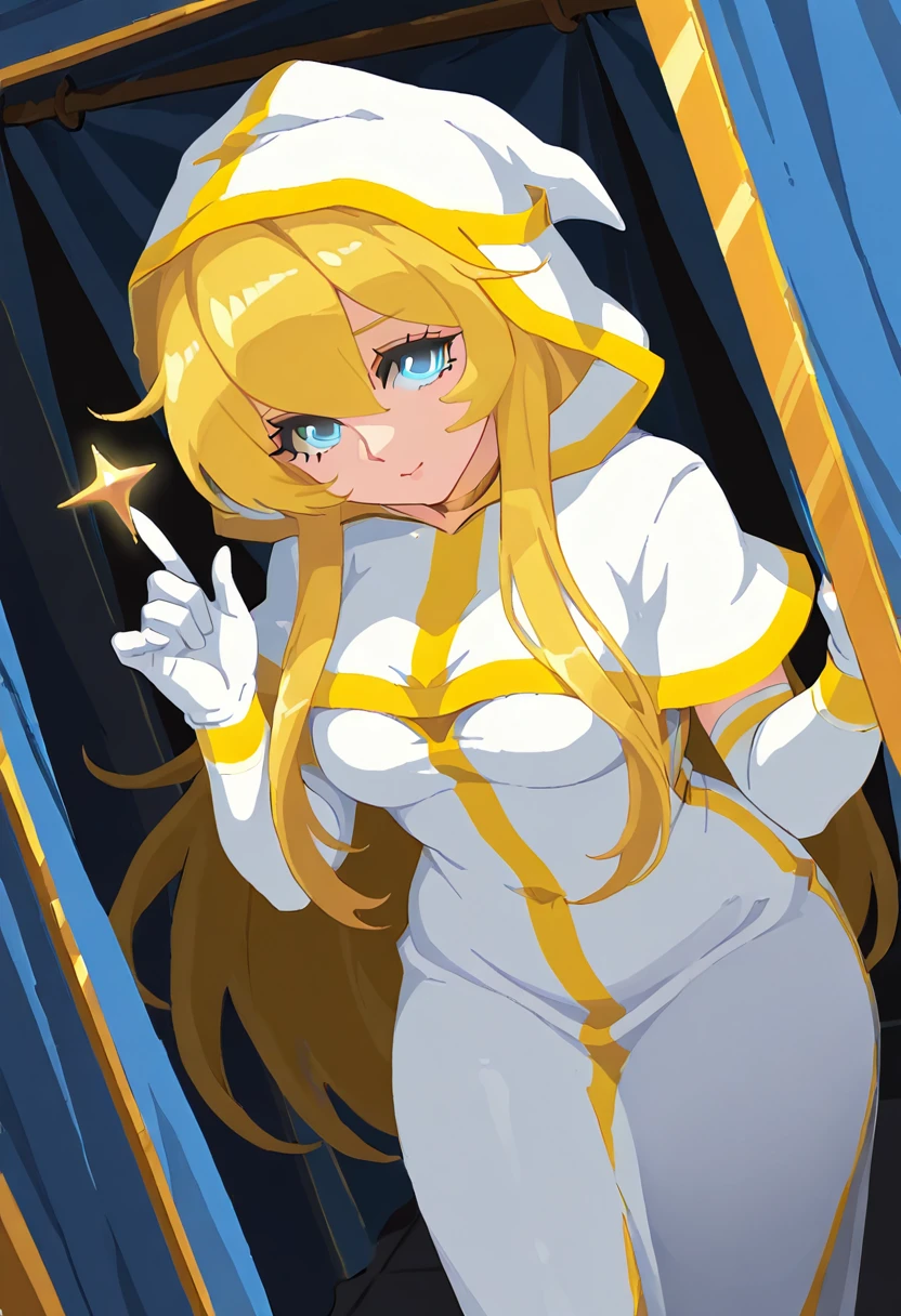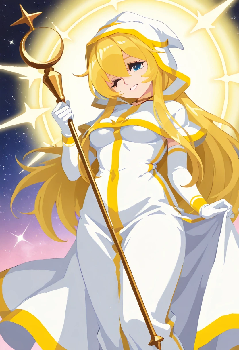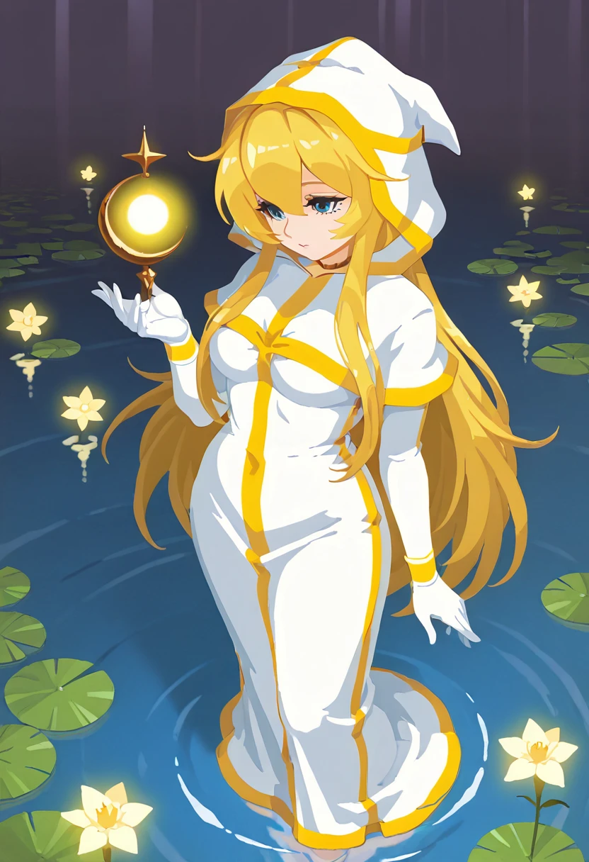 Clothing Prompts: white robe, gold trim, hood up, gold choker, elbow gloves, holding staff