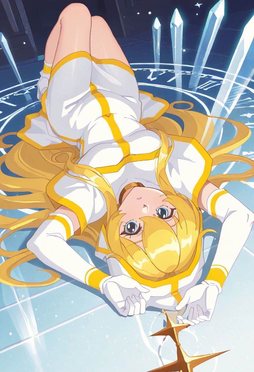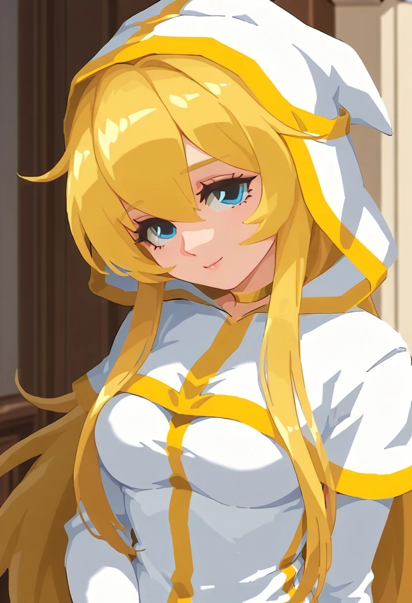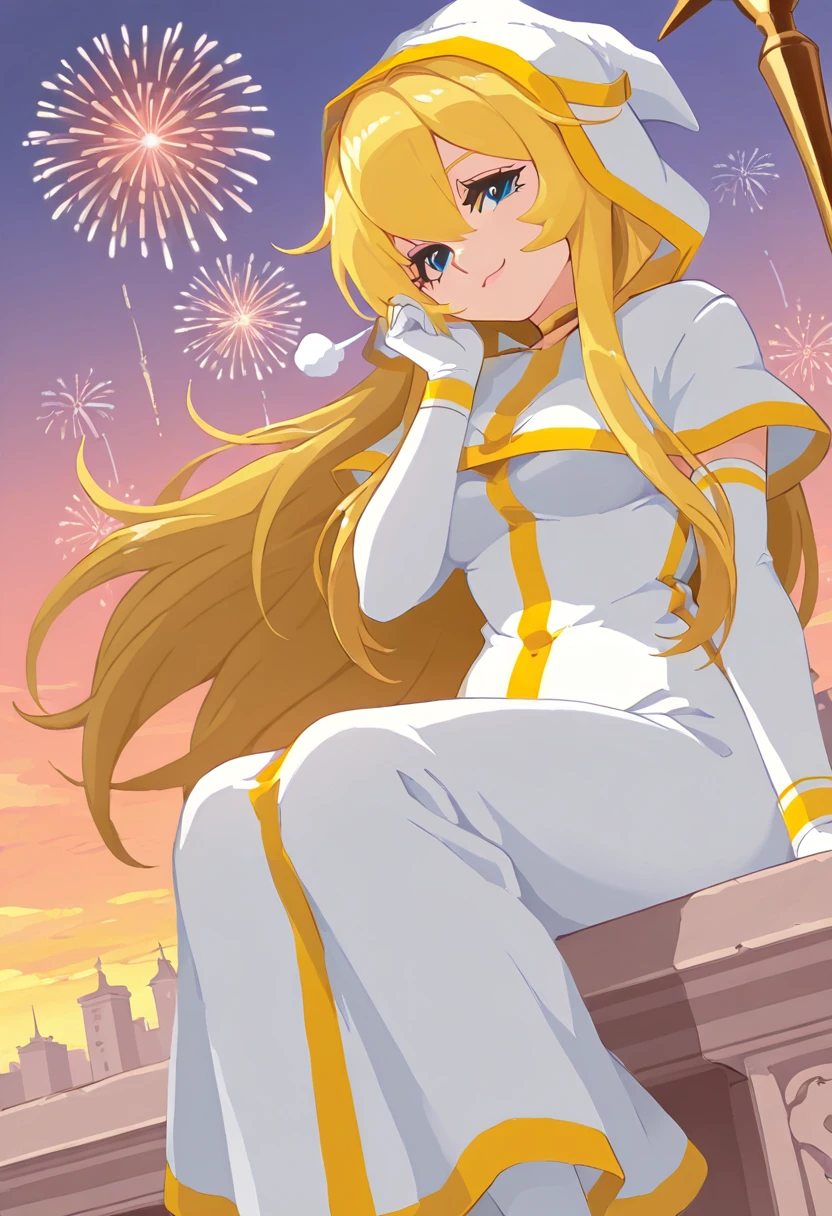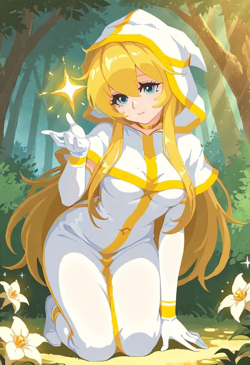 Clothing Prompts: white robe, gold trim, hood up, gold choker, elbow gloves, holding staff