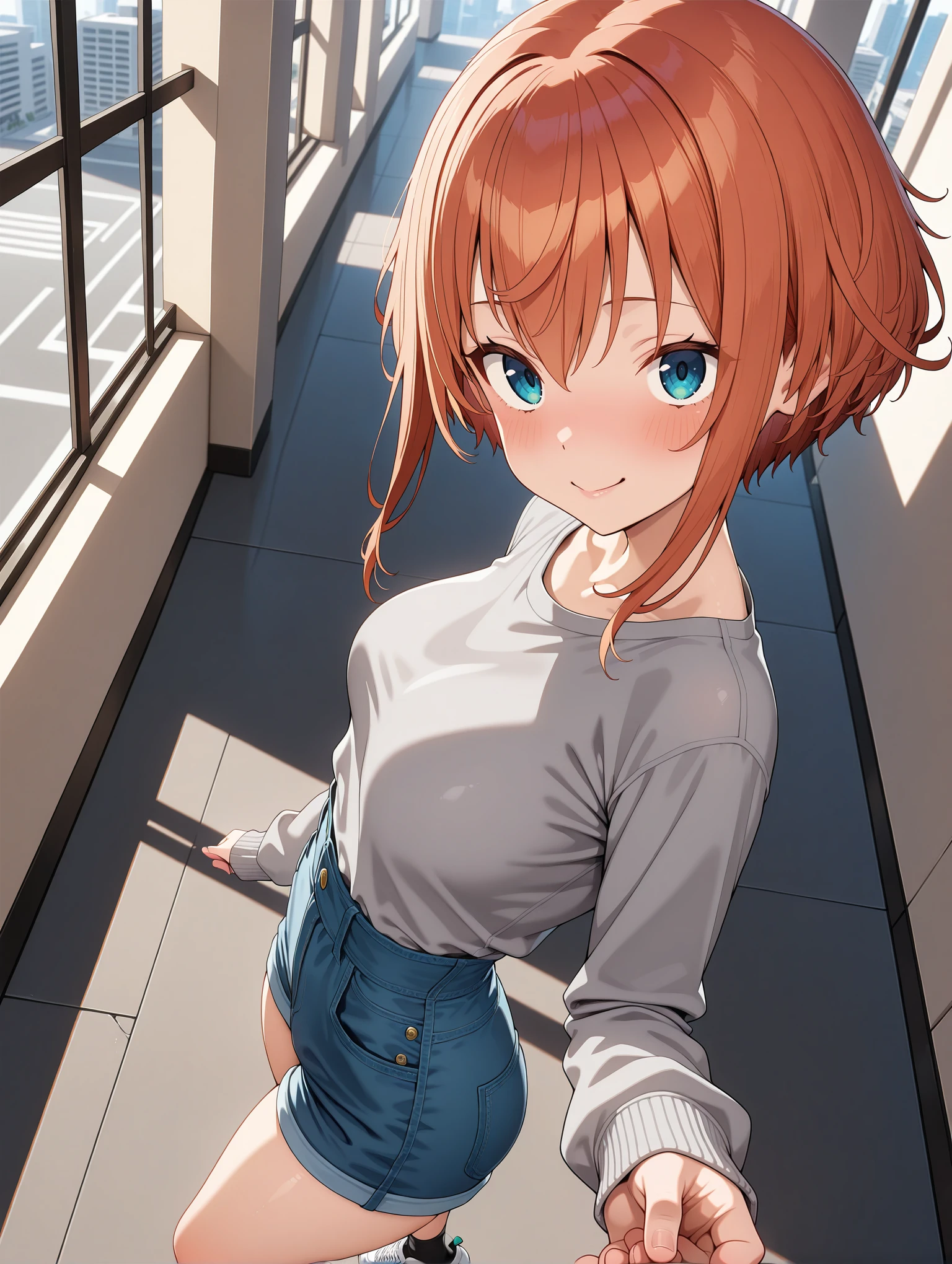 imagine,gray hoody,sleeves past wrists,high-waist denim shorts,black socks,sneakers,