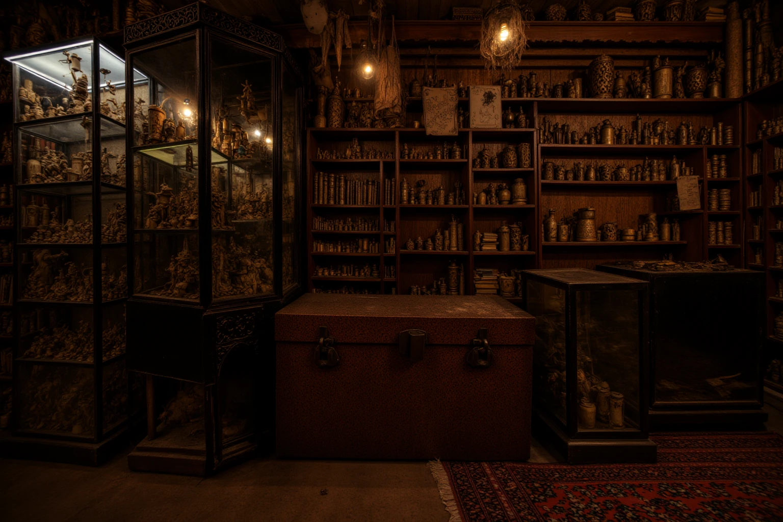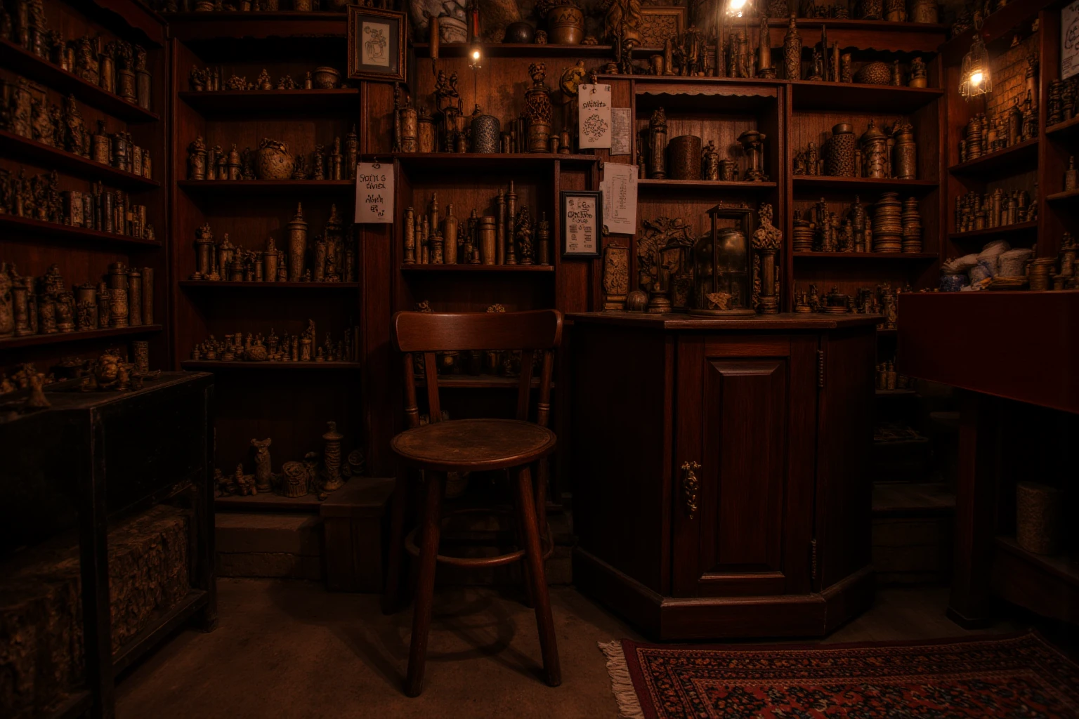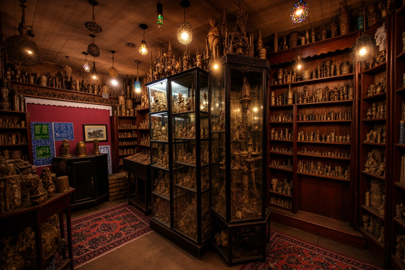 Antique Curiosity Shop, a dimly lit antique interior densely packed with carved wooden artifacts and folk sculptures. Floor-to-ceiling dark aged wooden shelves line the walls, filled with statuettes, figurines, books, and small handcrafted objects. Glass cabinets display miniature carvings and delicate curiosities. Warm lantern and bulb lighting cast a golden glow, creating deep shadows and emphasizing dense wood textures and tightly packed antique displays.