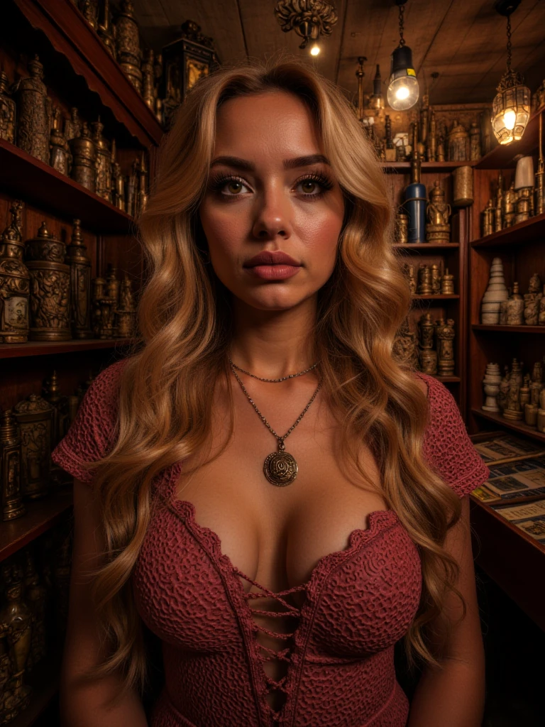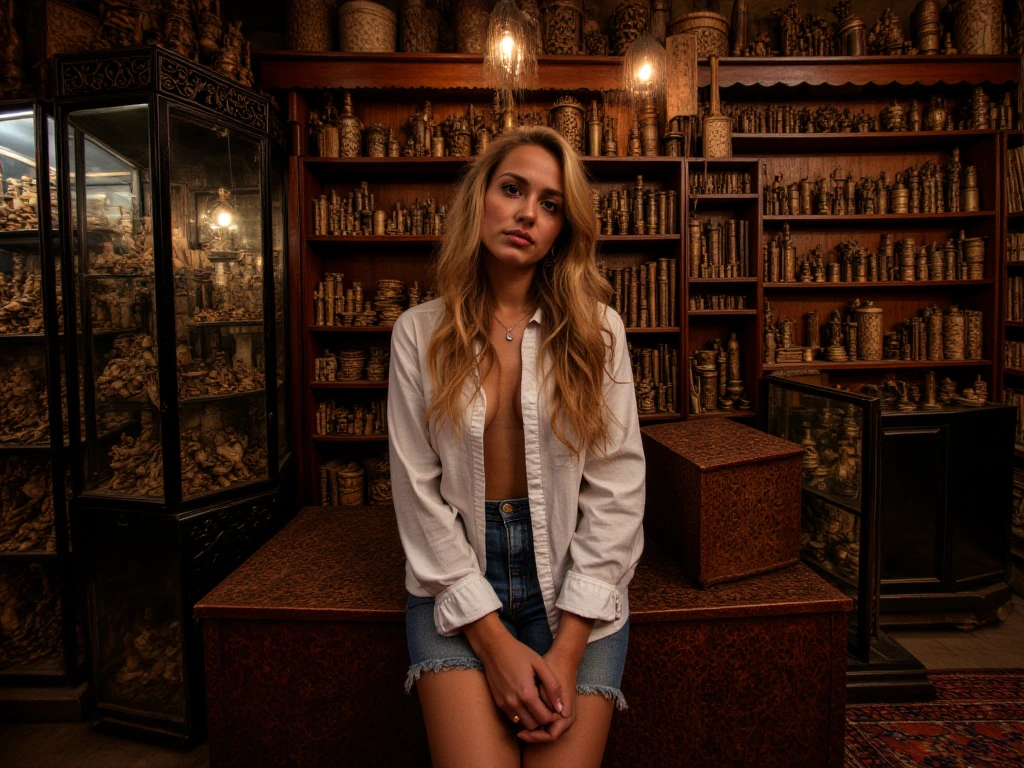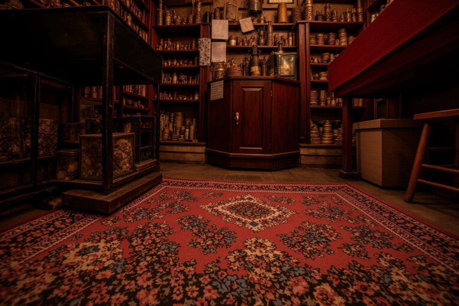 Antique Curiosity Shop, a dimly lit antique interior densely packed with carved wooden artifacts and folk sculptures. Floor-to-ceiling dark aged wooden shelves line the walls, filled with statuettes, figurines, books, and small handcrafted objects. Glass cabinets display miniature carvings and delicate curiosities. Warm lantern and bulb lighting cast a golden glow, creating deep shadows and emphasizing dense wood textures and tightly packed antique displays.