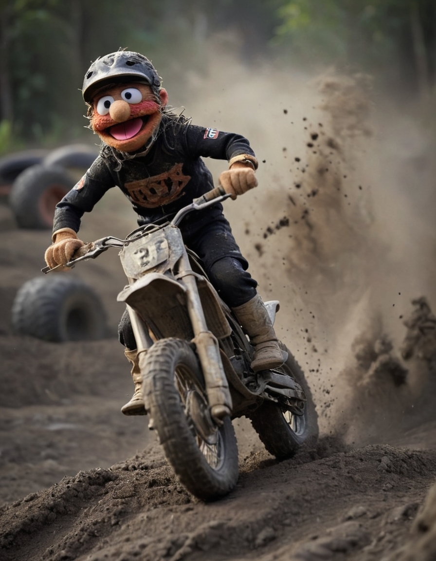 1. <lora:Felt-Puppet-base-v1:0.85> in a felt puppet world style, Motocross rider clearing a series of jumps, dirt clods flying from the tires.
