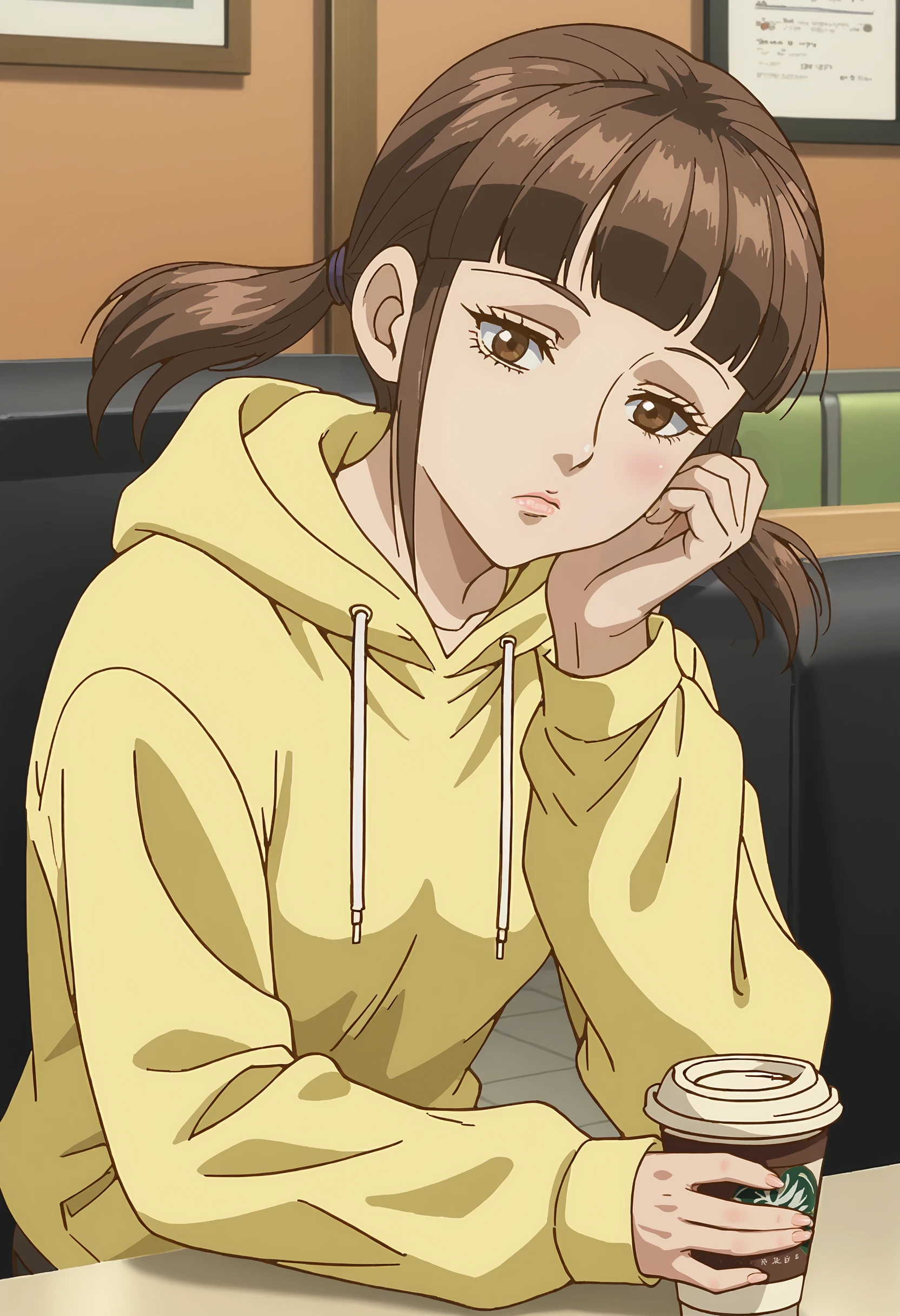 TrillionFutaba, brown hair, blunt bangs, short twintails, brown eyes