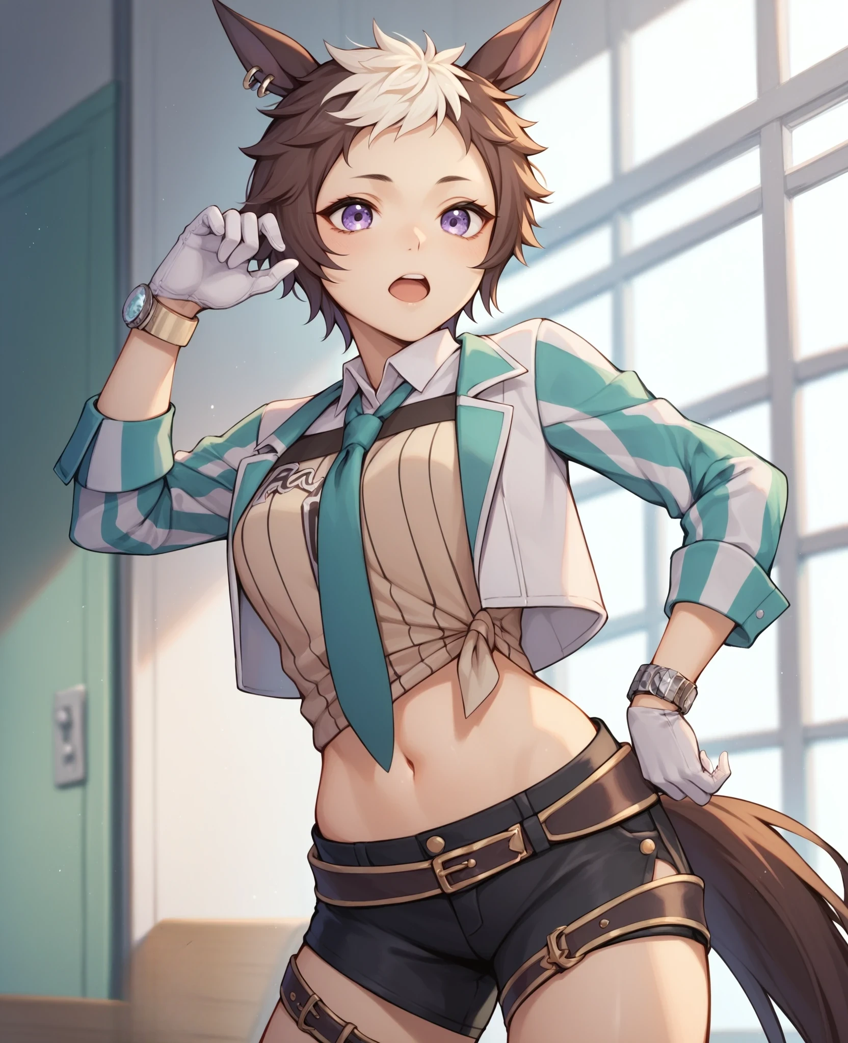 Appearance: Mej1roRy4n, 1girl, brown hair, horse girl, animal ears, horse ears, horse tail, short hair, two tone hair, purple eyes