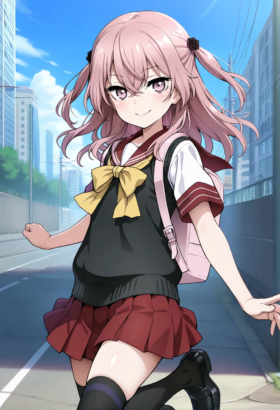 sajuna-schooluniform,inui sajuna,pink eyes,pink hair,two side up,hair flower,long hair,school uniform,red sailor collar,black sweater vest,red pleated skirt,black thighhighs,black footwear