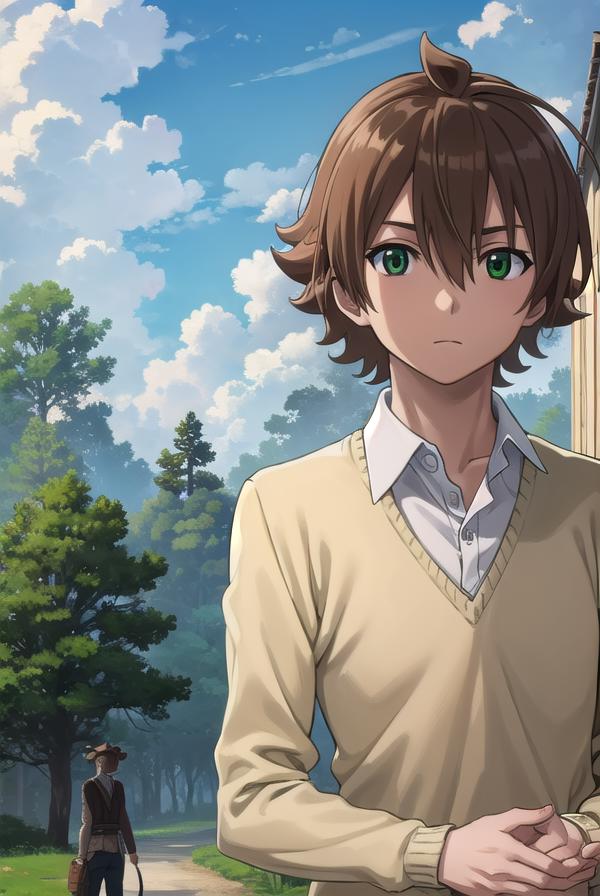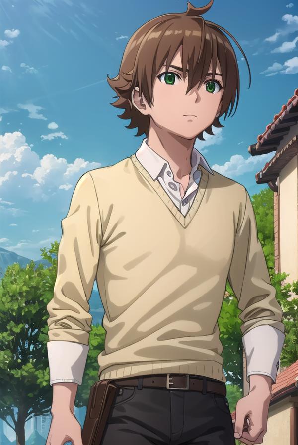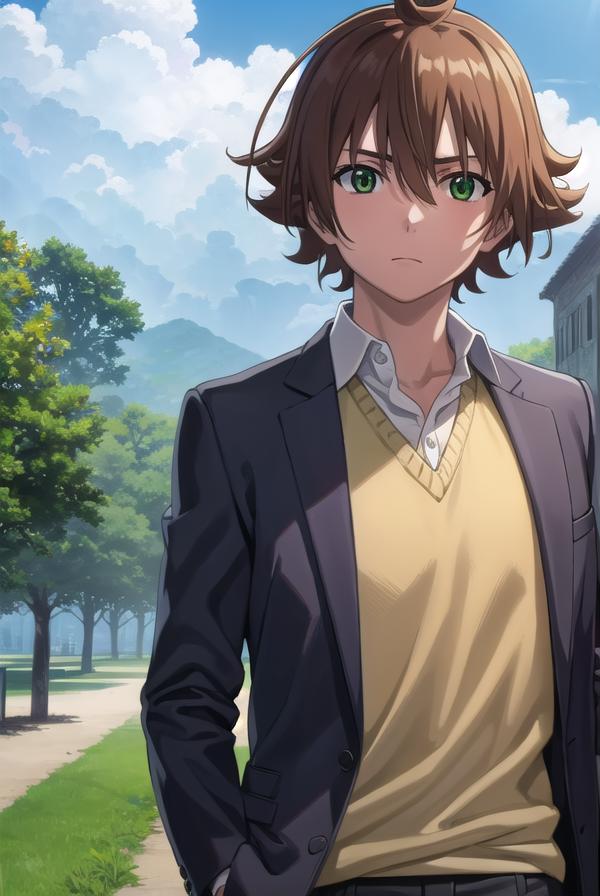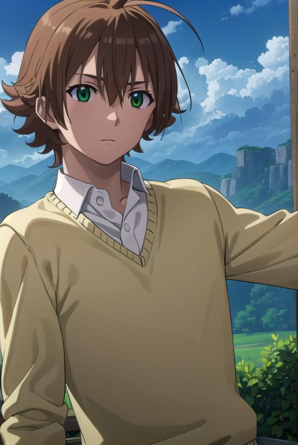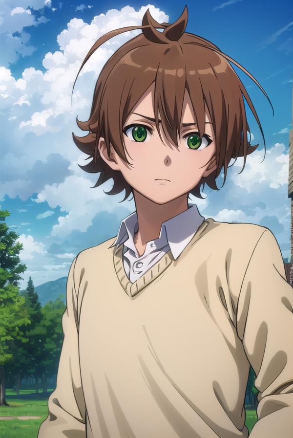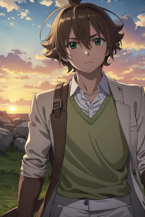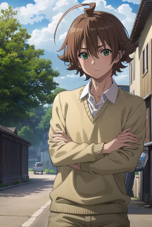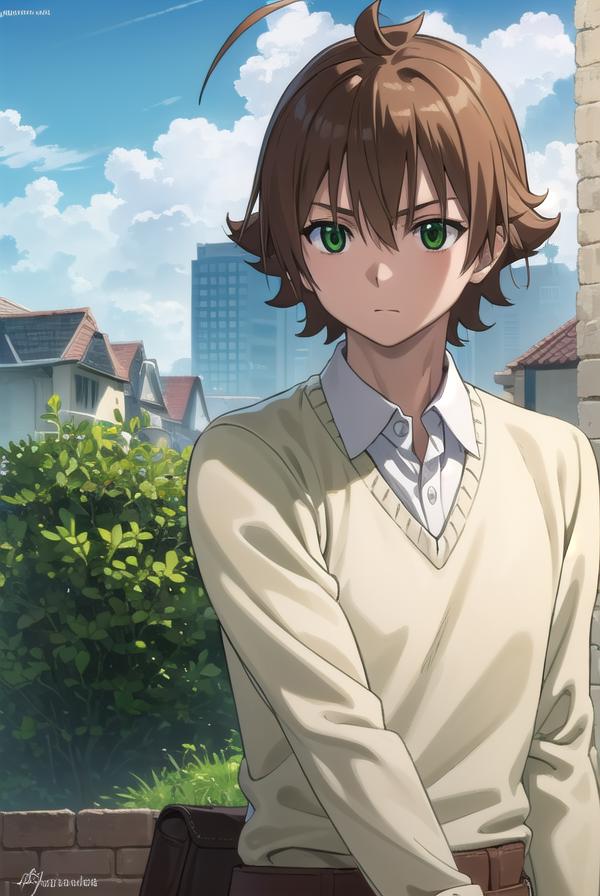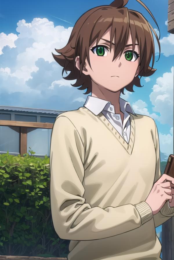 tatsumi, brown hair, (green eyes:1.3), male focus, short hair, hair between eyes, ahoge,