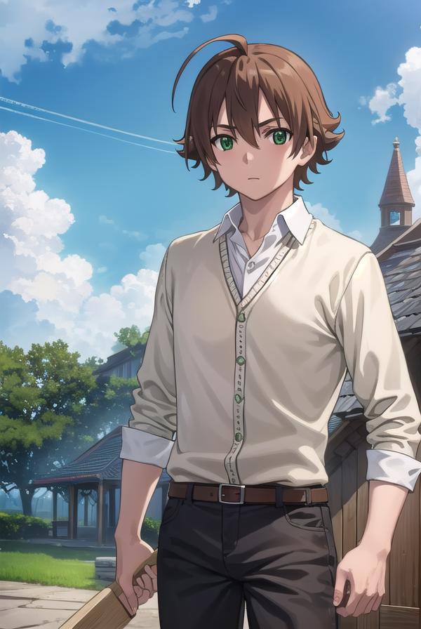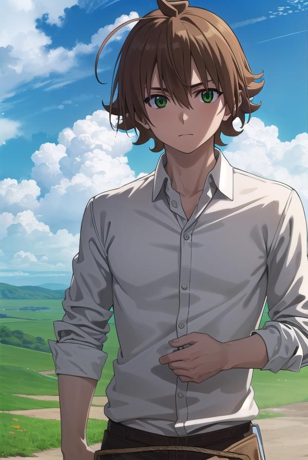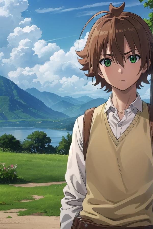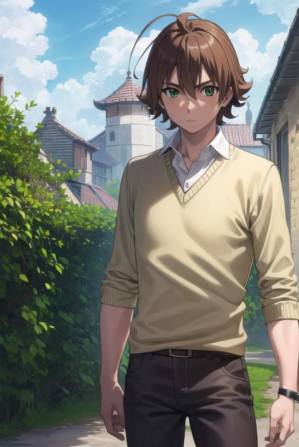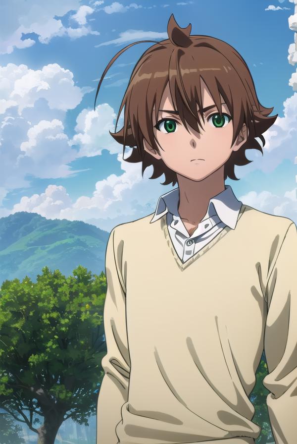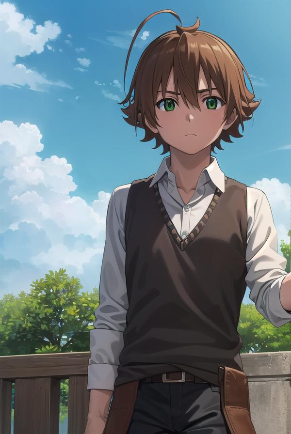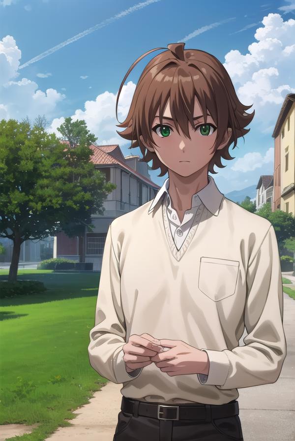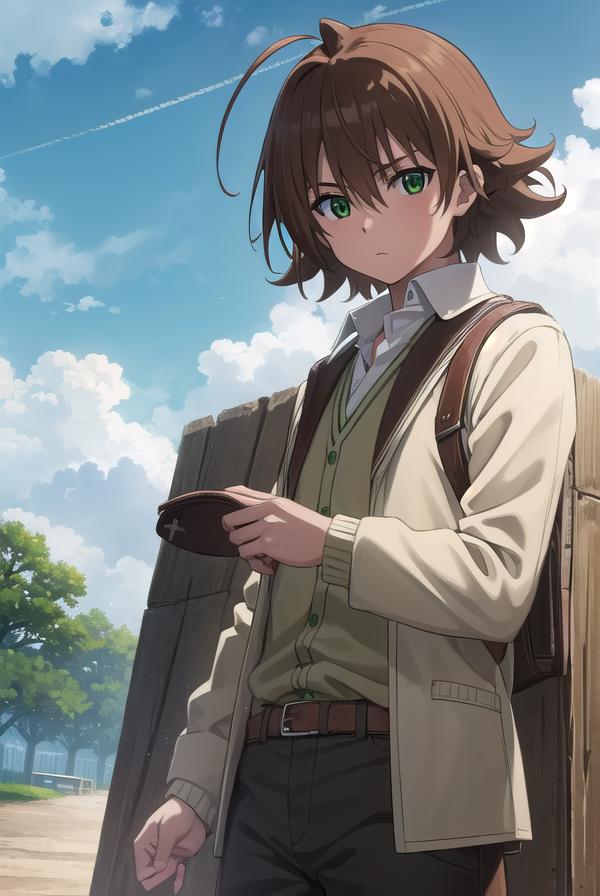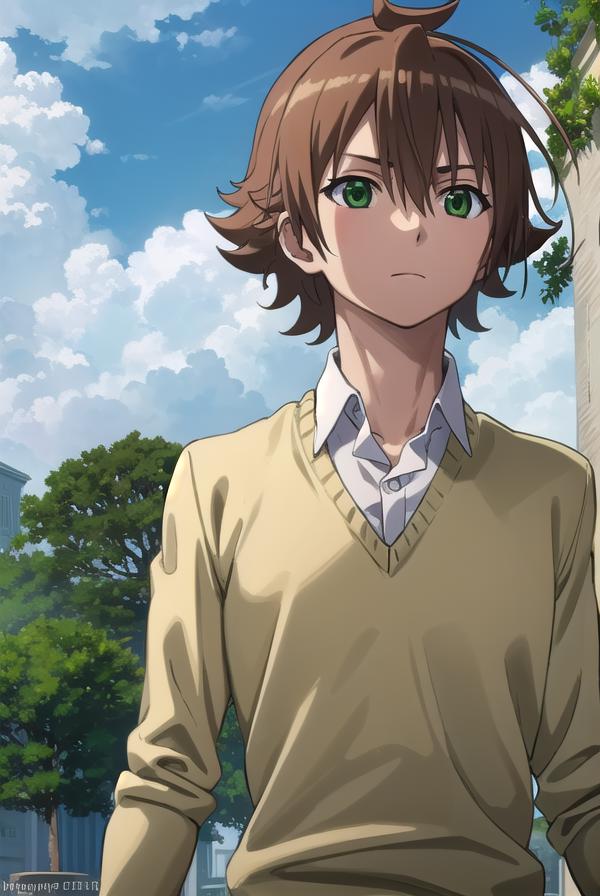 tatsumi, brown hair, (green eyes:1.3), male focus, short hair, hair between eyes, ahoge,
