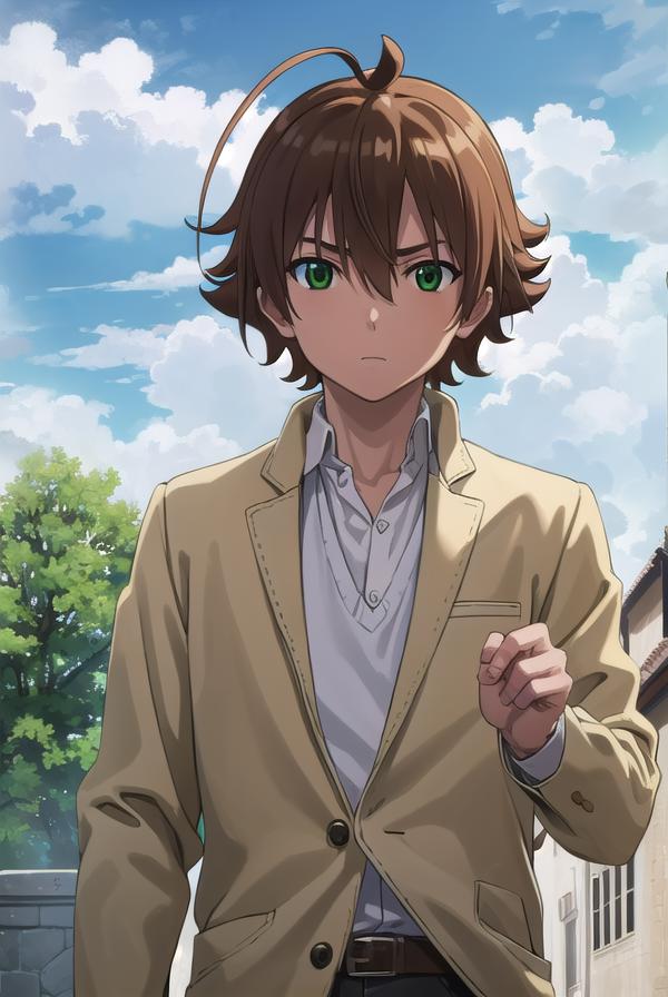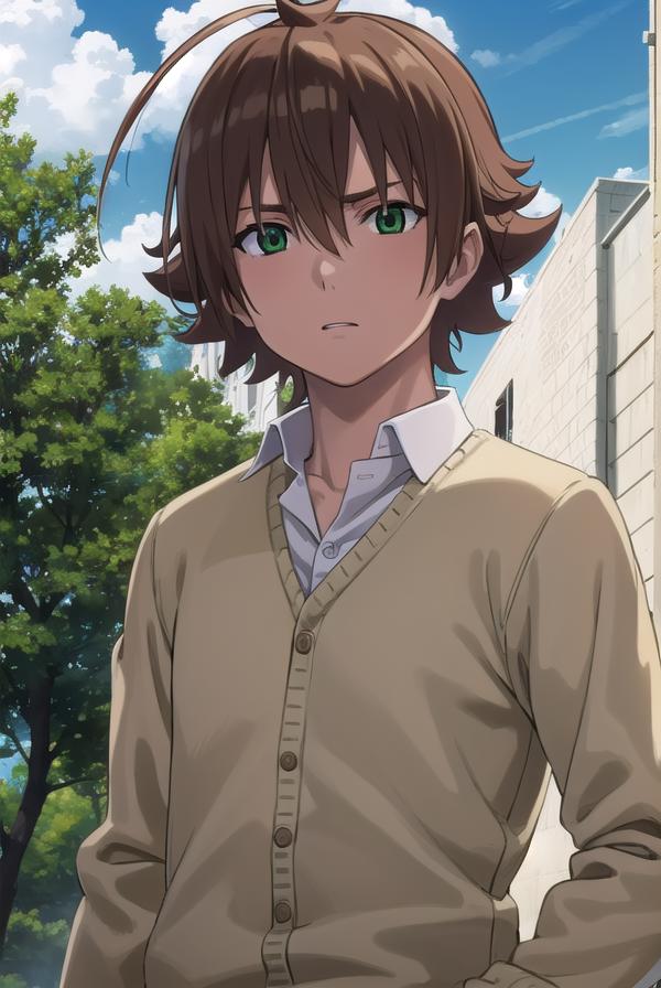 tatsumi. brown hair, (green eyes:1.3), male focus, short hair, hair between eyes, ahoge,