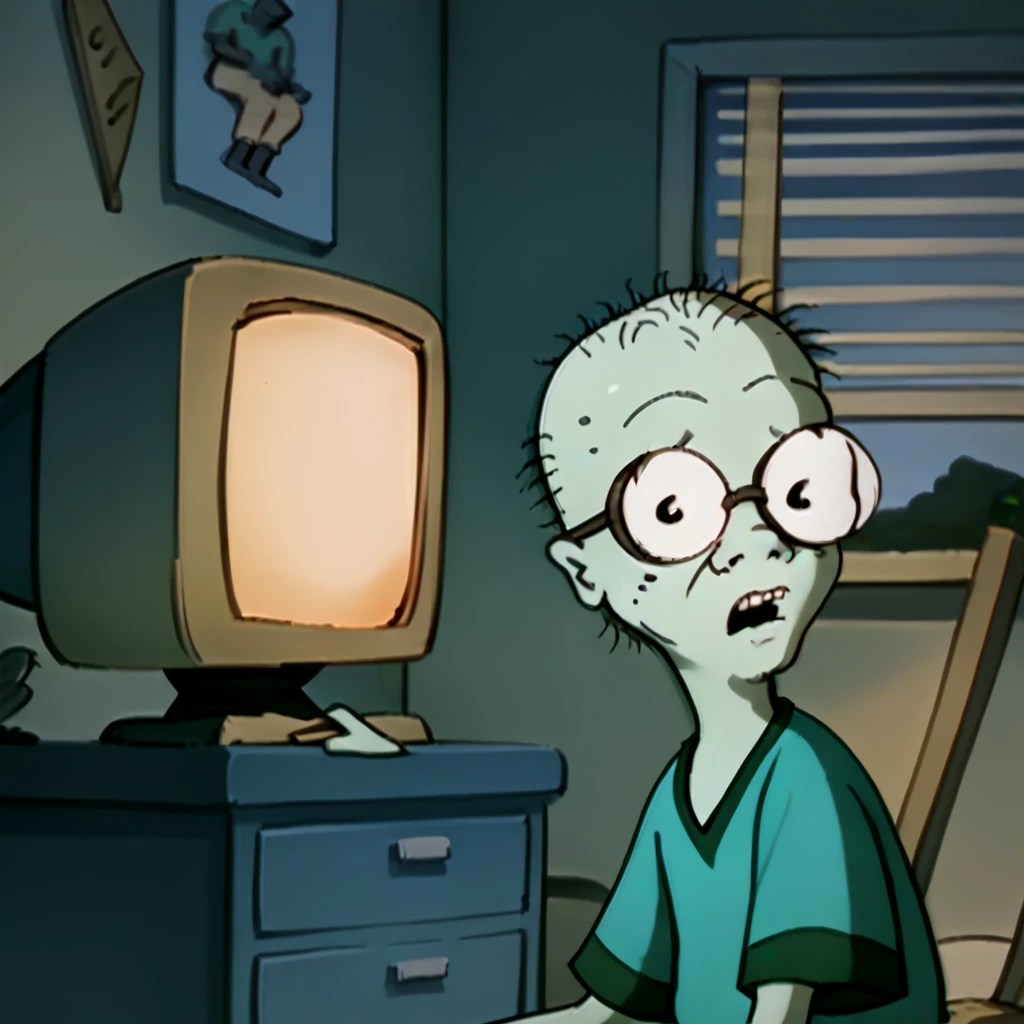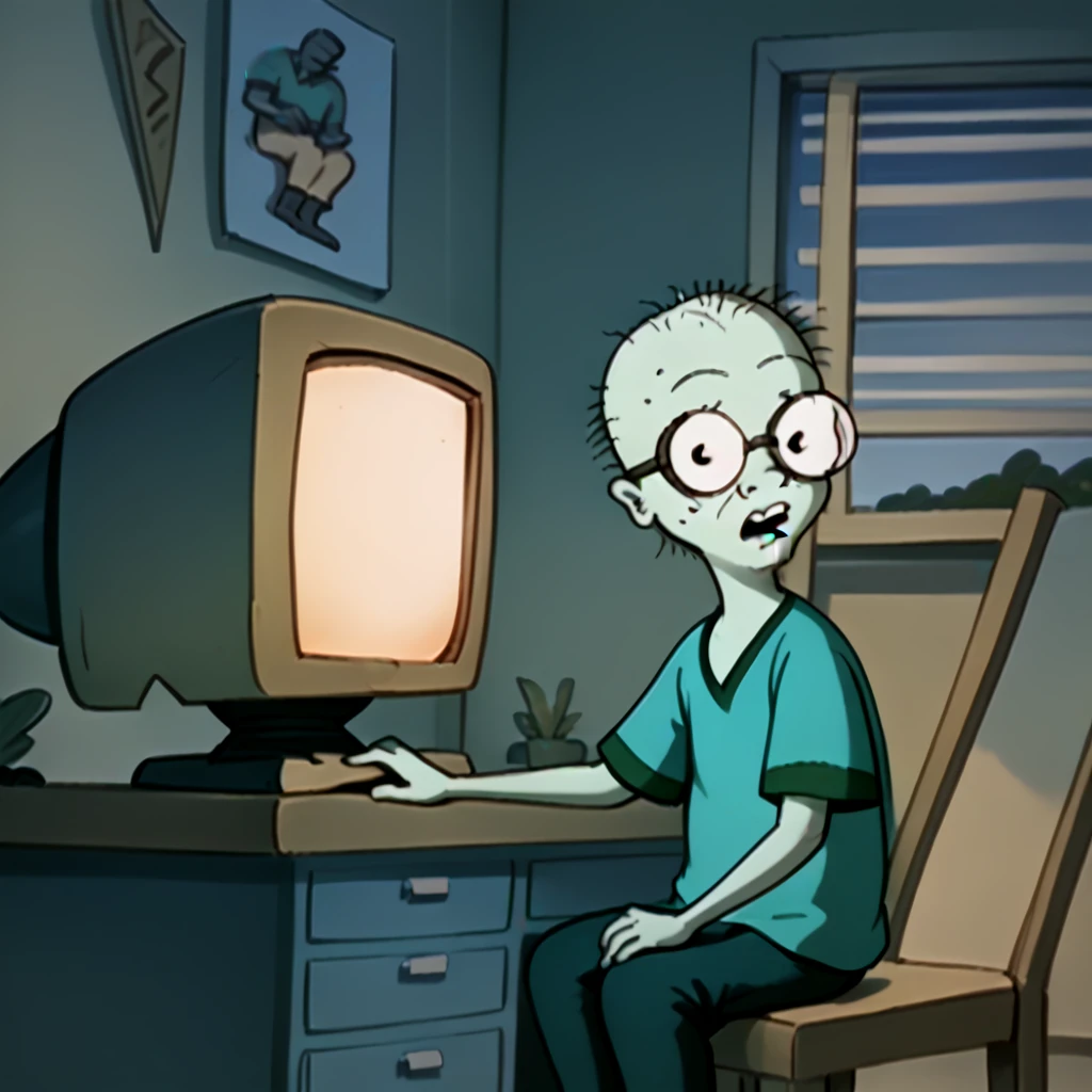 1boy, thinning hair, glasses, round eyewear, v-neck shirt, blue shirt, jeans, sitting, sitting at computer, frail, meek, pale, computer, desk, screen glow, bedroom, chair, window shade,