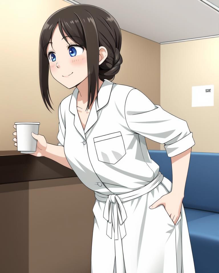 My colleague changed into clothes that are easy to put on and take off for the health checkup.