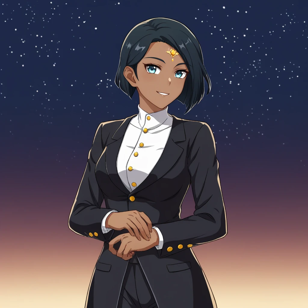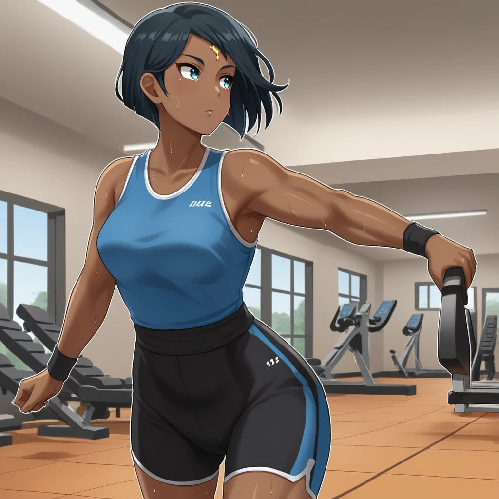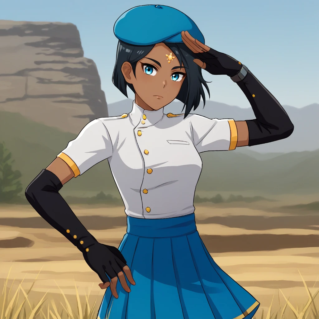 Blue eyes,short hair, forehead jewel, dark-skinned female, black hair, beret, fingerless gloves, white shirt, short sleeves, pleated skirt, black gloves, blue skirt, elbow gloves