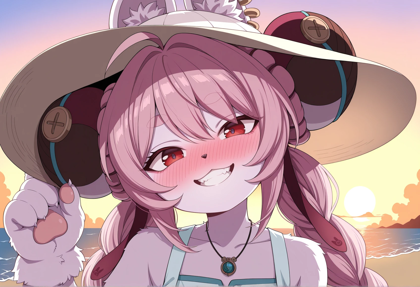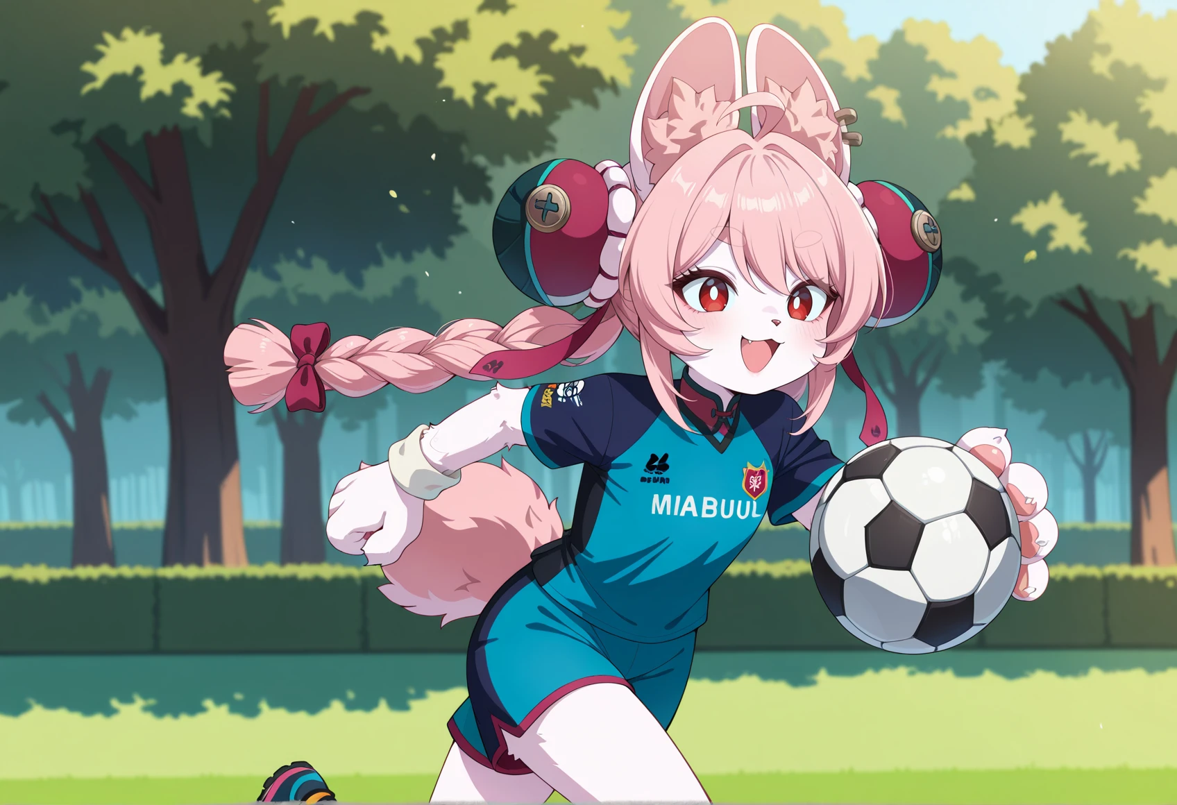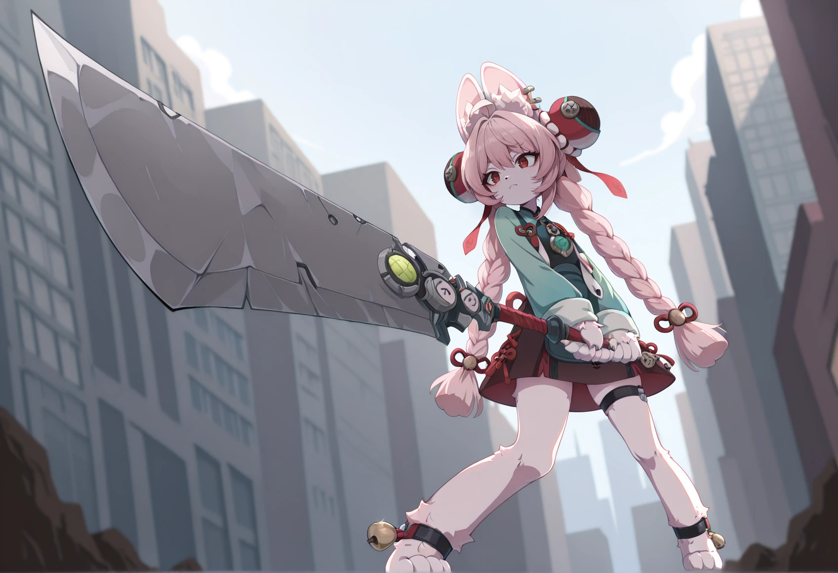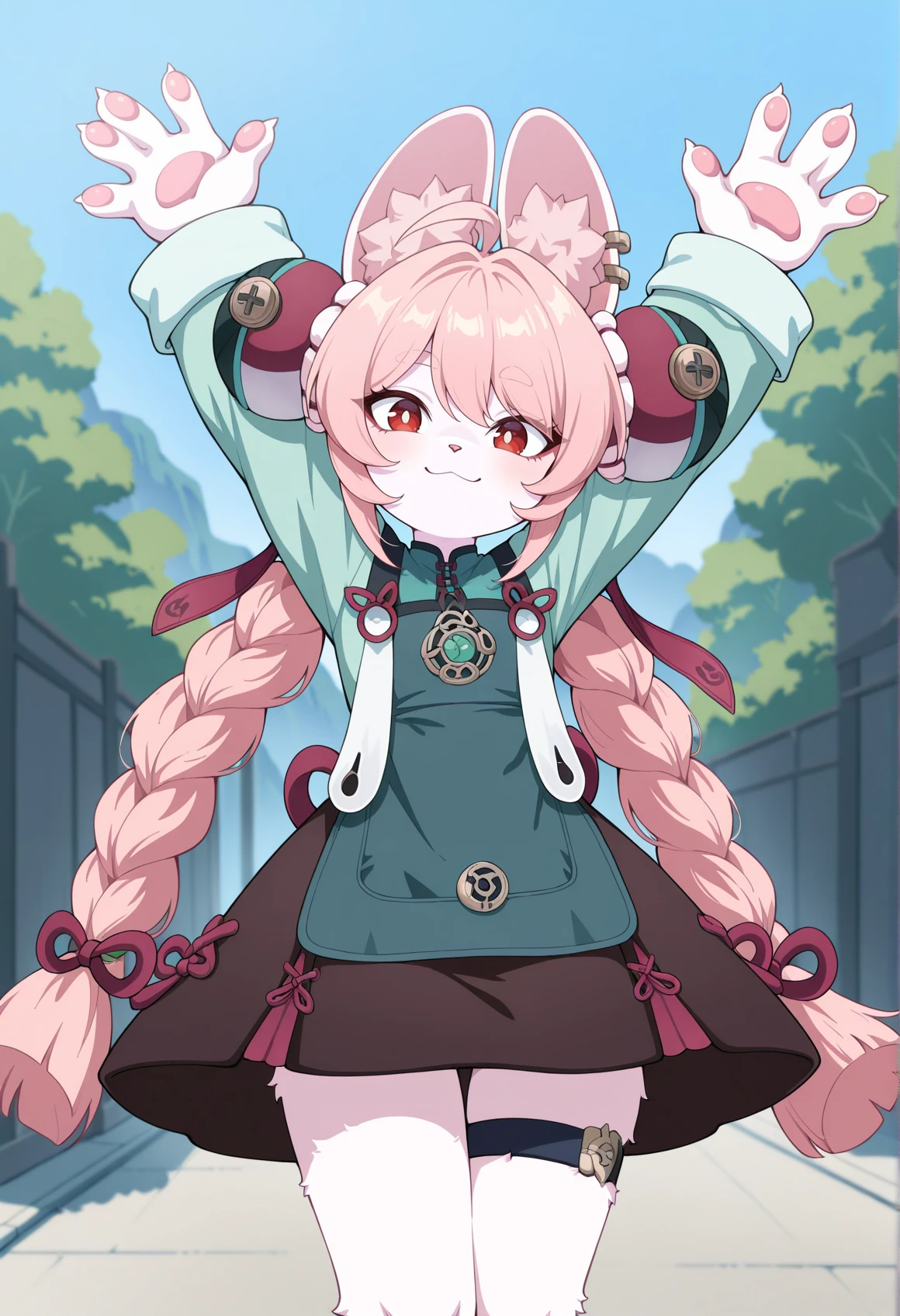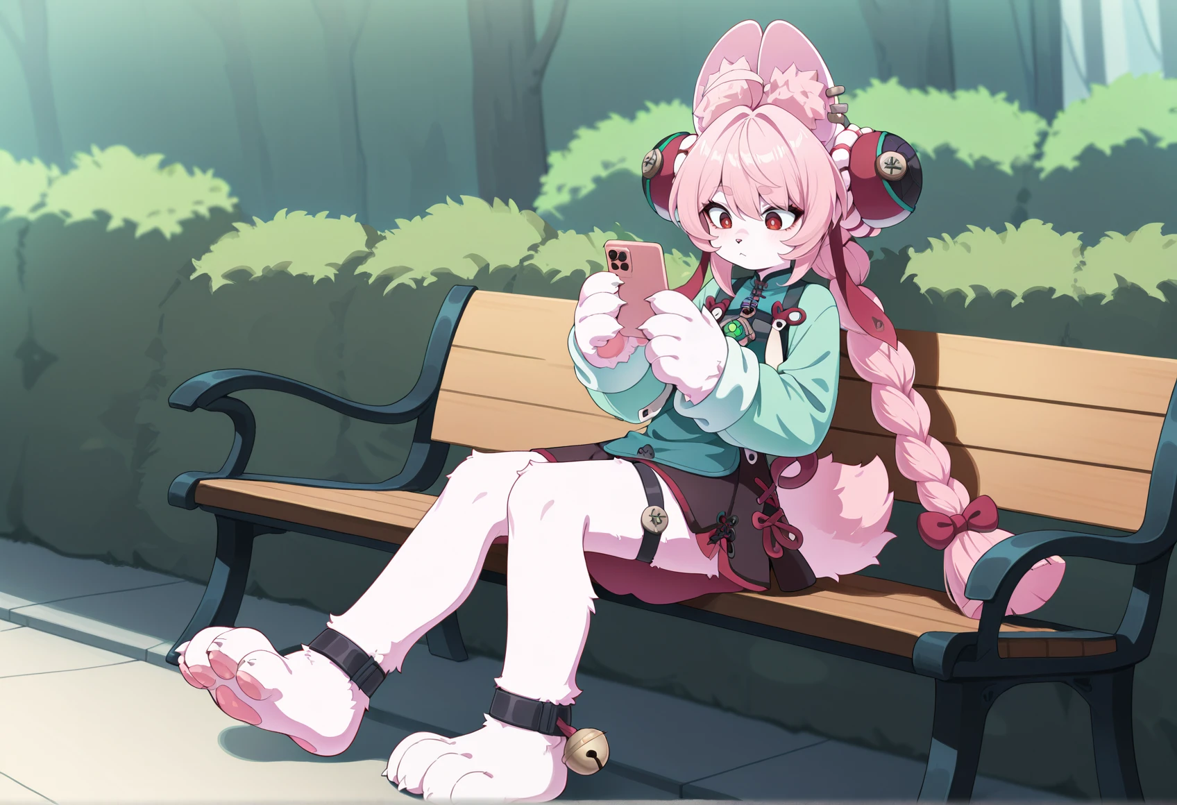 furry female, pink hair, double bun, bun cover, twin braids, ahoge, animal ears, animal hands, red eyes, green shirt, skirt, thigh strap, anklet, bell,