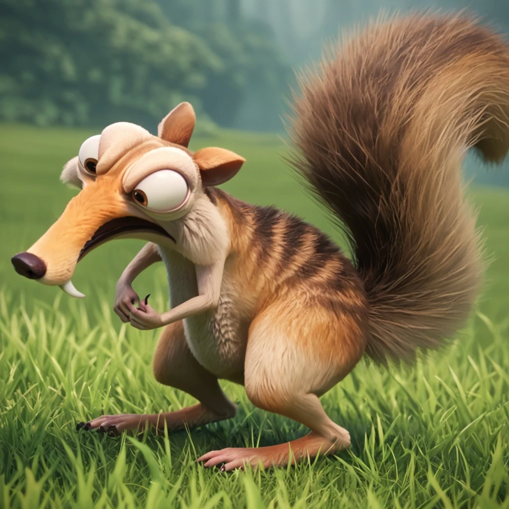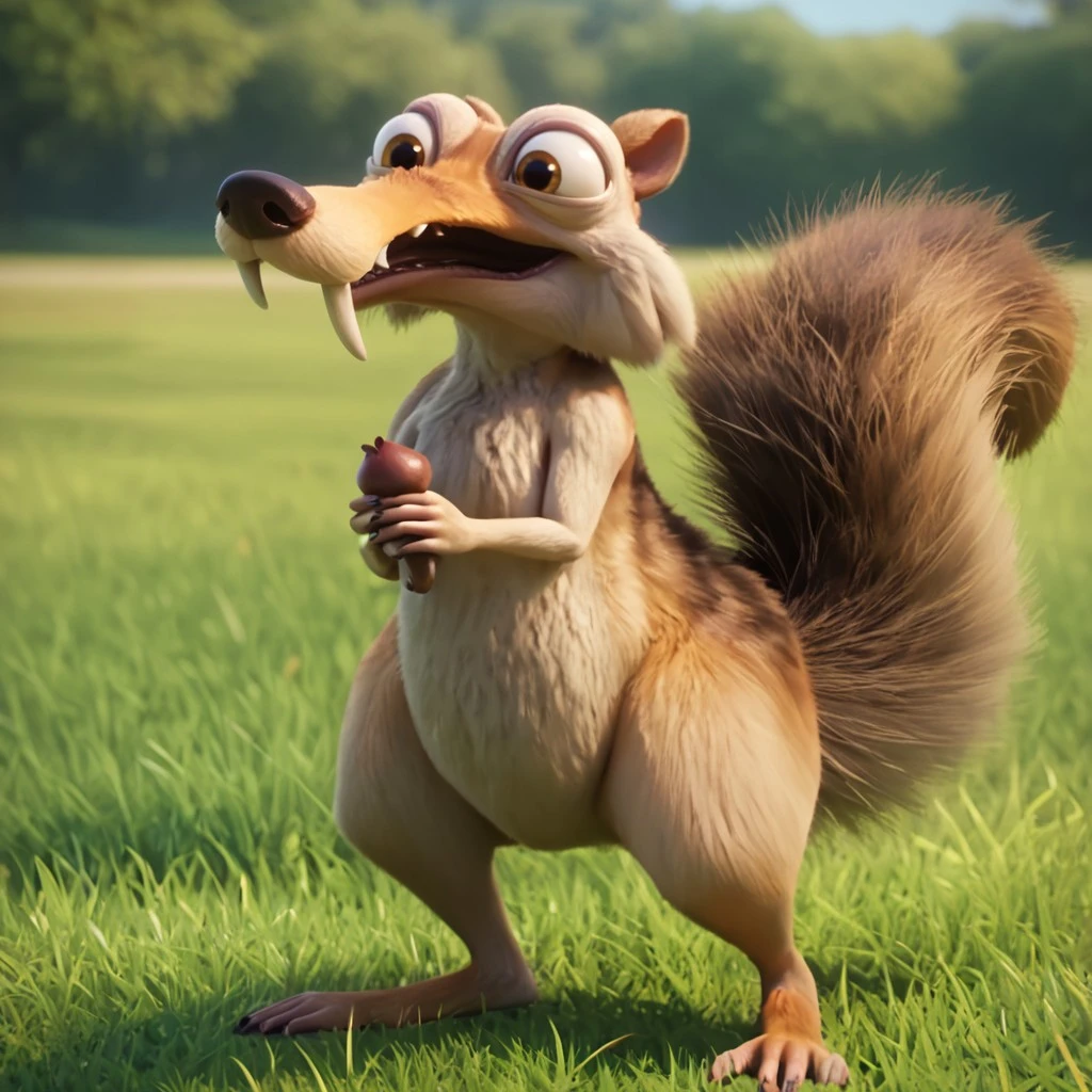 male, furry male, solo, feral, saber-tooth squirrel, brown fur, two-tone fur, brown eyes, black nose, sharp teeth, fangs, small ears, nails, grey tail, bushy tail