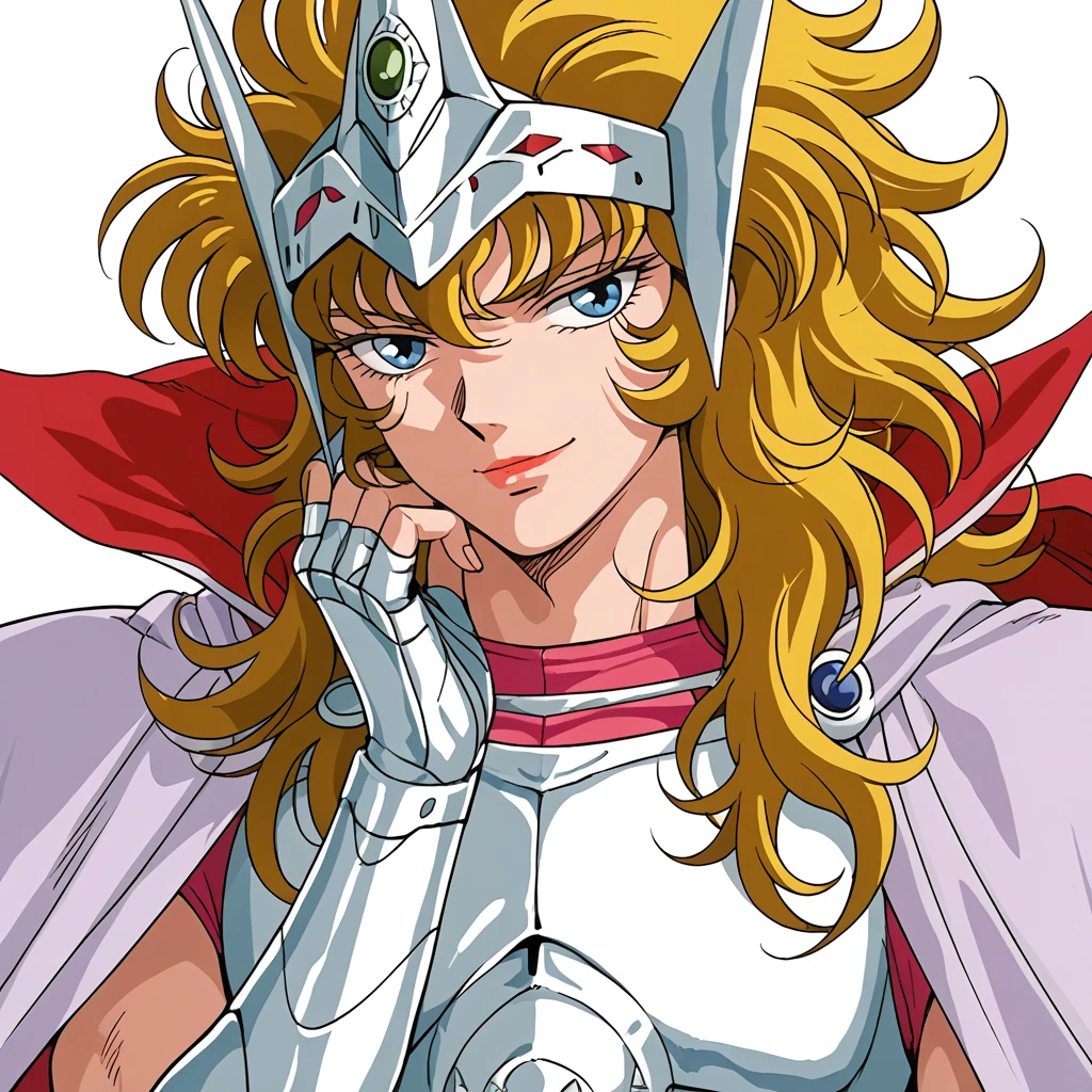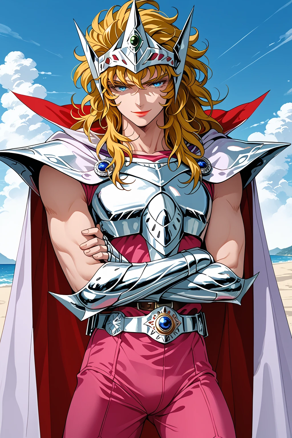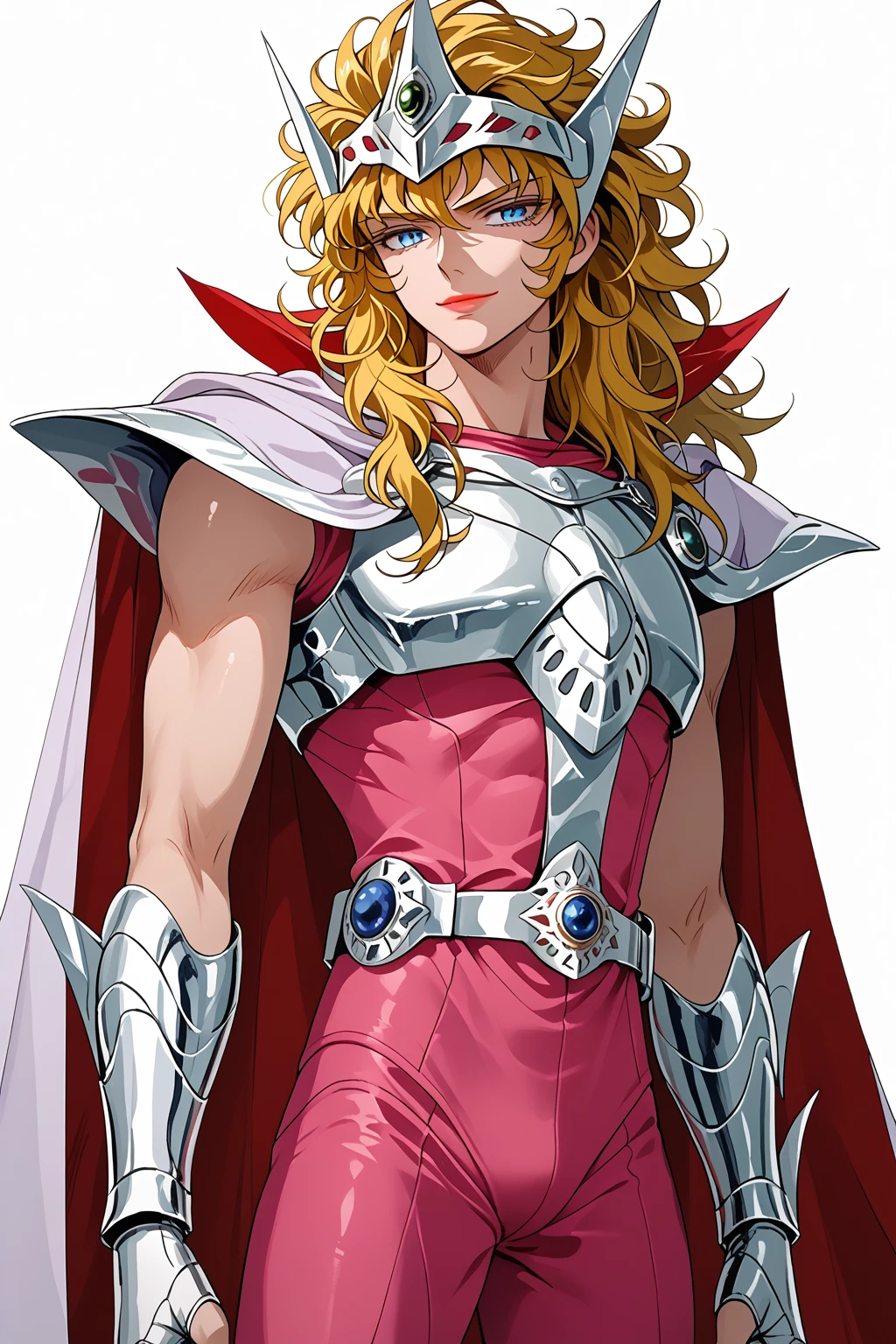 1boy, male focus, blue eyes, tsurime, light pink lipstick, blonde hair, wavy hair, long hair, circlet, (white-violet cape, red inner cape, high collar), silver pauldrons, silver breastplate, silver fingerless gauntlets, sleeveless pink bodysuit, belt, belt buckle, silver greaves