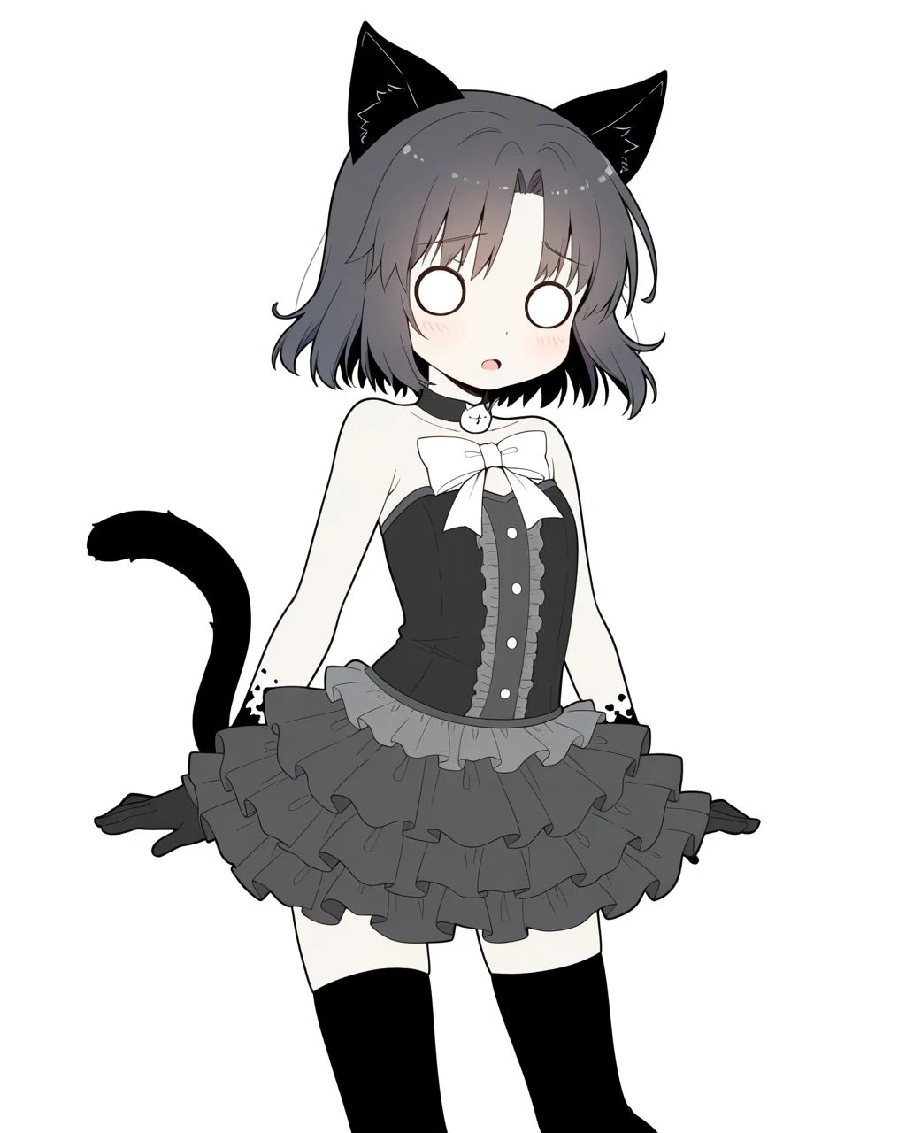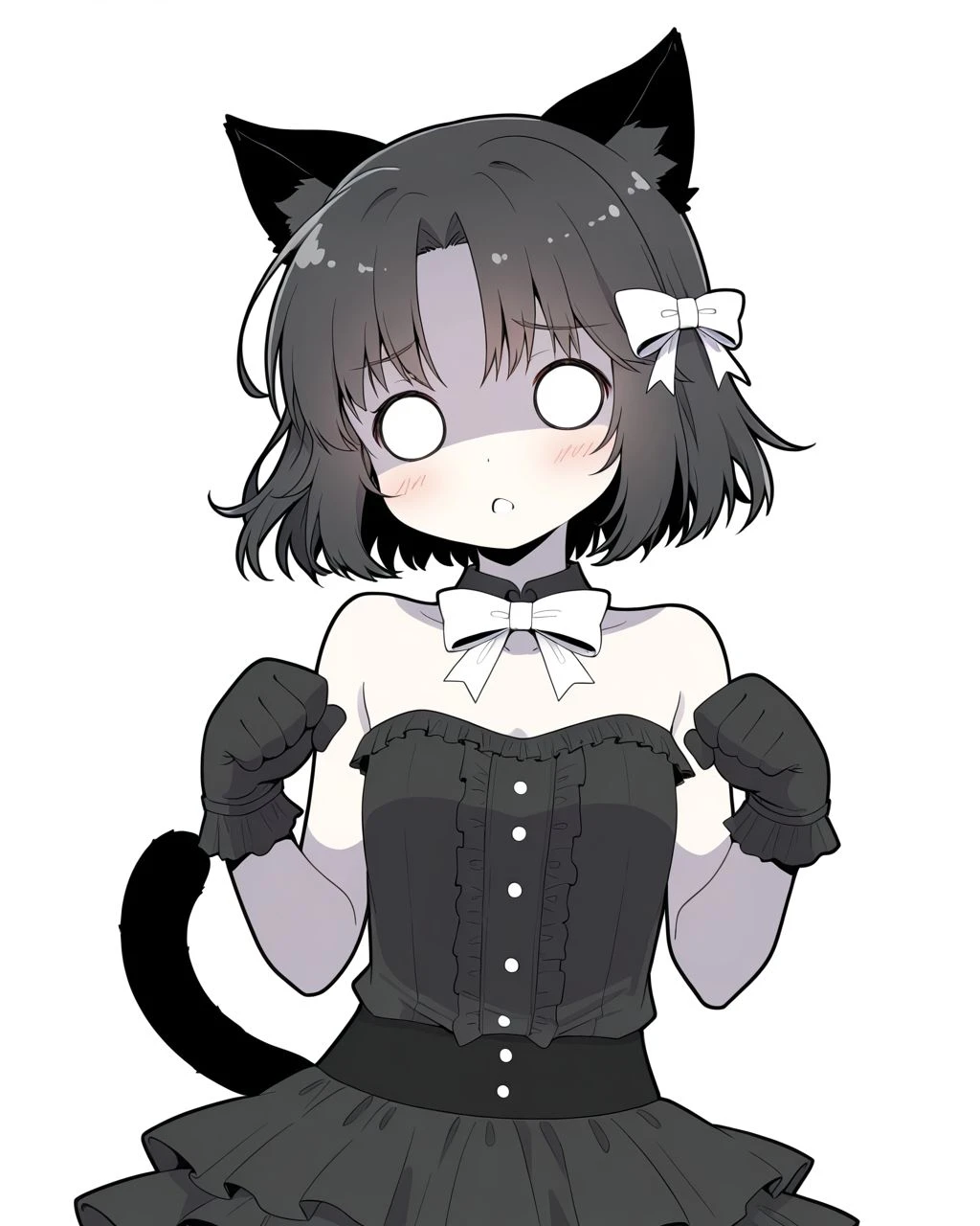 Default Outfit: 1girl, solo, crazed moneko \(nyanko daisensou\), cat girl, cat ears, black hair, short hair, white bow, cat tail, pale skin, o o, normaloutfit, bare shoulders, black shirt, bowtie, black skirt, black gloves, black thighhighs