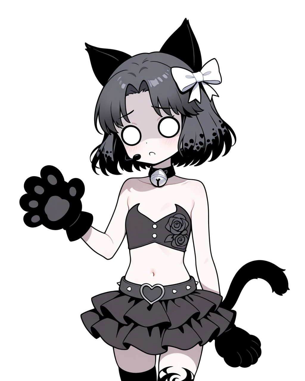 New Outfit: 1girl, solo, crazed moneko \(nyanko daisensou\), cat girl, cat ears, black hair, short hair, white bow, cat tail, pale skin, o o, newoutfit, bare shoulders, bell, heart, heart belt, underwear, rose print, black skirt, black gloves, paw gloves, black thighhighs