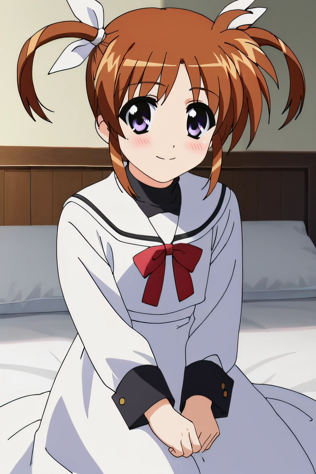 magical girl, red ribbon, white dress, long dress, puffy sleeves, long sleeves, fingerless gloves