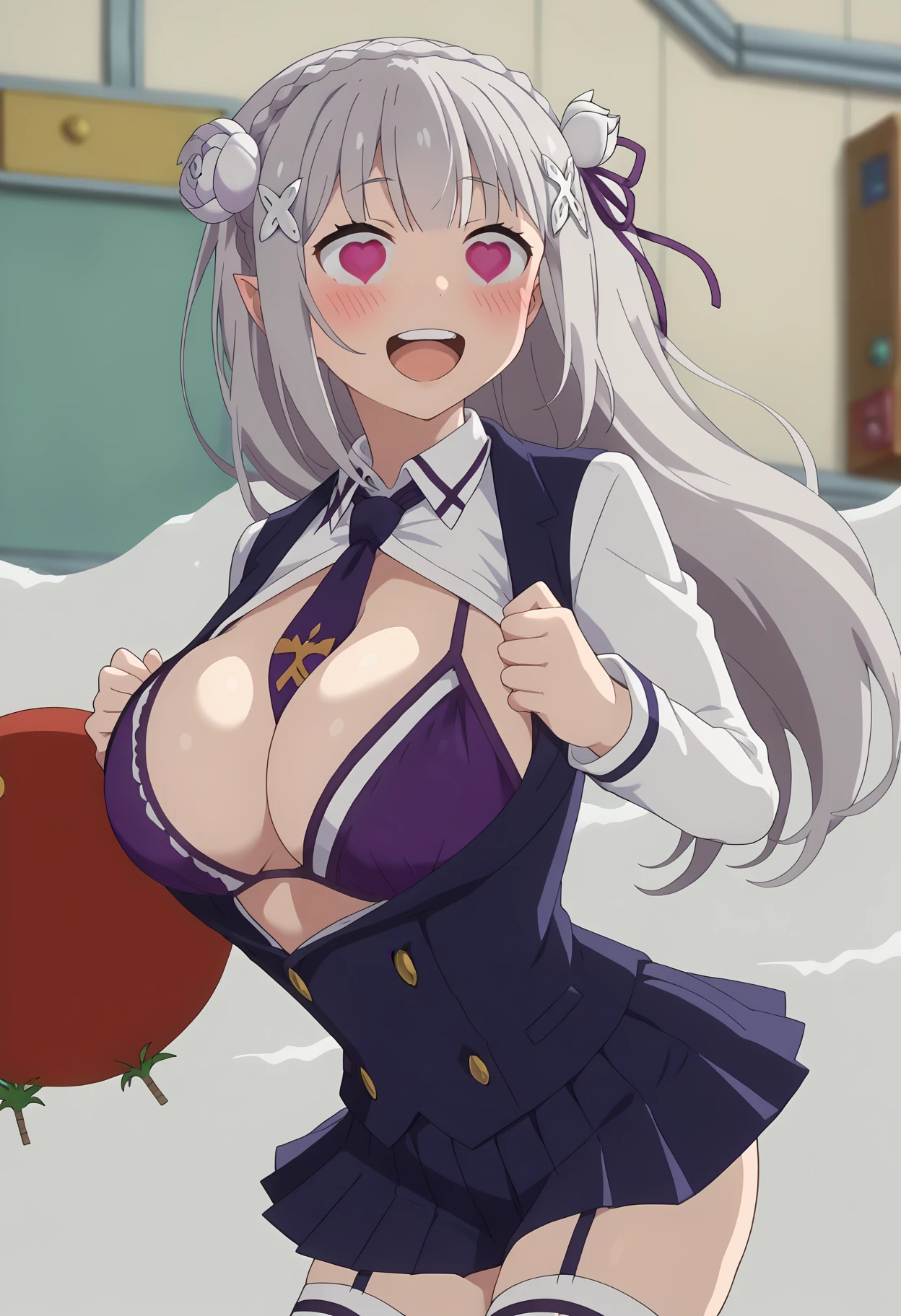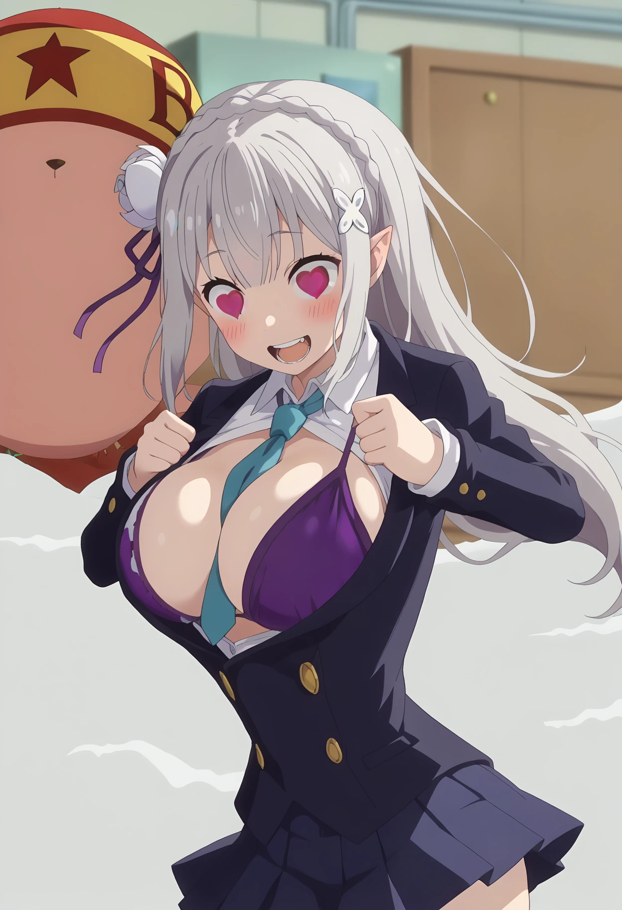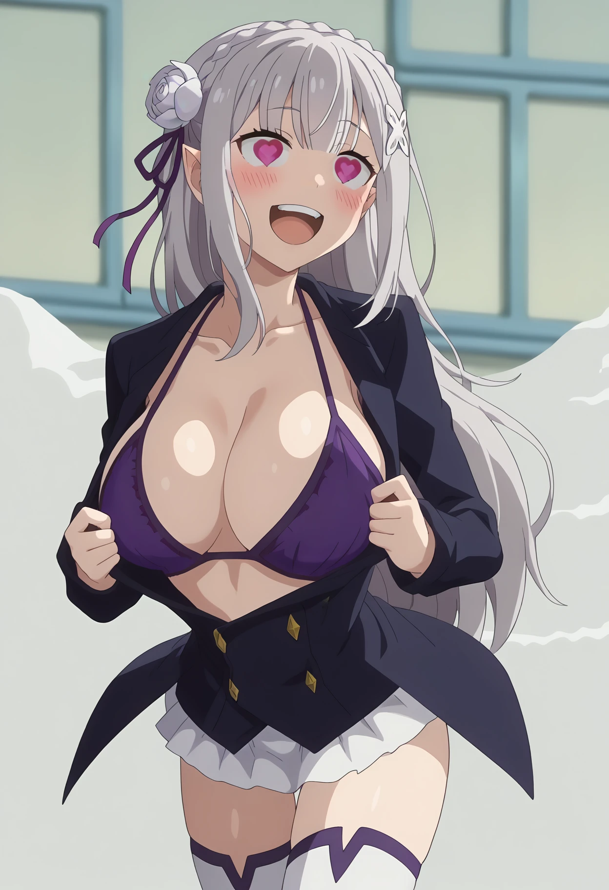 shiexposedbra, meme, symbol-shaped pupils, heart-shaped eyes, , bikini top only, bikini under clothes, heart, large breasts, purple bra, bra,