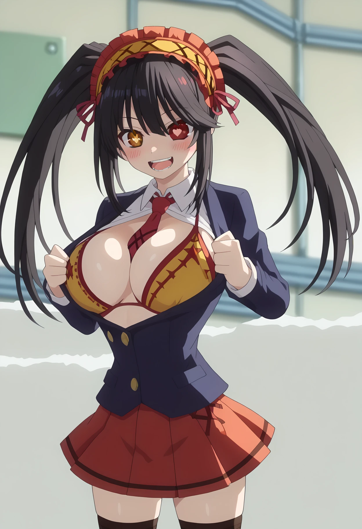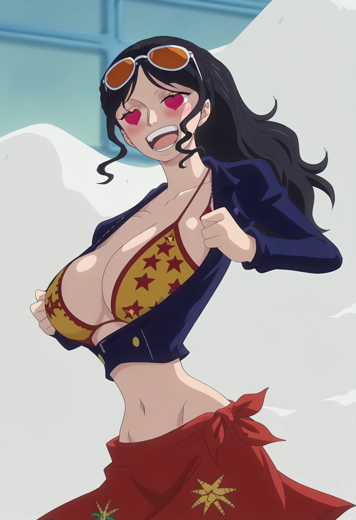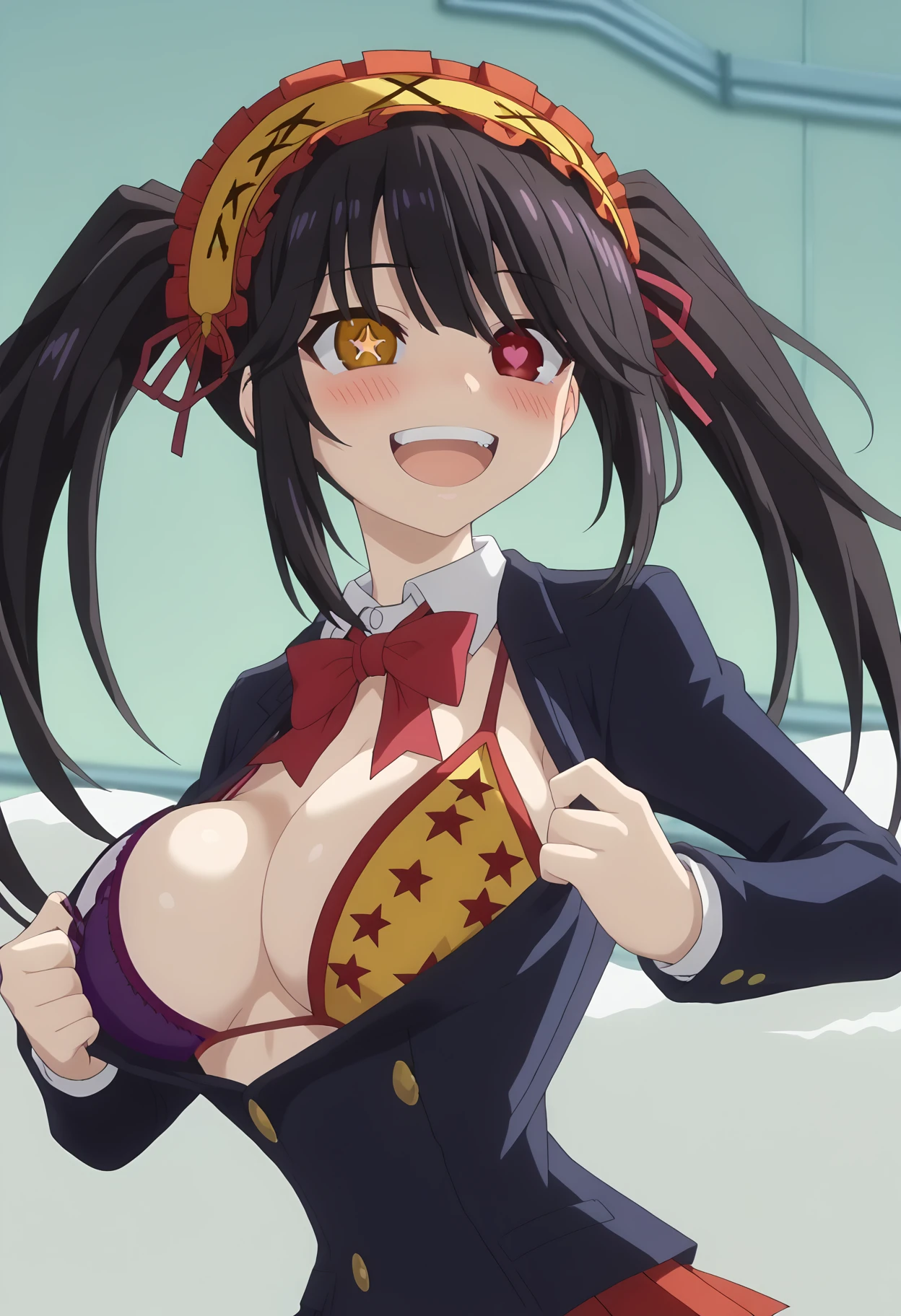 shiexposedbra, meme, symbol-shaped pupils, heart-shaped eyes, , bikini top only, bikini under clothes, heart, large breasts, purple bra, bra,