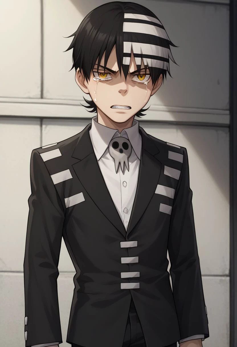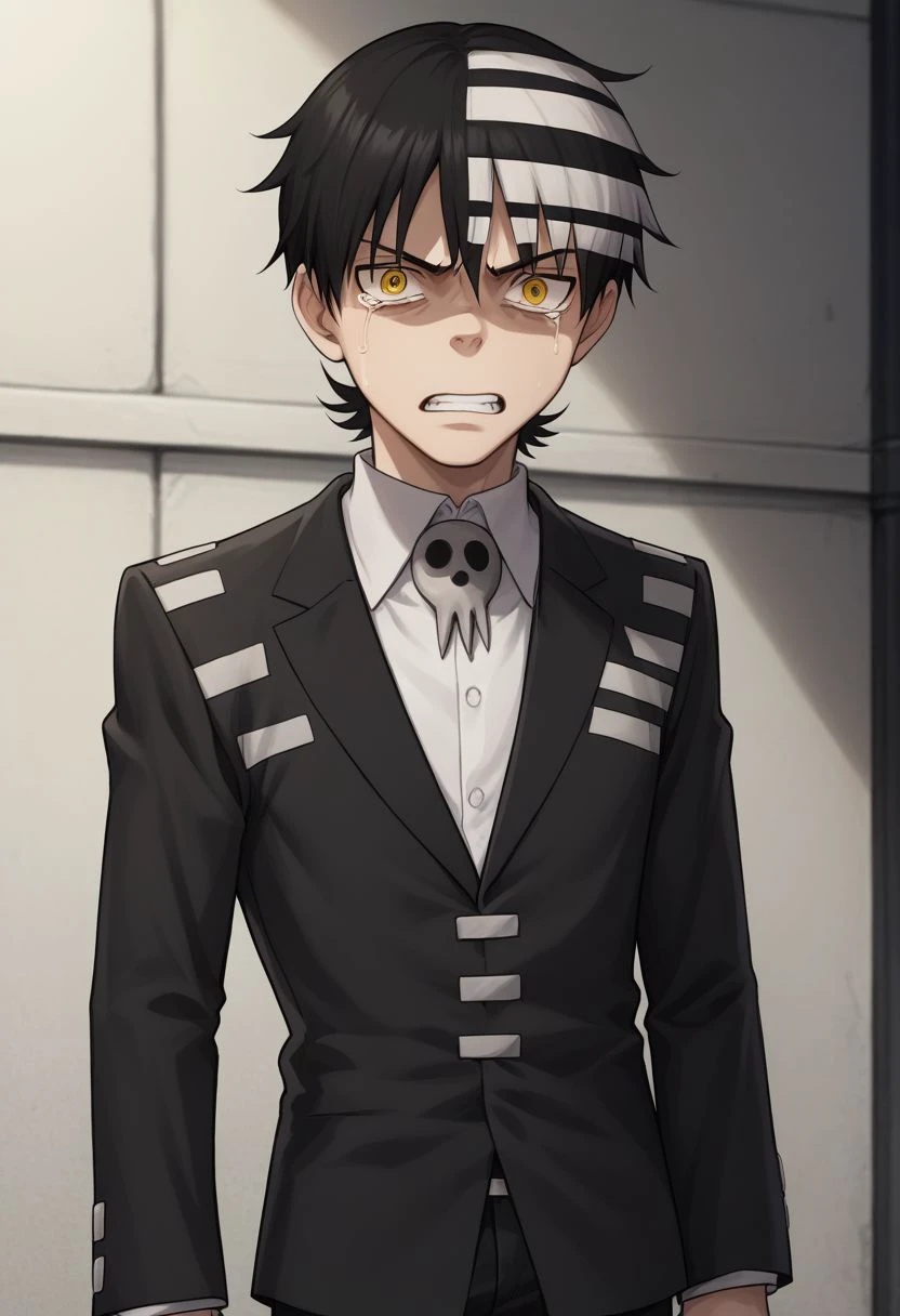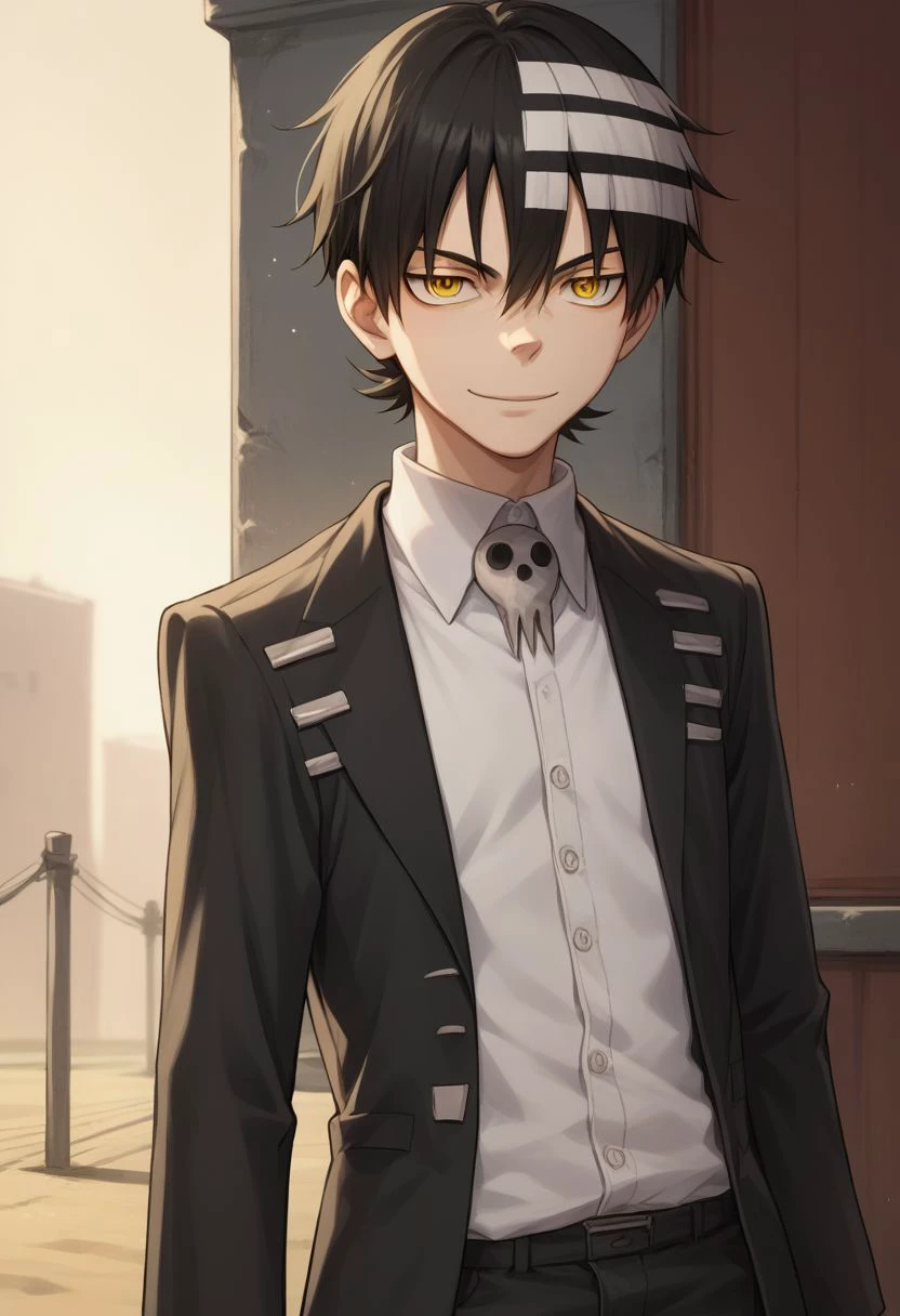 Suit: deathk, 1boy, male focus, black hair, yellow eyes, formal, suit, pants, short hair, black pants, shirt, shoes,