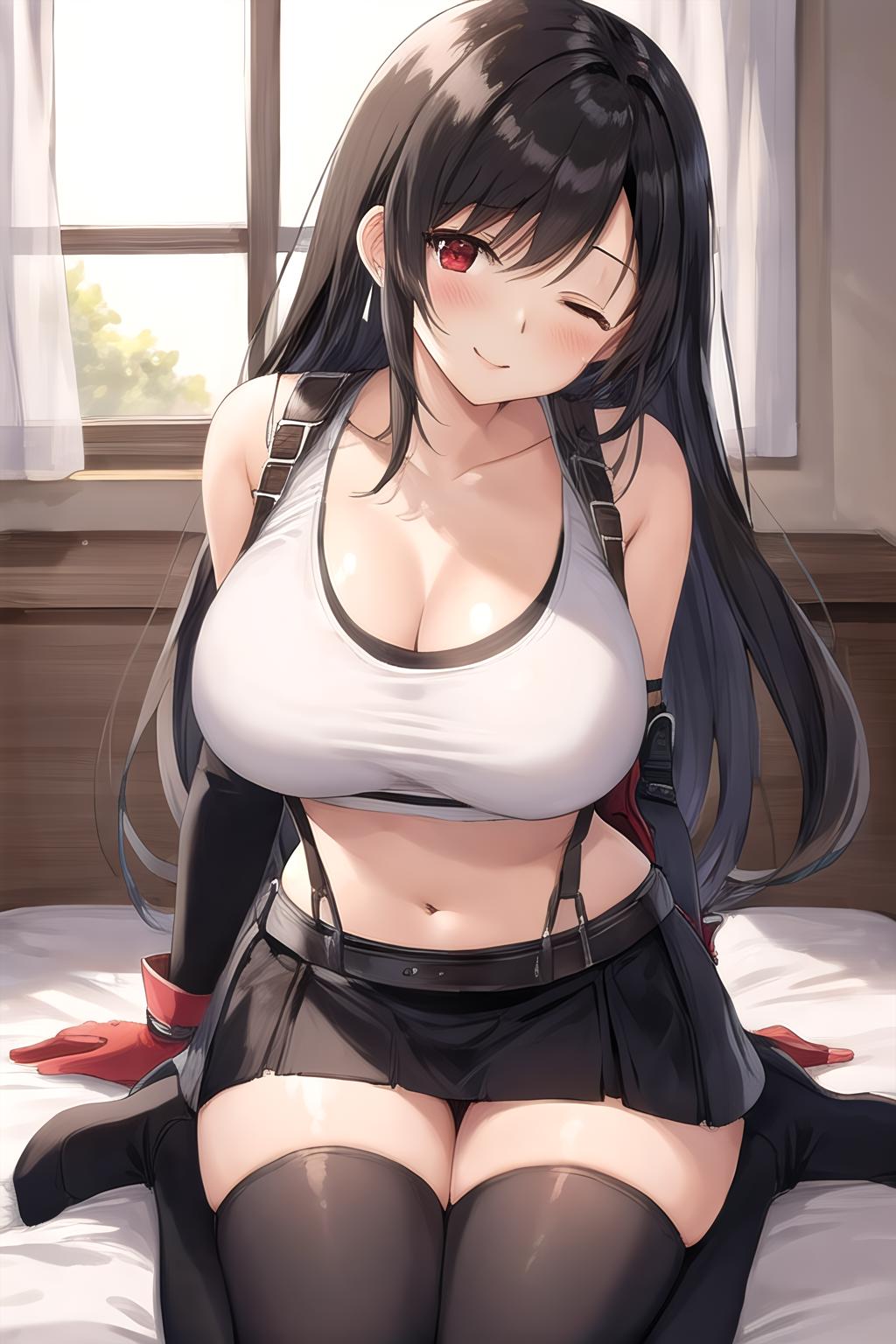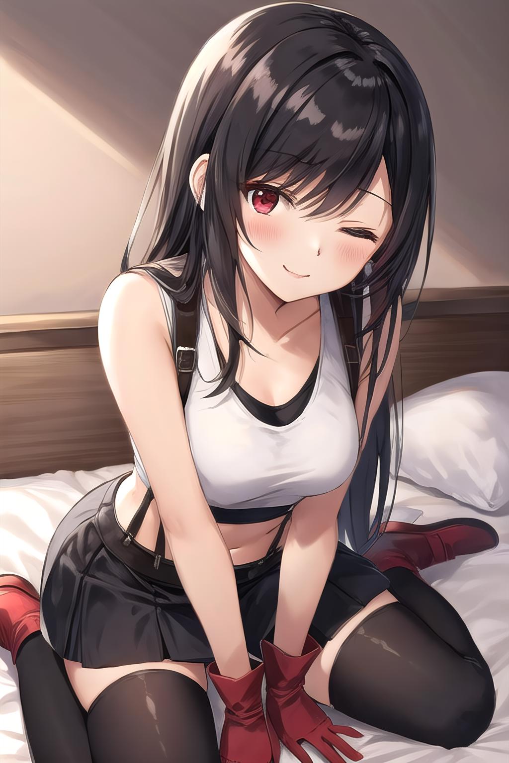 Around 0.7 weight works well. Trigger word is 'tifa ff7'. Adding 'tank top', 'black skirt', 'suspender skirt', 'midriff', 'black thighhighs', and 'red gloves' can all help with generating her outfit.