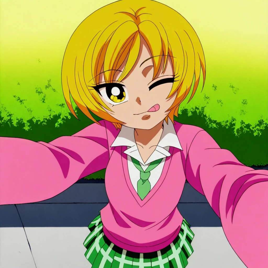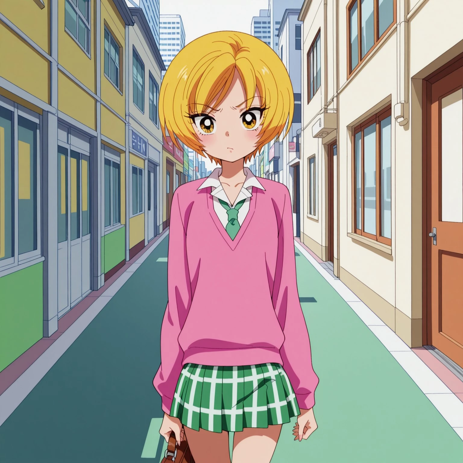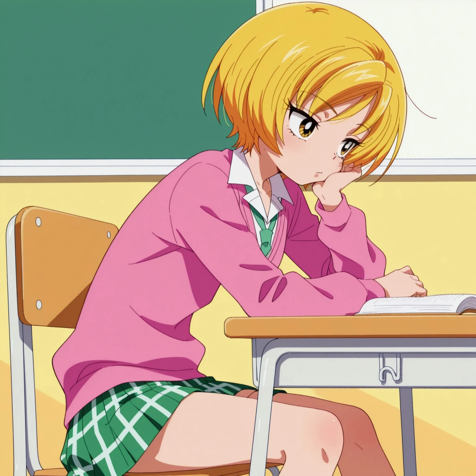 miyu_y, blonde hair, short hair, yellow eyes, school uniform, necktie, plaid skirt