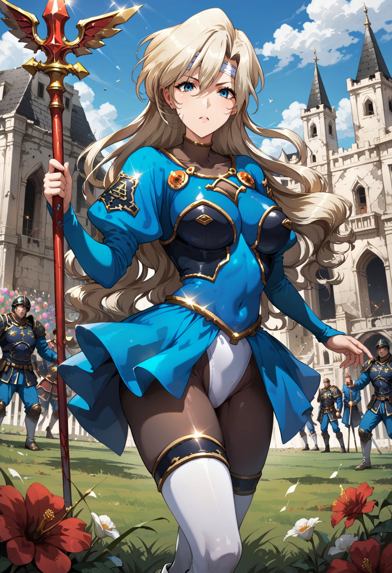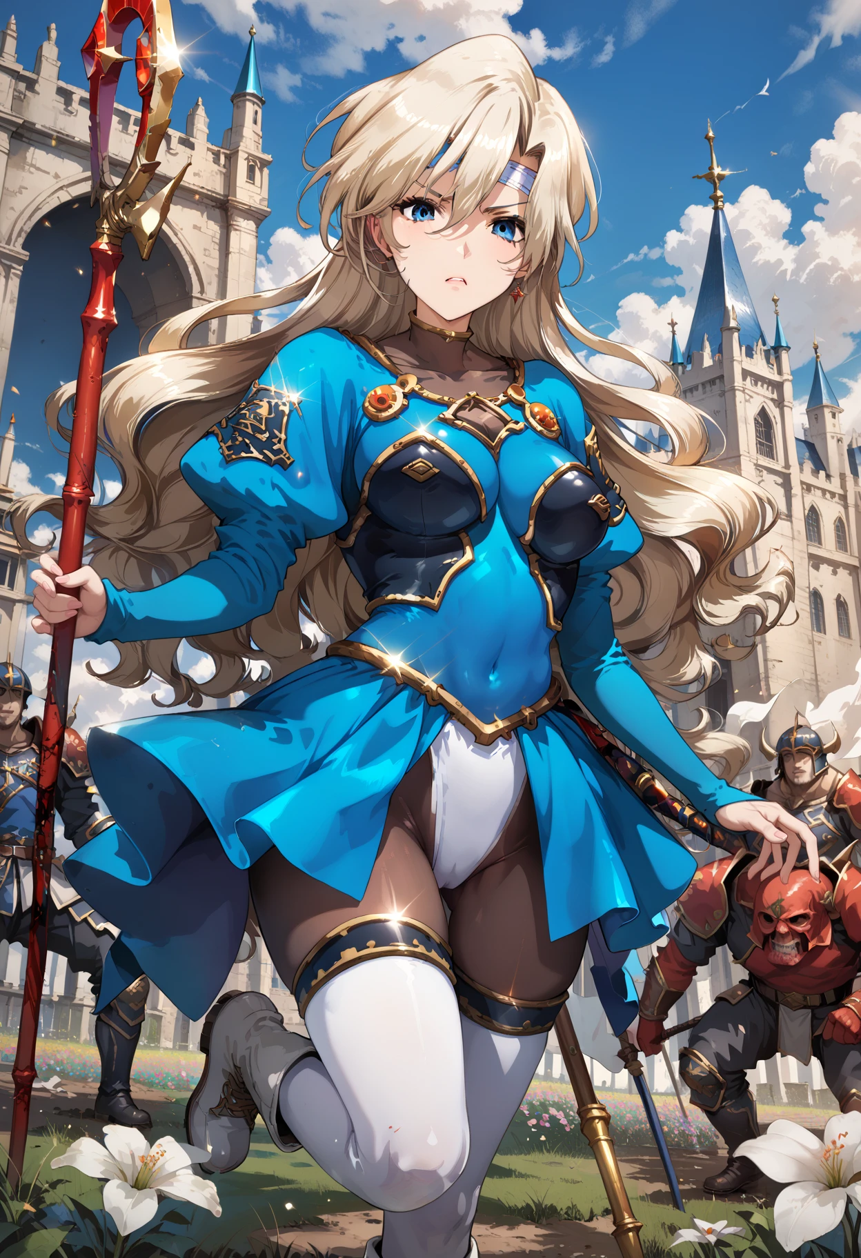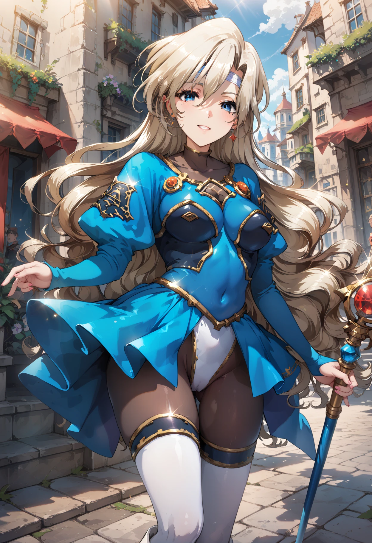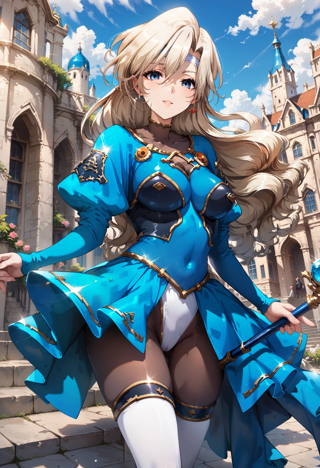 long hair, mole under eye, mole, very long hair, blue eyes, leotard, covered navel, thighhighs, pantyhose, hair between eyes, boots, bodysuit, long sleeves, thigh boots, white footwear,floating hair, medium breasts, blonde hair, headband,