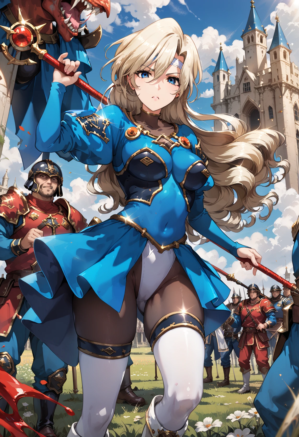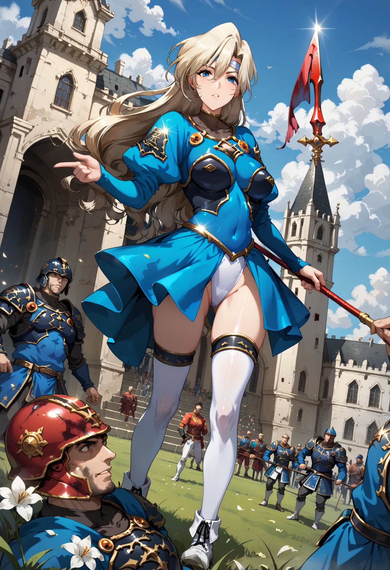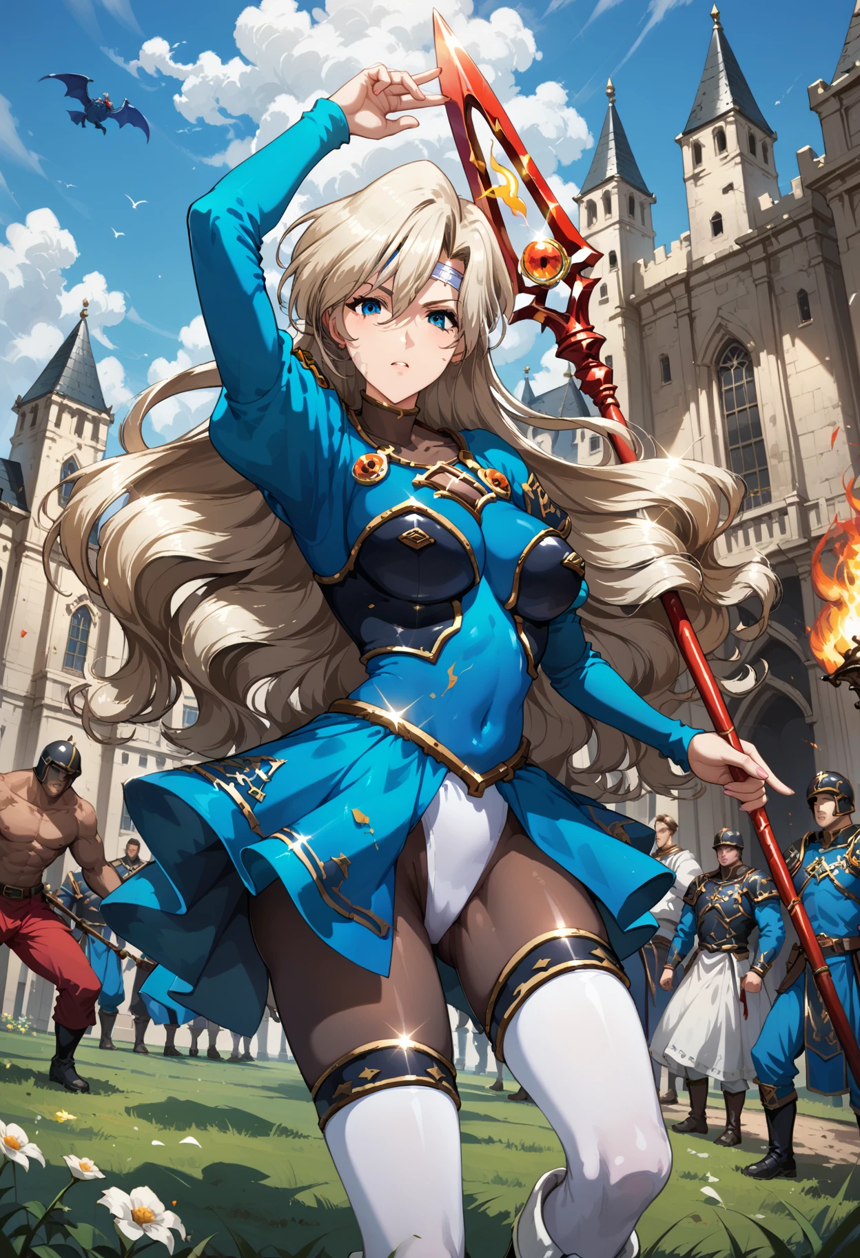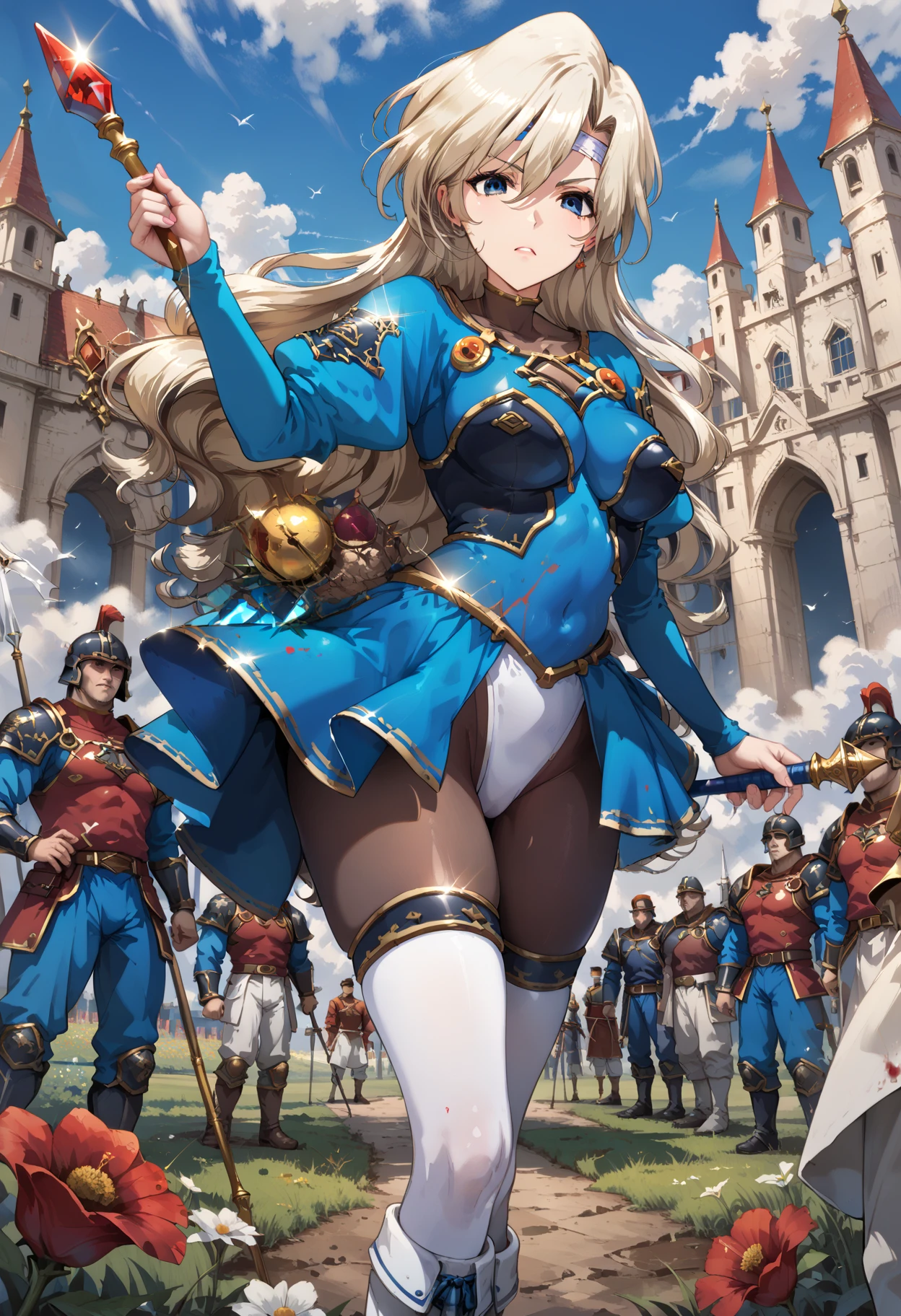 long hair, mole under eye, mole, very long hair, blue eyes, leotard, covered navel, thighhighs, pantyhose, hair between eyes, boots, bodysuit, long sleeves, thigh boots, white footwear,floating hair, medium breasts, blonde hair, headband,