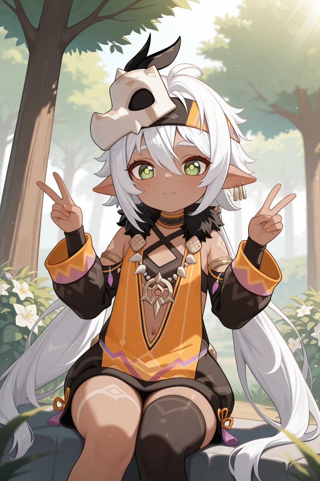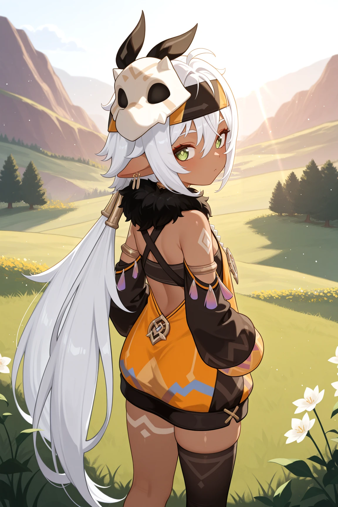 Appearance: dark skin, long hair, white hair, hair between eyes, green eyes, pointy ears, mask on head, headband, earrings, low twintails, tattoo.