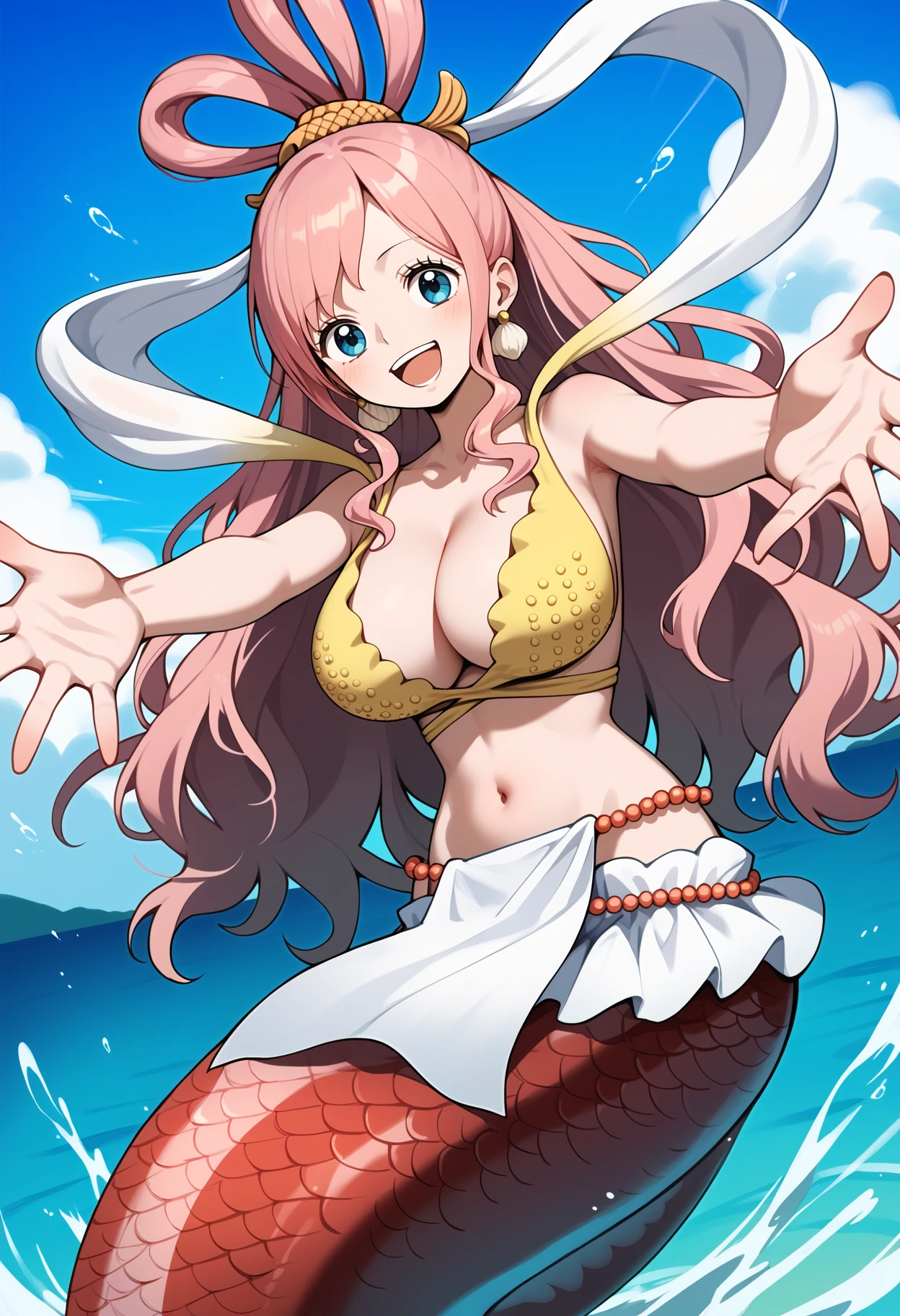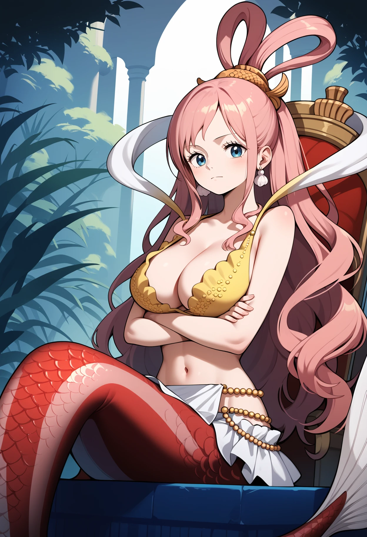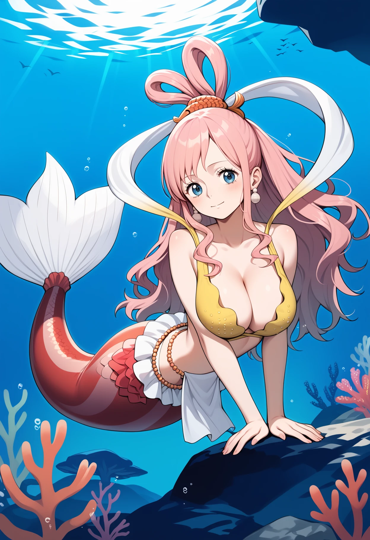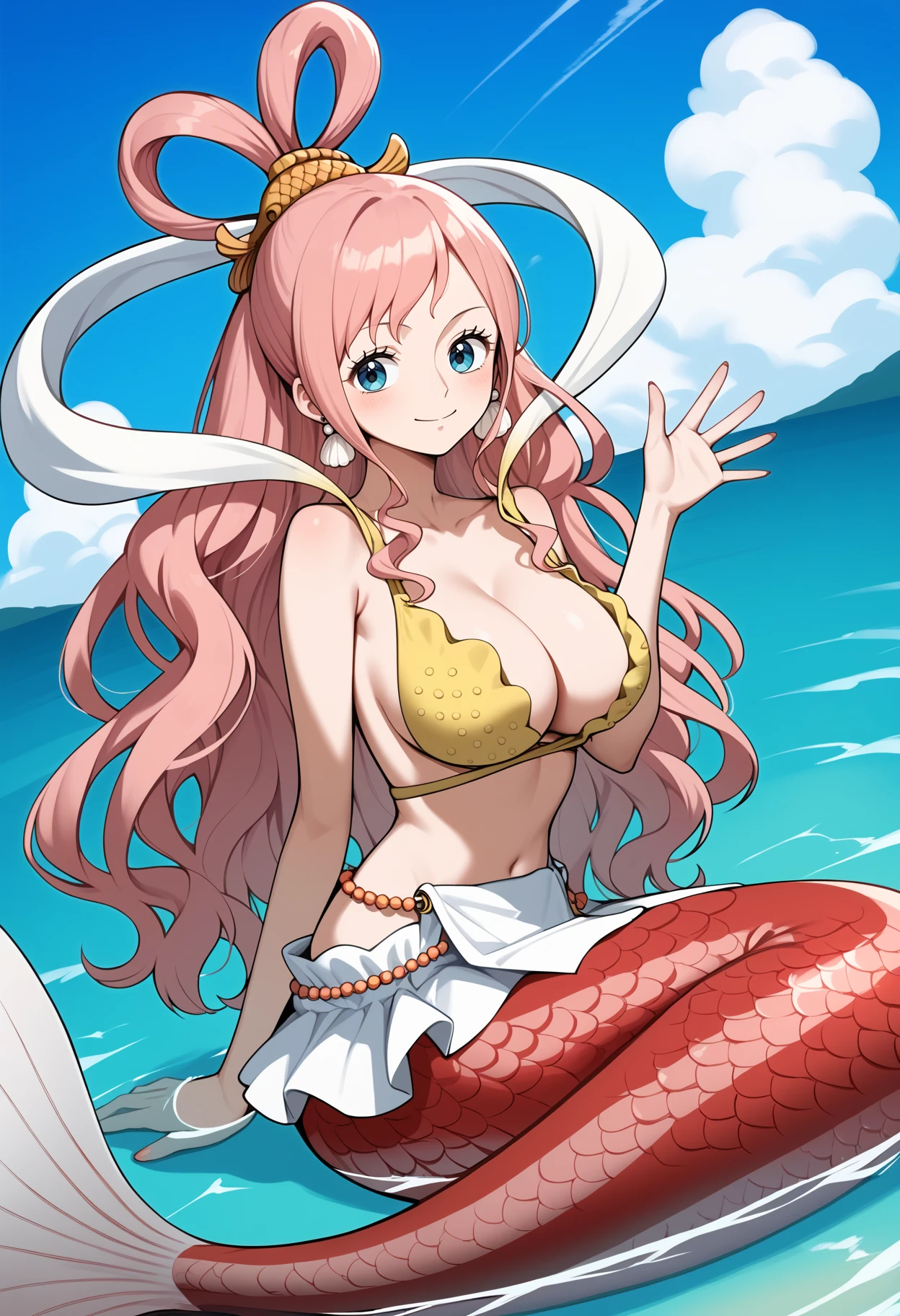 outfit1aashira, long hair, pink hair, hair rings, hair ornament, jewelry, earrings, blue eyes, large breasts, mermaid, cleavage, shawl, bikini top only, yellow bikini, beads, white skirt, pelvic curtain