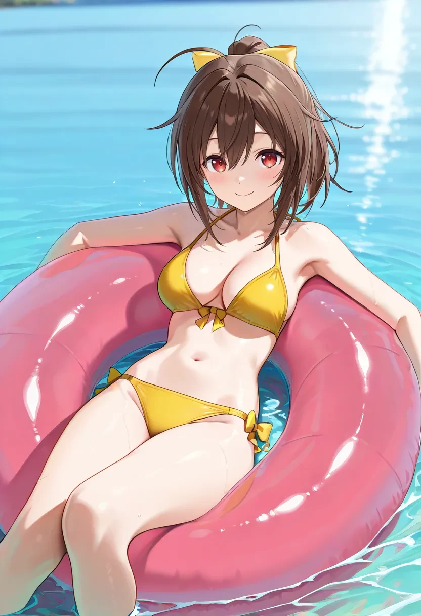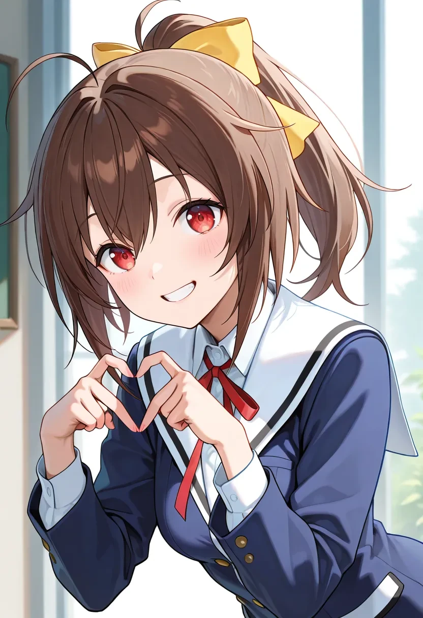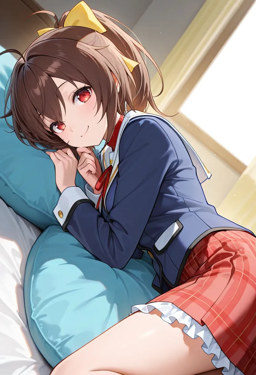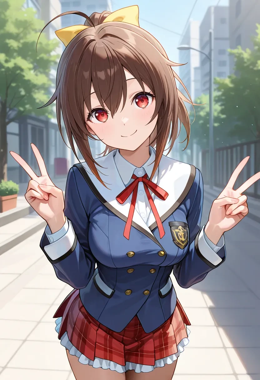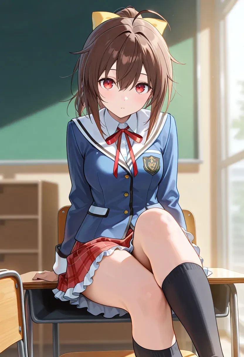 prompt : 1girl,solo,ao gennai,red eyes,brown hair,ponytail,ahoge,yellow bow,blue blazer,sailor collar, white collared shirt, plaid skirt,frilled skirt,red chest ribbon,black socks