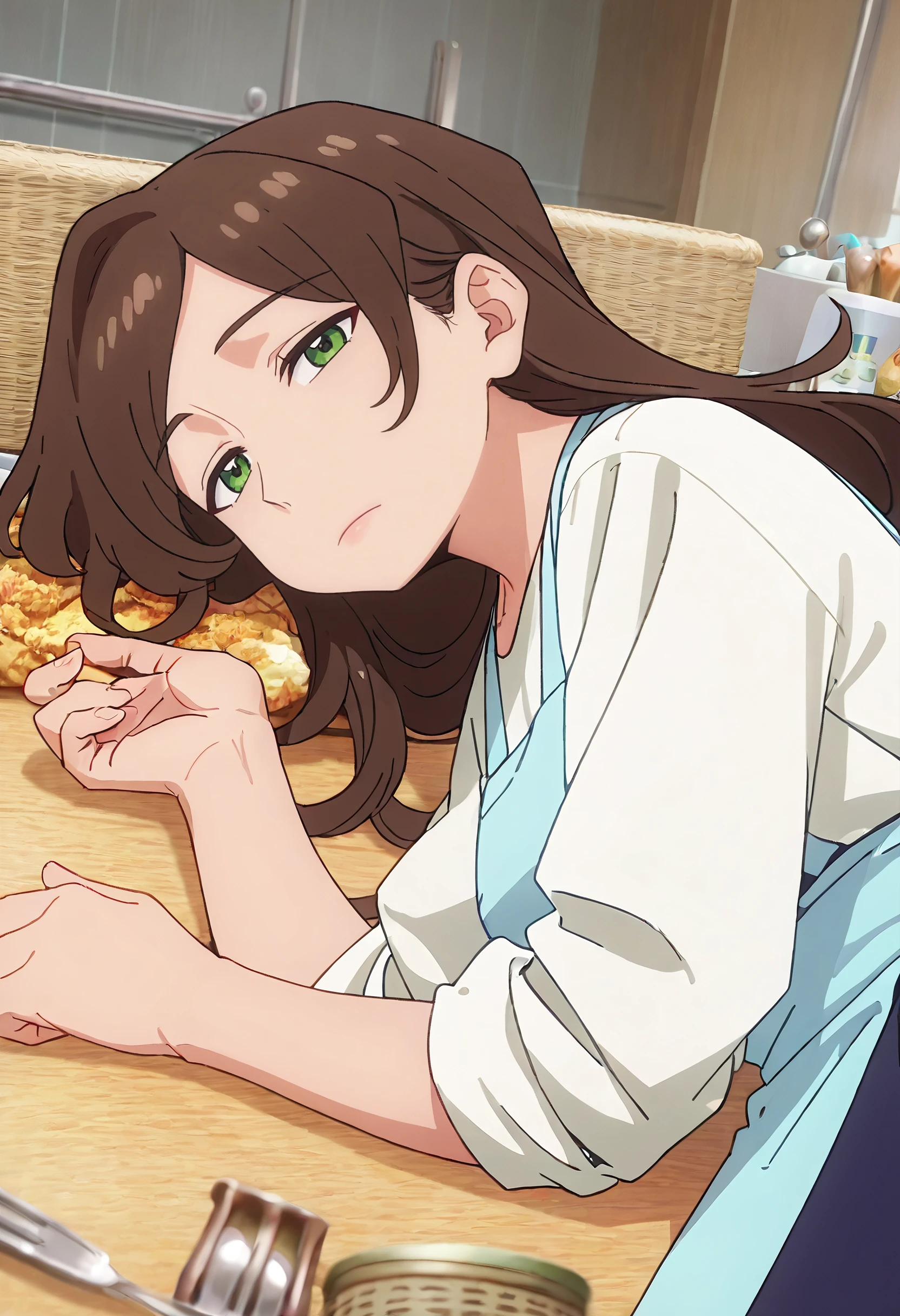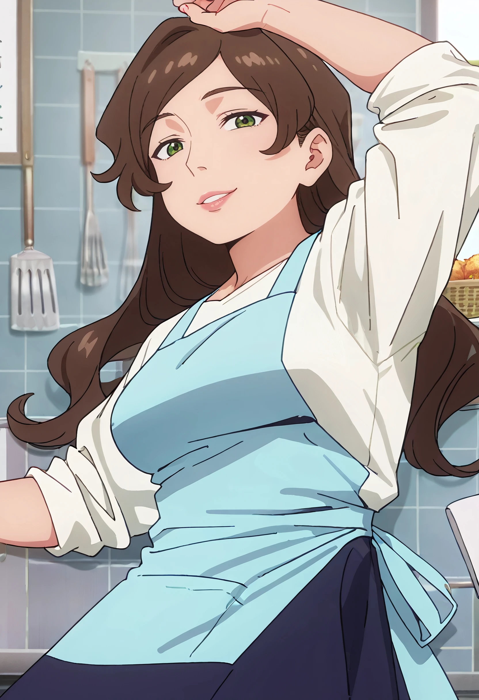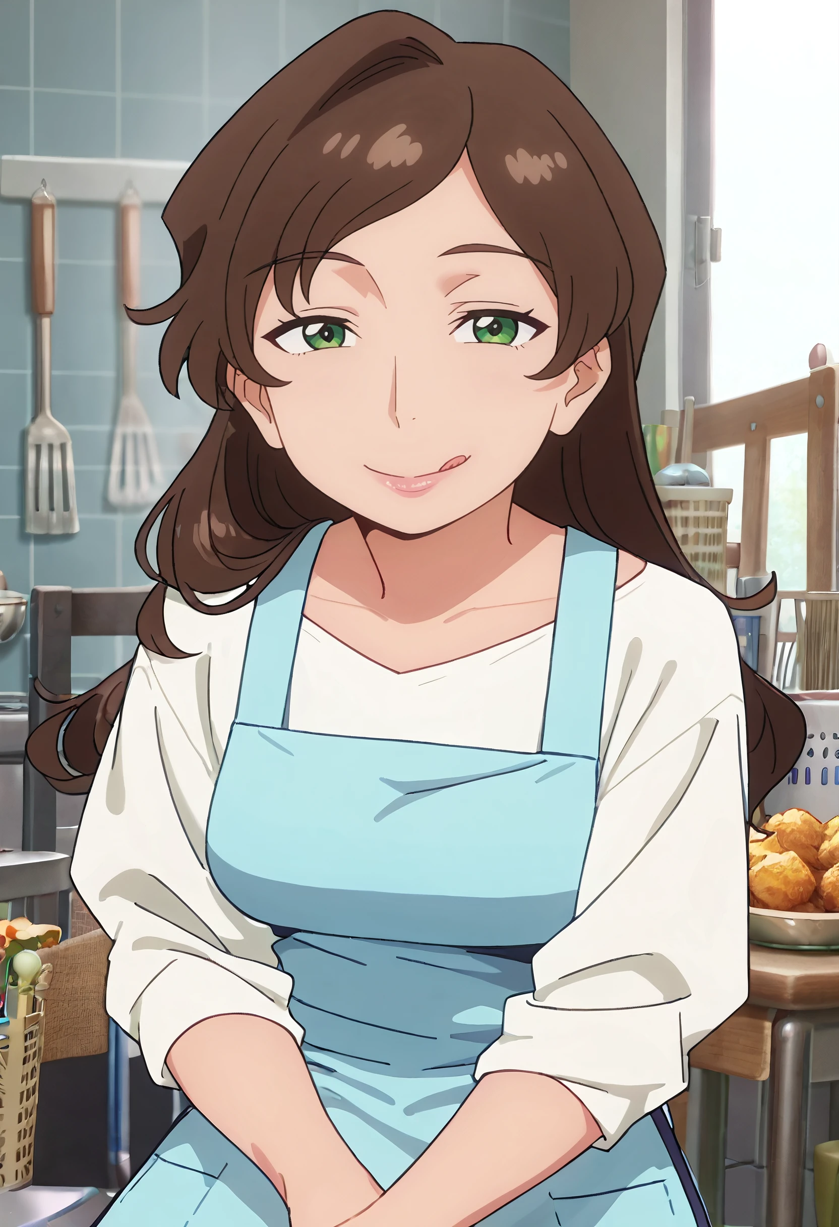 RurisOutfit, apron, blue apron, white shirt, housewife, blue skirt, sleeves pushed up, long sleeves, sleeves rolled up,