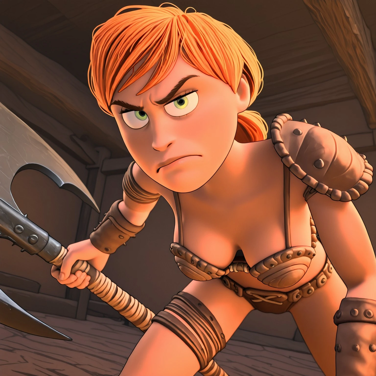 zandrartb, cartoon female with thin waist, green eyes, orange hair with short low ponytail, barbarian bikini armor, shoulder armor, thigh strap, boots