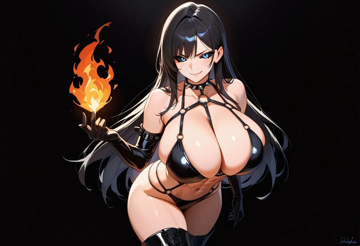 Shella, black hair, long hair, black sclera, blue eyes, hint of abs,