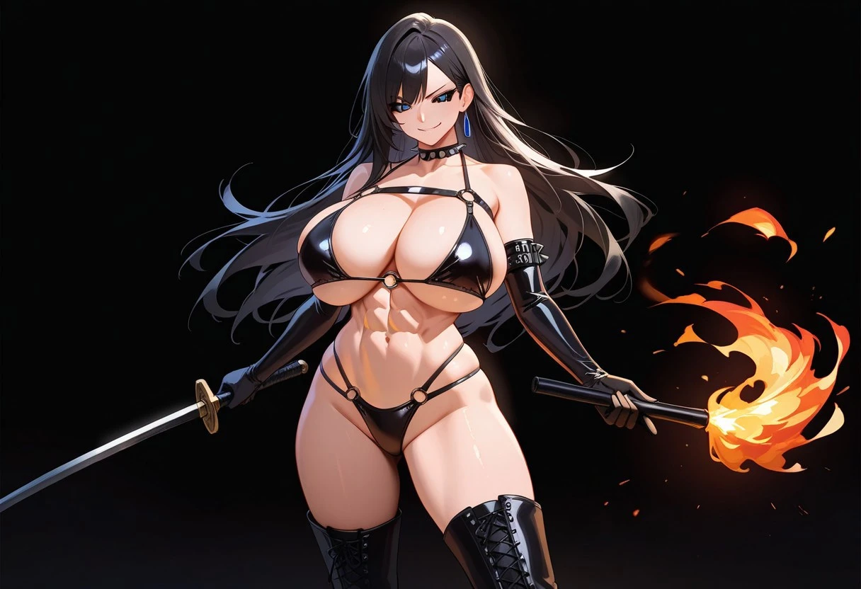 spiked choker, dominatrix, (black o-ring harness), (elbow gloves), (long gloves), (black thigh high boots), (black bikini),