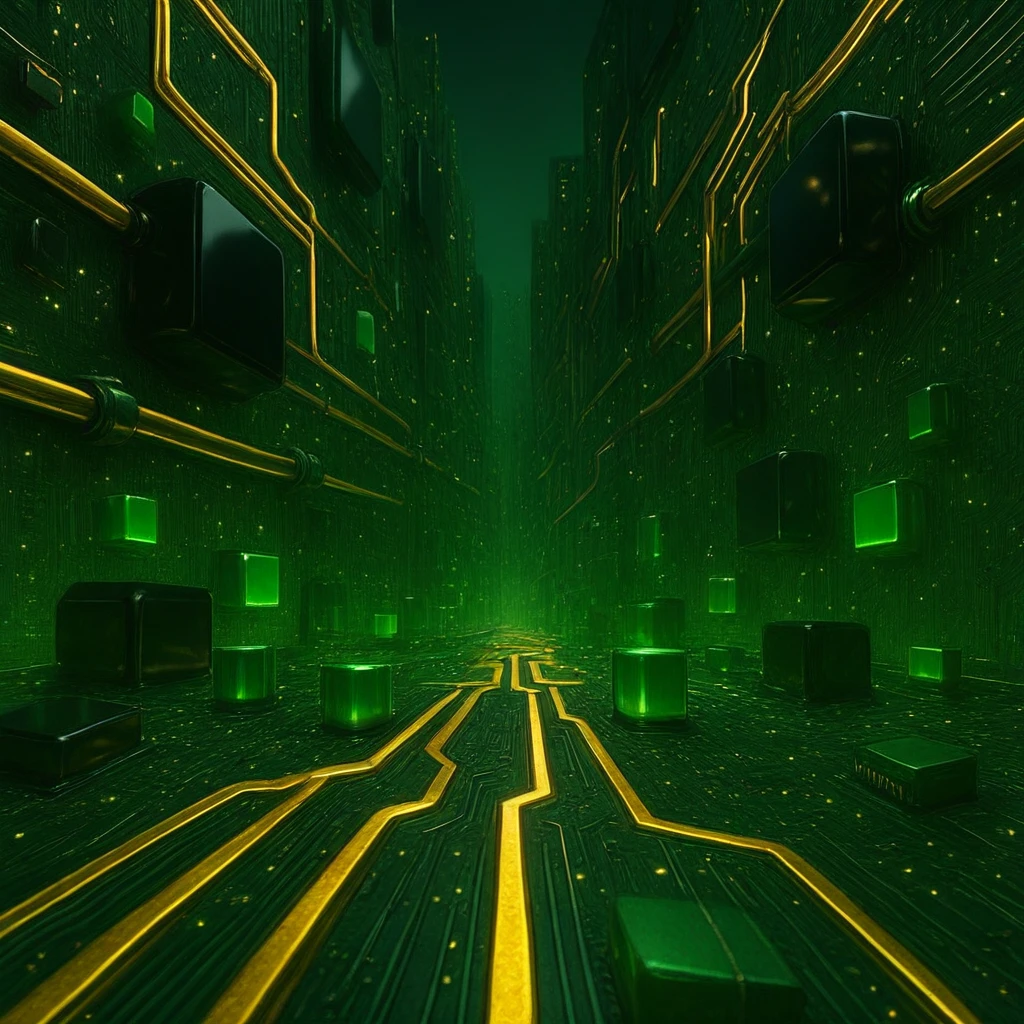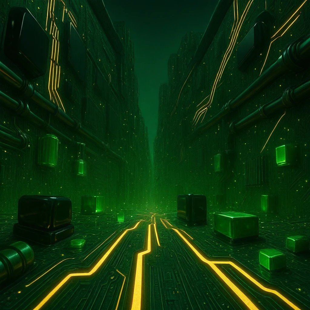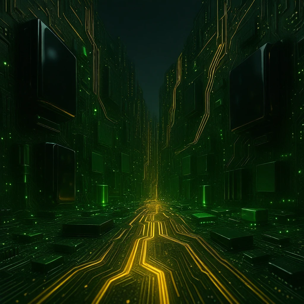 futuristic circuit board, green PCB environment, thick golden traces, glowing circuit lines, high-tech city, glossy black components, green capacitors, golden LEDs, green LEDs, cooling tubes, shiny metal tubes, massive architecture, symmetrical layout, bold geometry, metallic reflections, tech monoliths, cyber infrastructure, ultra high resolution, cinematic lighting, close-up detail, ground-level view, low angle, sci-fi environment, energy core, transparent tank, reactor structure, glowing liquid, embedded components, PCI cards, RAM blocks, CPU core, no miniature parts, oversized elements, heavy tech design, deep shadows, industrial elegance, layered surfaces, circuit etchings, futuristic texture, illuminated pathways, data highway