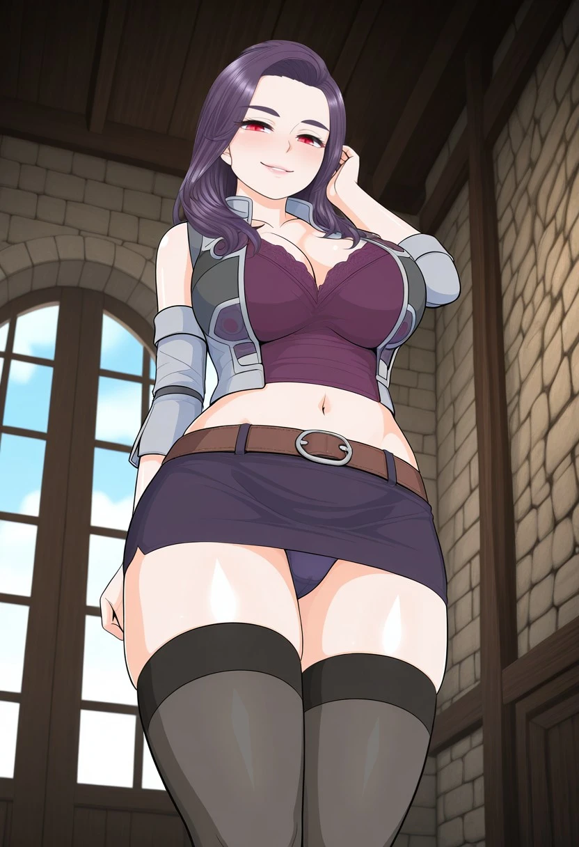 lucie, red eyes, huge breasts, mature female, middle parted hair, long hair, dark purple hair,