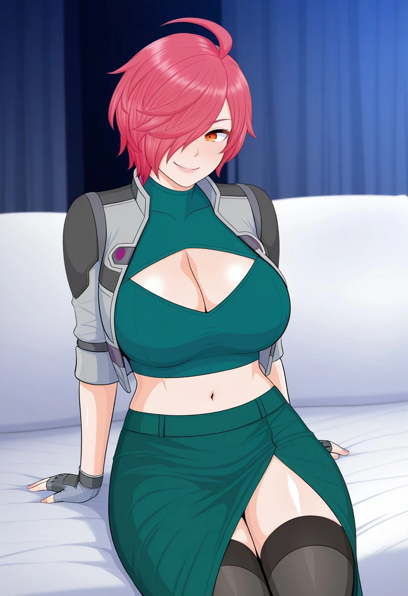 vanessa, short hair, hair over one eye, large breasts, pink hair, red hair,