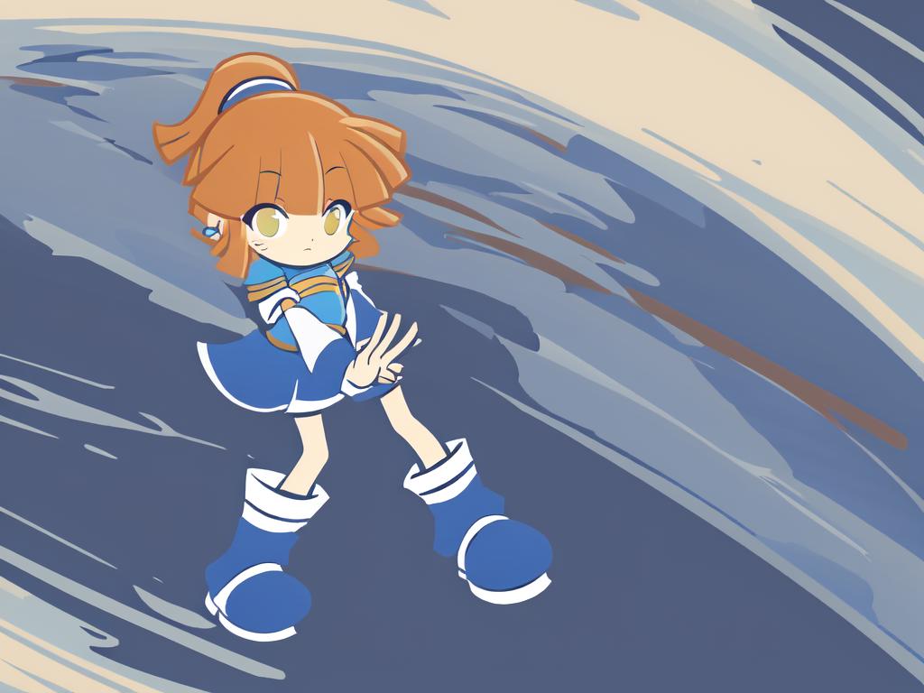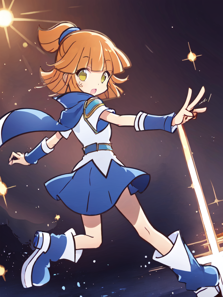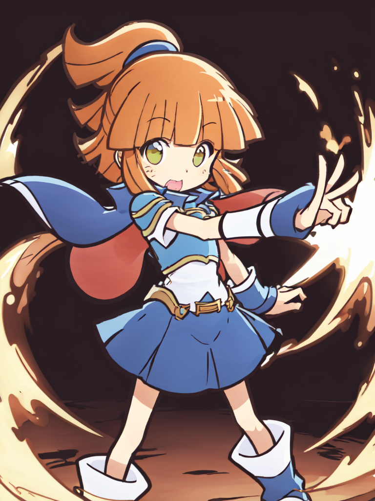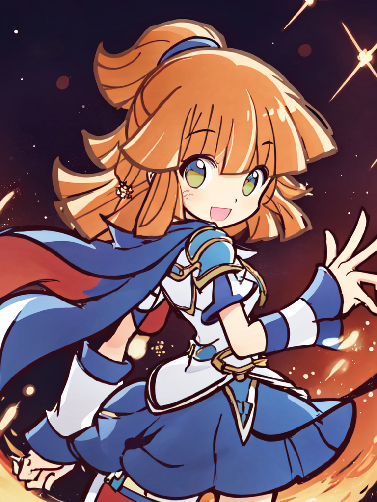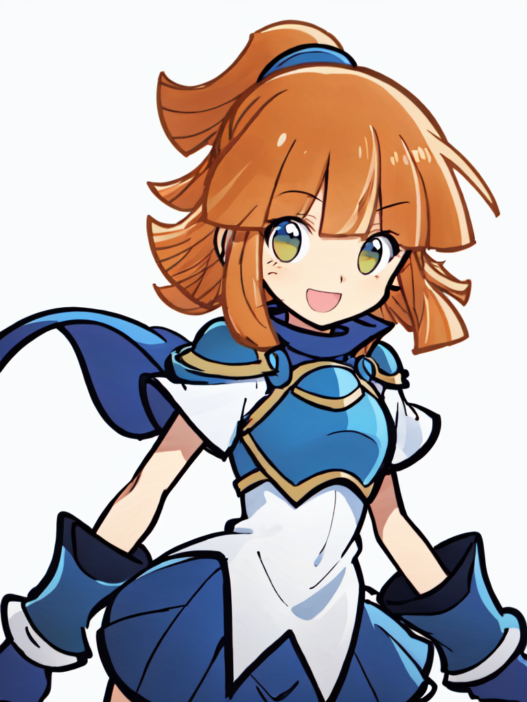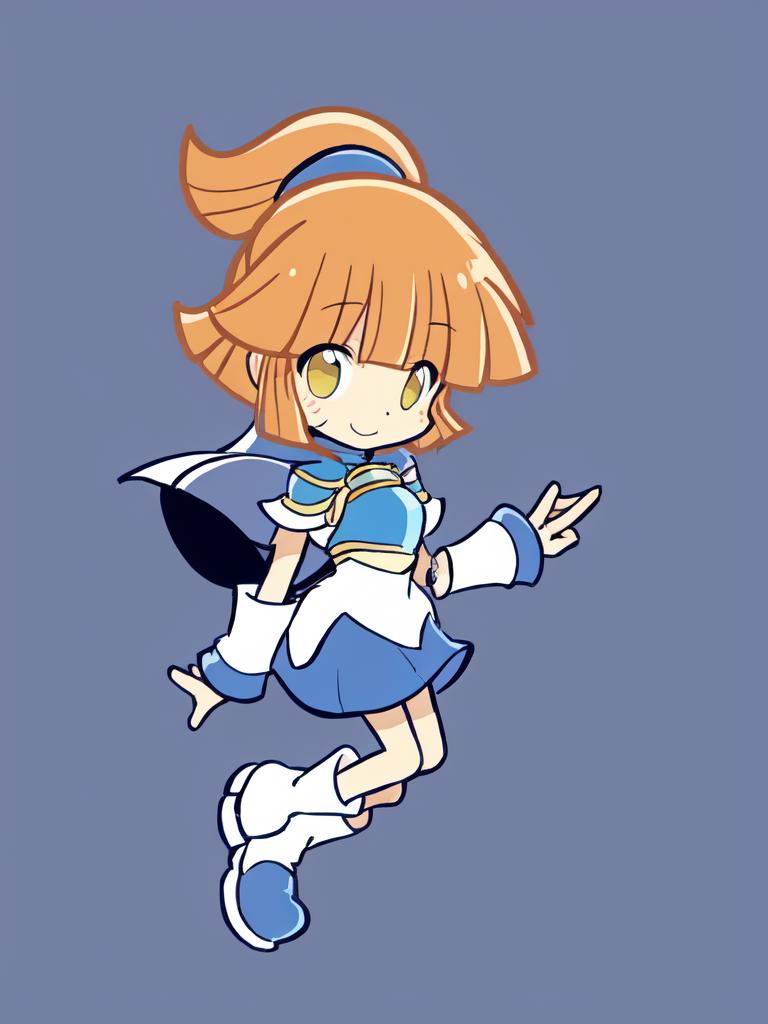 <lora:arle:0.7> arle nadja kawaii petit cute girl yellow eyes brown hair,half updo short topknot blue skirt, blue short sleeves, blue breast armor, white shirt, wrist cuffs blue capelet blue boots :> style parody
